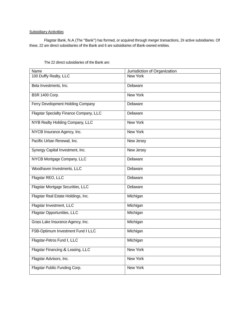 Subsidiary Activities these, 22 are direct subsidiaries of the Bank and 6 are subsidiaries of Bank-owned entities. Flagstar Bank, N.A (The “Bank”) has formed, or acquired through merger transactions, 28 active subsidiaries. Of The 22 direct subsidiaries of the Bank are: Name Jurisdiction of Organization 100 Duffy Realty, LLC New York Beta Investments, Inc. Delaware BSR 1400 Corp. New York Ferry Development Holding Company Delaware Flagstar Specialty Finance Company, LLC Delaware NYB Realty Holding Company, LLC New York NYCB Insurance Agency, Inc. New York Pacific Urban Renewal, Inc. New Jersey Synergy Capital Investment, Inc. New Jersey NYCB Mortgage Company, LLC Delaware Woodhaven Investments, LLC Delaware Flagstar REO, LLC Delaware Flagstar Mortgage Securities, LLC Delaware Flagstar Real Estate Holdings, Inc. Michigan Flagstar Investment, LLC Michigan Flagstar Opportunities, LLC Michigan Grass Lake Insurance Agency, Inc. Michigan FSB-Optimum Investment Fund I LLC Michigan Flagstar-Petros Fund I, LLC Michigan Flagstar Financing & Leasing, LLC New York Flagstar Advisors, Inc. New York Flagstar Public Funding Corp. New York