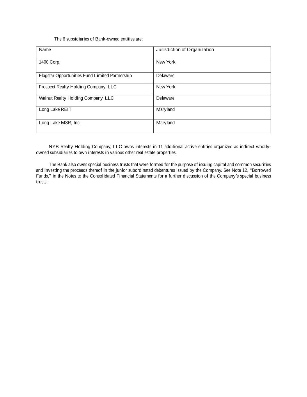 The 6 subsidiaries of Bank-owned entities are: Name Jurisdiction of Organization 1400 Corp. New York Flagstar Opportunities Fund Limited Partnership Delaware Prospect Realty Holding Company, LLC New York Walnut Realty Holding Company, LLC Delaware Long Lake REIT Maryland Long Lake MSR, Inc. Maryland NYB Realty Holding Company, LLC owns interests in 11 additional active entities organized as indirect wholly- owned subsidiaries to own interests in various other real estate properties. The Bank also owns special business trusts that were formed for the purpose of issuing capital and common securities and investing the proceeds thereof in the junior subordinated debentures issued by the Company. See Note 12, “Borrowed Funds,” in the Notes to the Consolidated Financial Statements for a further discussion of the Company’s special business trusts.