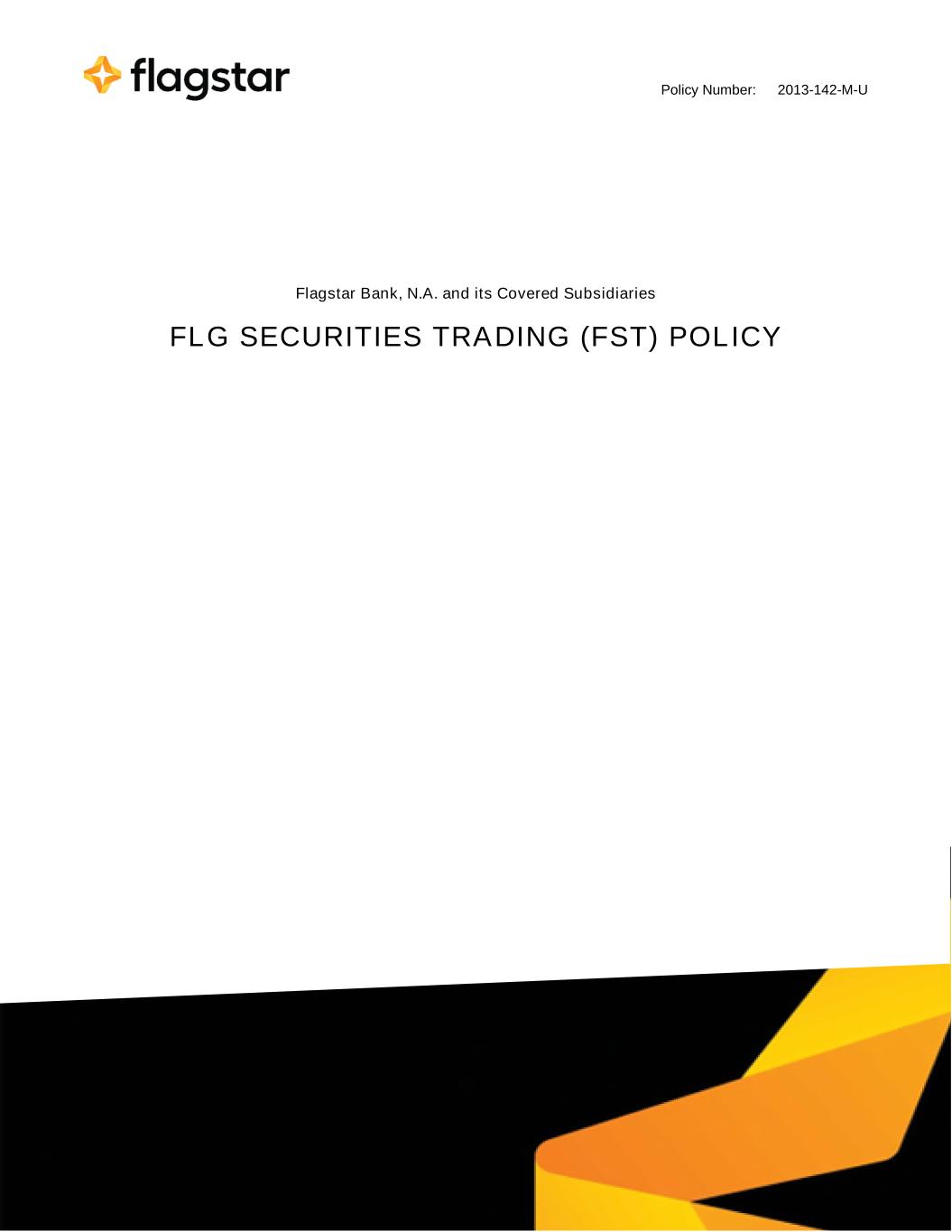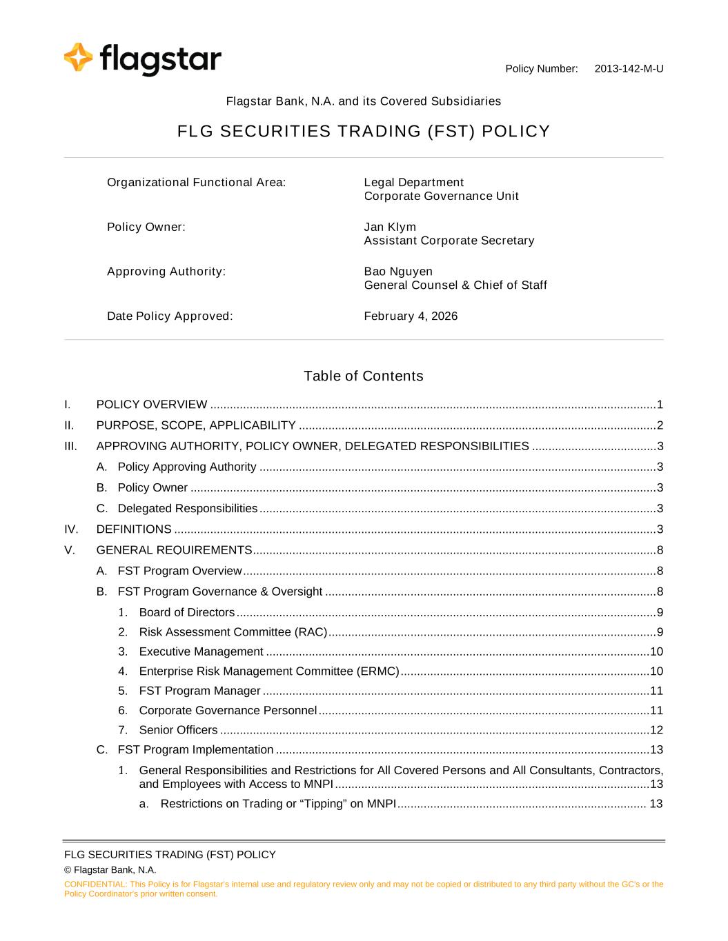 Policy Number: 2013-142-M-U FLG SECURITIES TRADING (FST) POLICY © Flagstar Bank, N.A. CONFIDENTIAL: This Policy is for Flagstar’s internal use and regulatory review only and may not be copied or distributed to any third party without the GC's or the Policy Coordinator’s prior written consent. Flagstar Bank, N.A. and its Covered Subsidiaries FLG SECURITIES TRADING (FST) POLICY Organizational Functional Area: Legal Department Corporate Governance Unit Policy Owner: Jan Klym Assistant Corporate Secretary Approving Authority: Bao Nguyen General Counsel & Chief of Staff Date Policy Approved: February 4, 2026 Table of Contents I. POLICY OVERVIEW ........................................................................................................................................ 1 II. PURPOSE, SCOPE, APPLICABILITY ............................................................................................................. 2 III. APPROVING AUTHORITY, POLICY OWNER, DELEGATED RESPONSIBILITIES ...................................... 3 A. Policy Approving Authority ......................................................................................................................... 3 B. Policy Owner .............................................................................................................................................. 3 C. Delegated Responsibilities ......................................................................................................................... 3 IV. DEFINITIONS ................................................................................................................................................... 3 V. GENERAL REQUIREMENTS ........................................................................................................................... 8 A. FST Program Overview .............................................................................................................................. 8 B. FST Program Governance & Oversight ..................................................................................................... 8 1. Board of Directors ................................................................................................................................ 9 2. Risk Assessment Committee (RAC) .................................................................................................... 9 3. Executive Management ..................................................................................................................... 10 4. Enterprise Risk Management Committee (ERMC) ............................................................................ 10 5. FST Program Manager ...................................................................................................................... 11 6. Corporate Governance Personnel ..................................................................................................... 11 7. Senior Officers ................................................................................................................................... 12 C. FST Program Implementation .................................................................................................................. 13 1. General Responsibilities and Restrictions for All Covered Persons and All Consultants, Contractors, and Employees with Access to MNPI ................................................................................................ 13 a. Restrictions on Trading or “Tipping” on MNPI ............................................................................ 13