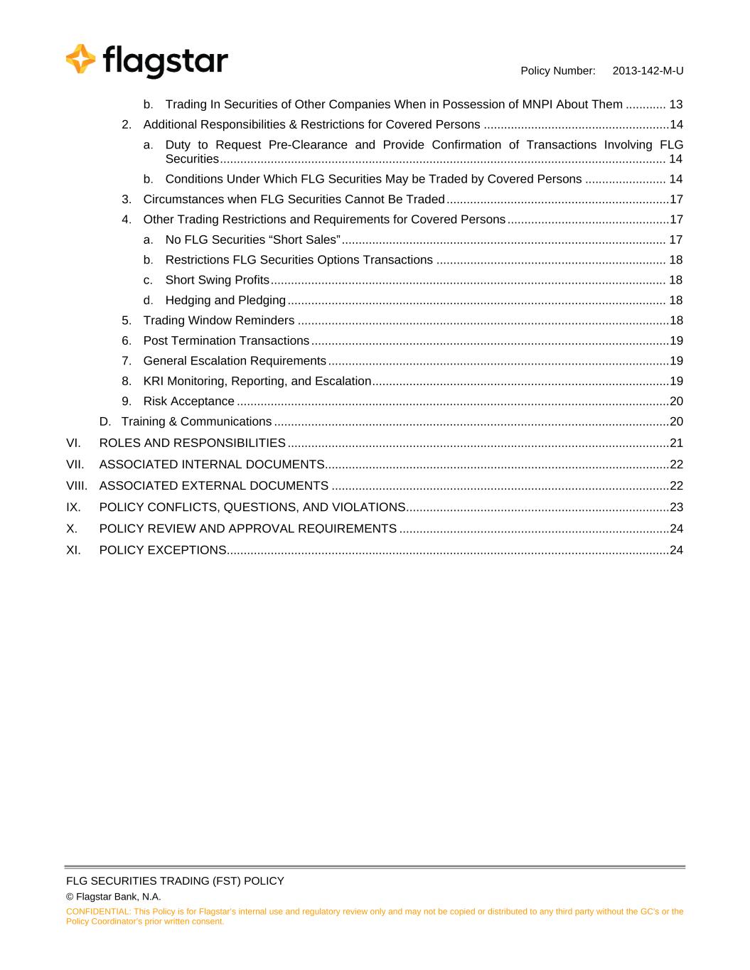 Policy Number: 2013-142-M-U FLG SECURITIES TRADING (FST) POLICY © Flagstar Bank, N.A. CONFIDENTIAL: This Policy is for Flagstar’s internal use and regulatory review only and may not be copied or distributed to any third party without the GC's or the Policy Coordinator’s prior written consent. b. Trading In Securities of Other Companies When in Possession of MNPI About Them ............ 13 2. Additional Responsibilities & Restrictions for Covered Persons ....................................................... 14 a. Duty to Request Pre-Clearance and Provide Confirmation of Transactions Involving FLG Securities .................................................................................................................................... 14 b. Conditions Under Which FLG Securities May be Traded by Covered Persons ........................ 14 3. Circumstances when FLG Securities Cannot Be Traded .................................................................. 17 4. Other Trading Restrictions and Requirements for Covered Persons ................................................ 17 a. No FLG Securities “Short Sales” ................................................................................................ 17 b. Restrictions FLG Securities Options Transactions .................................................................... 18 c. Short Swing Profits ..................................................................................................................... 18 d. Hedging and Pledging ................................................................................................................ 18 5. Trading Window Reminders .............................................................................................................. 18 6. Post Termination Transactions .......................................................................................................... 19 7. General Escalation Requirements ..................................................................................................... 19 8. KRI Monitoring, Reporting, and Escalation ........................................................................................ 19 9. Risk Acceptance ................................................................................................................................ 20 D. Training & Communications ..................................................................................................................... 20 VI. ROLES AND RESPONSIBILITIES ................................................................................................................. 21 VII. ASSOCIATED INTERNAL DOCUMENTS...................................................................................................... 22 VIII. ASSOCIATED EXTERNAL DOCUMENTS .................................................................................................... 22 IX. POLICY CONFLICTS, QUESTIONS, AND VIOLATIONS .............................................................................. 23 X. POLICY REVIEW AND APPROVAL REQUIREMENTS ................................................................................ 24 XI. POLICY EXCEPTIONS................................................................................................................................... 24