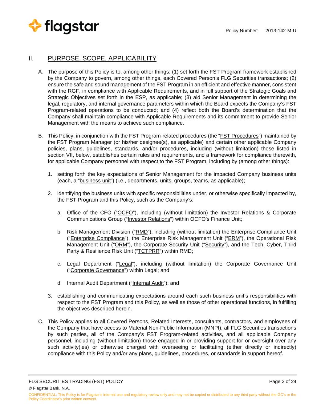 Policy Number: 2013-142-M-U FLG SECURITIES TRADING (FST) POLICY Page 2 of 24 © Flagstar Bank, N.A. CONFIDENTIAL: This Policy is for Flagstar’s internal use and regulatory review only and may not be copied or distributed to any third party without the GC's or the Policy Coordinator’s prior written consent. II. PURPOSE, SCOPE, APPLICABILITY A. The purpose of this Policy is to, among other things: (1) set forth the FST Program framework established by the Company to govern, among other things, each Covered Person’s FLG Securities transactions; (2) ensure the safe and sound management of the FST Program in an efficient and effective manner, consistent with the RGF, in compliance with Applicable Requirements, and in full support of the Strategic Goals and Strategic Objectives set forth in the ESP, as applicable; (3) aid Senior Management in determining the legal, regulatory, and internal governance parameters within which the Board expects the Company’s FST Program-related operations to be conducted; and (4) reflect both the Board’s determination that the Company shall maintain compliance with Applicable Requirements and its commitment to provide Senior Management with the means to achieve such compliance. B. This Policy, in conjunction with the FST Program-related procedures (the “FST Procedures”) maintained by the FST Program Manager (or his/her designee(s), as applicable) and certain other applicable Company policies, plans, guidelines, standards, and/or procedures, including (without limitation) those listed in section VII, below, establishes certain rules and requirements, and a framework for compliance therewith, for applicable Company personnel with respect to the FST Program, including by (among other things): 1. setting forth the key expectations of Senior Management for the impacted Company business units (each, a “business unit”) (i.e., departments, units, groups, teams, as applicable); 2. identifying the business units with specific responsibilities under, or otherwise specifically impacted by, the FST Program and this Policy, such as the Company’s: a. Office of the CFO (“OCFO”), including (without limitation) the Investor Relations & Corporate Communications Group (“Investor Relations”) within OCFO’s Finance Unit; b. Risk Management Division (“RMD”), including (without limitation) the Enterprise Compliance Unit (“Enterprise Compliance”), the Enterprise Risk Management Unit (“ERM”), the Operational Risk Management Unit (“ORM”), the Corporate Security Unit (“Security”), and the Tech, Cyber, Third Party & Resilience Risk Unit (“TCTPRR”) within RMD; c. Legal Department (“Legal”), including (without limitation) the Corporate Governance Unit (“Corporate Governance”) within Legal; and d. Internal Audit Department (“Internal Audit”); and 3. establishing and communicating expectations around each such business unit’s responsibilities with respect to the FST Program and this Policy, as well as those of other operational functions, in fulfilling the objectives described herein. C. This Policy applies to all Covered Persons, Related Interests, consultants, contractors, and employees of the Company that have access to Material Non-Public Information (MNPI), all FLG Securities transactions by such parties, all of the Company’s FST Program-related activities, and all applicable Company personnel, including (without limitation) those engaged in or providing support for or oversight over any such activity(ies) or otherwise charged with overseeing or facilitating (either directly or indirectly) compliance with this Policy and/or any plans, guidelines, procedures, or standards in support hereof.