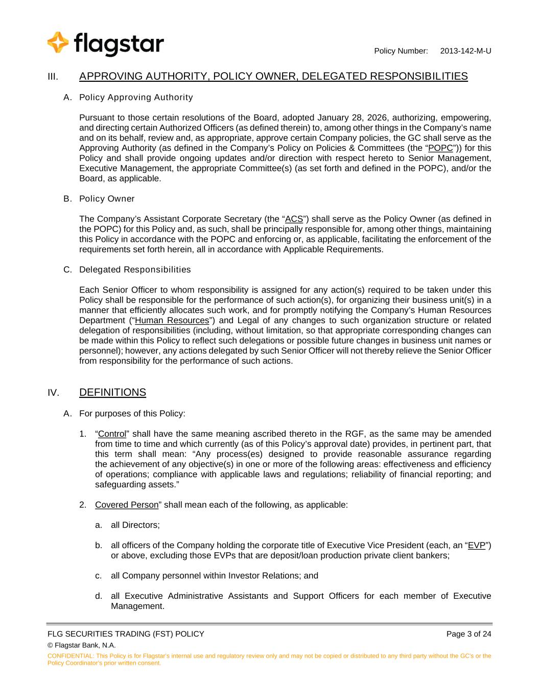 Policy Number: 2013-142-M-U FLG SECURITIES TRADING (FST) POLICY Page 3 of 24 © Flagstar Bank, N.A. CONFIDENTIAL: This Policy is for Flagstar’s internal use and regulatory review only and may not be copied or distributed to any third party without the GC's or the Policy Coordinator’s prior written consent. III. APPROVING AUTHORITY, POLICY OWNER, DELEGATED RESPONSIBILITIES A. Policy Approving Authority Pursuant to those certain resolutions of the Board, adopted January 28, 2026, authorizing, empowering, and directing certain Authorized Officers (as defined therein) to, among other things in the Company’s name and on its behalf, review and, as appropriate, approve certain Company policies, the GC shall serve as the Approving Authority (as defined in the Company’s Policy on Policies & Committees (the “POPC”)) for this Policy and shall provide ongoing updates and/or direction with respect hereto to Senior Management, Executive Management, the appropriate Committee(s) (as set forth and defined in the POPC), and/or the Board, as applicable. B. Policy Owner The Company’s Assistant Corporate Secretary (the “ACS”) shall serve as the Policy Owner (as defined in the POPC) for this Policy and, as such, shall be principally responsible for, among other things, maintaining this Policy in accordance with the POPC and enforcing or, as applicable, facilitating the enforcement of the requirements set forth herein, all in accordance with Applicable Requirements. C. Delegated Responsibilities Each Senior Officer to whom responsibility is assigned for any action(s) required to be taken under this Policy shall be responsible for the performance of such action(s), for organizing their business unit(s) in a manner that efficiently allocates such work, and for promptly notifying the Company’s Human Resources Department (“Human Resources”) and Legal of any changes to such organization structure or related delegation of responsibilities (including, without limitation, so that appropriate corresponding changes can be made within this Policy to reflect such delegations or possible future changes in business unit names or personnel); however, any actions delegated by such Senior Officer will not thereby relieve the Senior Officer from responsibility for the performance of such actions. IV. DEFINITIONS A. For purposes of this Policy: 1. “Control” shall have the same meaning ascribed thereto in the RGF, as the same may be amended from time to time and which currently (as of this Policy’s approval date) provides, in pertinent part, that this term shall mean: “Any process(es) designed to provide reasonable assurance regarding the achievement of any objective(s) in one or more of the following areas: effectiveness and efficiency of operations; compliance with applicable laws and regulations; reliability of financial reporting; and safeguarding assets.” 2. Covered Person” shall mean each of the following, as applicable: a. all Directors; b. all officers of the Company holding the corporate title of Executive Vice President (each, an “EVP”) or above, excluding those EVPs that are deposit/loan production private client bankers; c. all Company personnel within Investor Relations; and d. all Executive Administrative Assistants and Support Officers for each member of Executive Management.