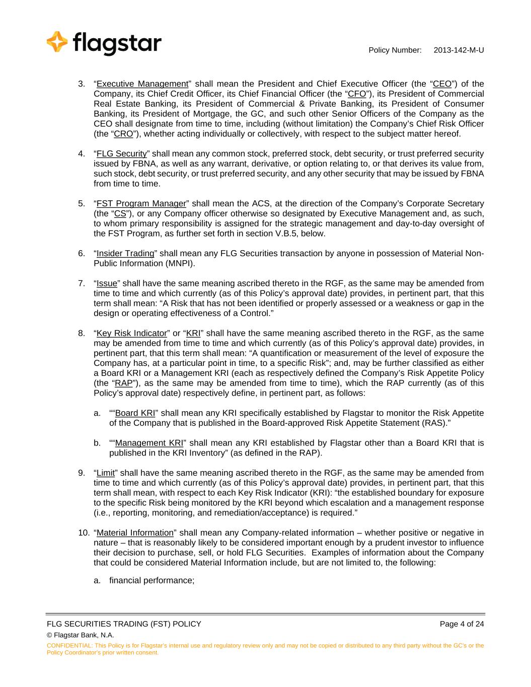 Policy Number: 2013-142-M-U FLG SECURITIES TRADING (FST) POLICY Page 4 of 24 © Flagstar Bank, N.A. CONFIDENTIAL: This Policy is for Flagstar’s internal use and regulatory review only and may not be copied or distributed to any third party without the GC's or the Policy Coordinator’s prior written consent. 3. “Executive Management” shall mean the President and Chief Executive Officer (the “CEO”) of the Company, its Chief Credit Officer, its Chief Financial Officer (the “CFO”), its President of Commercial Real Estate Banking, its President of Commercial & Private Banking, its President of Consumer Banking, its President of Mortgage, the GC, and such other Senior Officers of the Company as the CEO shall designate from time to time, including (without limitation) the Company’s Chief Risk Officer (the “CRO”), whether acting individually or collectively, with respect to the subject matter hereof. 4. “FLG Security” shall mean any common stock, preferred stock, debt security, or trust preferred security issued by FBNA, as well as any warrant, derivative, or option relating to, or that derives its value from, such stock, debt security, or trust preferred security, and any other security that may be issued by FBNA from time to time. 5. “FST Program Manager” shall mean the ACS, at the direction of the Company’s Corporate Secretary (the “CS”), or any Company officer otherwise so designated by Executive Management and, as such, to whom primary responsibility is assigned for the strategic management and day-to-day oversight of the FST Program, as further set forth in section V.B.5, below. 6. “Insider Trading” shall mean any FLG Securities transaction by anyone in possession of Material Non- Public Information (MNPI). 7. “Issue” shall have the same meaning ascribed thereto in the RGF, as the same may be amended from time to time and which currently (as of this Policy’s approval date) provides, in pertinent part, that this term shall mean: “A Risk that has not been identified or properly assessed or a weakness or gap in the design or operating effectiveness of a Control.” 8. “Key Risk Indicator” or “KRI” shall have the same meaning ascribed thereto in the RGF, as the same may be amended from time to time and which currently (as of this Policy’s approval date) provides, in pertinent part, that this term shall mean: “A quantification or measurement of the level of exposure the Company has, at a particular point in time, to a specific Risk”; and, may be further classified as either a Board KRI or a Management KRI (each as respectively defined the Company’s Risk Appetite Policy (the “RAP”), as the same may be amended from time to time), which the RAP currently (as of this Policy’s approval date) respectively define, in pertinent part, as follows: a. ““Board KRI” shall mean any KRI specifically established by Flagstar to monitor the Risk Appetite of the Company that is published in the Board-approved Risk Appetite Statement (RAS).” b. ““Management KRI” shall mean any KRI established by Flagstar other than a Board KRI that is published in the KRI Inventory” (as defined in the RAP). 9. “Limit” shall have the same meaning ascribed thereto in the RGF, as the same may be amended from time to time and which currently (as of this Policy’s approval date) provides, in pertinent part, that this term shall mean, with respect to each Key Risk Indicator (KRI): “the established boundary for exposure to the specific Risk being monitored by the KRI beyond which escalation and a management response (i.e., reporting, monitoring, and remediation/acceptance) is required.” 10. “Material Information” shall mean any Company-related information – whether positive or negative in nature – that is reasonably likely to be considered important enough by a prudent investor to influence their decision to purchase, sell, or hold FLG Securities. Examples of information about the Company that could be considered Material Information include, but are not limited to, the following: a. financial performance;