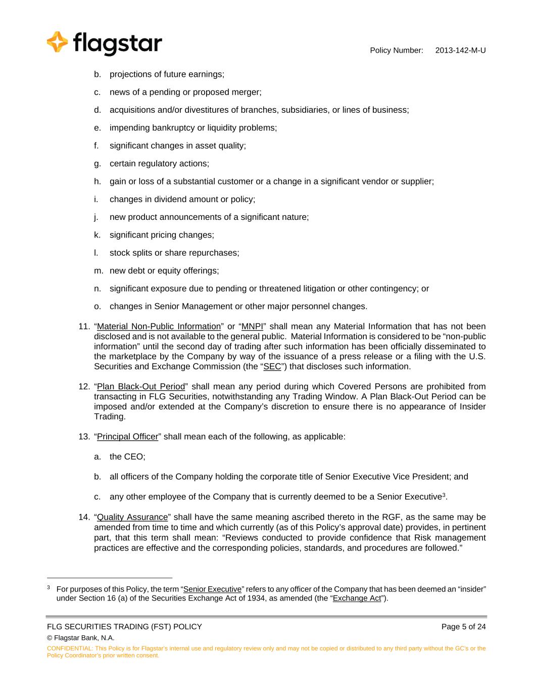 Policy Number: 2013-142-M-U FLG SECURITIES TRADING (FST) POLICY Page 5 of 24 © Flagstar Bank, N.A. CONFIDENTIAL: This Policy is for Flagstar’s internal use and regulatory review only and may not be copied or distributed to any third party without the GC's or the Policy Coordinator’s prior written consent. b. projections of future earnings; c. news of a pending or proposed merger; d. acquisitions and/or divestitures of branches, subsidiaries, or lines of business; e. impending bankruptcy or liquidity problems; f. significant changes in asset quality; g. certain regulatory actions; h. gain or loss of a substantial customer or a change in a significant vendor or supplier; i. changes in dividend amount or policy; j. new product announcements of a significant nature; k. significant pricing changes; l. stock splits or share repurchases; m. new debt or equity offerings; n. significant exposure due to pending or threatened litigation or other contingency; or o. changes in Senior Management or other major personnel changes. 11. “Material Non-Public Information” or “MNPI” shall mean any Material Information that has not been disclosed and is not available to the general public. Material Information is considered to be “non-public information” until the second day of trading after such information has been officially disseminated to the marketplace by the Company by way of the issuance of a press release or a filing with the U.S. Securities and Exchange Commission (the “SEC”) that discloses such information. 12. “Plan Black-Out Period” shall mean any period during which Covered Persons are prohibited from transacting in FLG Securities, notwithstanding any Trading Window. A Plan Black-Out Period can be imposed and/or extended at the Company’s discretion to ensure there is no appearance of Insider Trading. 13. “Principal Officer” shall mean each of the following, as applicable: a. the CEO; b. all officers of the Company holding the corporate title of Senior Executive Vice President; and c. any other employee of the Company that is currently deemed to be a Senior Executive3. 14. “Quality Assurance” shall have the same meaning ascribed thereto in the RGF, as the same may be amended from time to time and which currently (as of this Policy’s approval date) provides, in pertinent part, that this term shall mean: “Reviews conducted to provide confidence that Risk management practices are effective and the corresponding policies, standards, and procedures are followed.” 3 For purposes of this Policy, the term “Senior Executive” refers to any officer of the Company that has been deemed an “insider” under Section 16 (a) of the Securities Exchange Act of 1934, as amended (the “Exchange Act”).