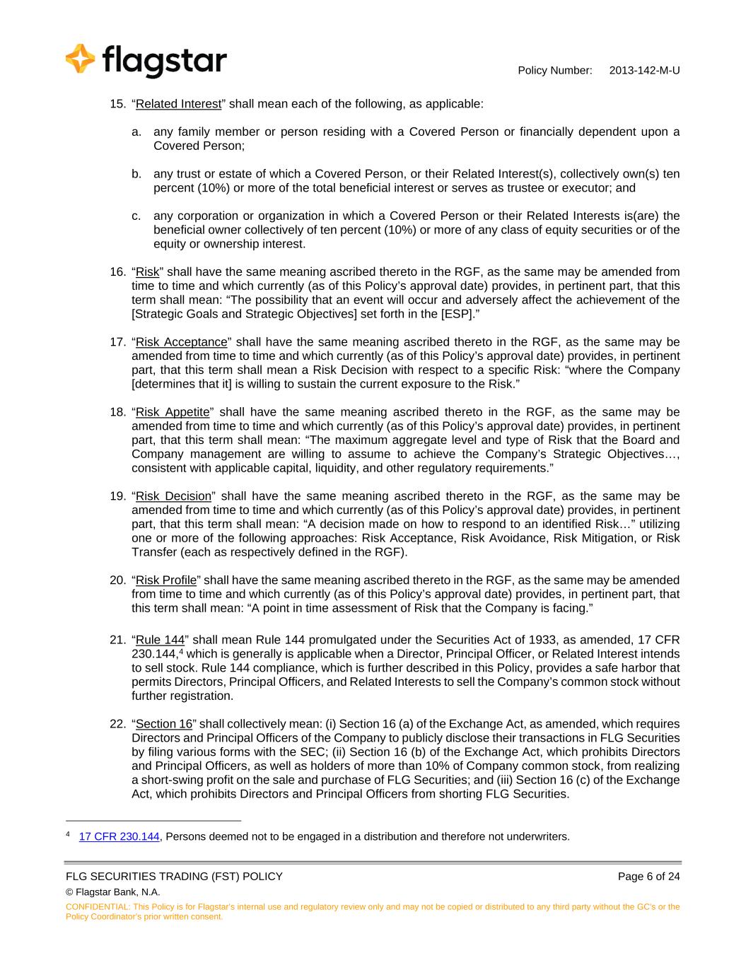 Policy Number: 2013-142-M-U FLG SECURITIES TRADING (FST) POLICY Page 6 of 24 © Flagstar Bank, N.A. CONFIDENTIAL: This Policy is for Flagstar’s internal use and regulatory review only and may not be copied or distributed to any third party without the GC's or the Policy Coordinator’s prior written consent. 15. “Related Interest” shall mean each of the following, as applicable: a. any family member or person residing with a Covered Person or financially dependent upon a Covered Person; b. any trust or estate of which a Covered Person, or their Related Interest(s), collectively own(s) ten percent (10%) or more of the total beneficial interest or serves as trustee or executor; and c. any corporation or organization in which a Covered Person or their Related Interests is(are) the beneficial owner collectively of ten percent (10%) or more of any class of equity securities or of the equity or ownership interest. 16. “Risk” shall have the same meaning ascribed thereto in the RGF, as the same may be amended from time to time and which currently (as of this Policy’s approval date) provides, in pertinent part, that this term shall mean: “The possibility that an event will occur and adversely affect the achievement of the [Strategic Goals and Strategic Objectives] set forth in the [ESP].” 17. “Risk Acceptance” shall have the same meaning ascribed thereto in the RGF, as the same may be amended from time to time and which currently (as of this Policy’s approval date) provides, in pertinent part, that this term shall mean a Risk Decision with respect to a specific Risk: “where the Company [determines that it] is willing to sustain the current exposure to the Risk.” 18. “Risk Appetite” shall have the same meaning ascribed thereto in the RGF, as the same may be amended from time to time and which currently (as of this Policy’s approval date) provides, in pertinent part, that this term shall mean: “The maximum aggregate level and type of Risk that the Board and Company management are willing to assume to achieve the Company’s Strategic Objectives…, consistent with applicable capital, liquidity, and other regulatory requirements.” 19. “Risk Decision” shall have the same meaning ascribed thereto in the RGF, as the same may be amended from time to time and which currently (as of this Policy’s approval date) provides, in pertinent part, that this term shall mean: “A decision made on how to respond to an identified Risk…” utilizing one or more of the following approaches: Risk Acceptance, Risk Avoidance, Risk Mitigation, or Risk Transfer (each as respectively defined in the RGF). 20. “Risk Profile” shall have the same meaning ascribed thereto in the RGF, as the same may be amended from time to time and which currently (as of this Policy’s approval date) provides, in pertinent part, that this term shall mean: “A point in time assessment of Risk that the Company is facing.” 21. “Rule 144” shall mean Rule 144 promulgated under the Securities Act of 1933, as amended, 17 CFR 230.144,4 which is generally is applicable when a Director, Principal Officer, or Related Interest intends to sell stock. Rule 144 compliance, which is further described in this Policy, provides a safe harbor that permits Directors, Principal Officers, and Related Interests to sell the Company’s common stock without further registration. 22. “Section 16” shall collectively mean: (i) Section 16 (a) of the Exchange Act, as amended, which requires Directors and Principal Officers of the Company to publicly disclose their transactions in FLG Securities by filing various forms with the SEC; (ii) Section 16 (b) of the Exchange Act, which prohibits Directors and Principal Officers, as well as holders of more than 10% of Company common stock, from realizing a short-swing profit on the sale and purchase of FLG Securities; and (iii) Section 16 (c) of the Exchange Act, which prohibits Directors and Principal Officers from shorting FLG Securities. 4 17 CFR 230.144, Persons deemed not to be engaged in a distribution and therefore not underwriters.