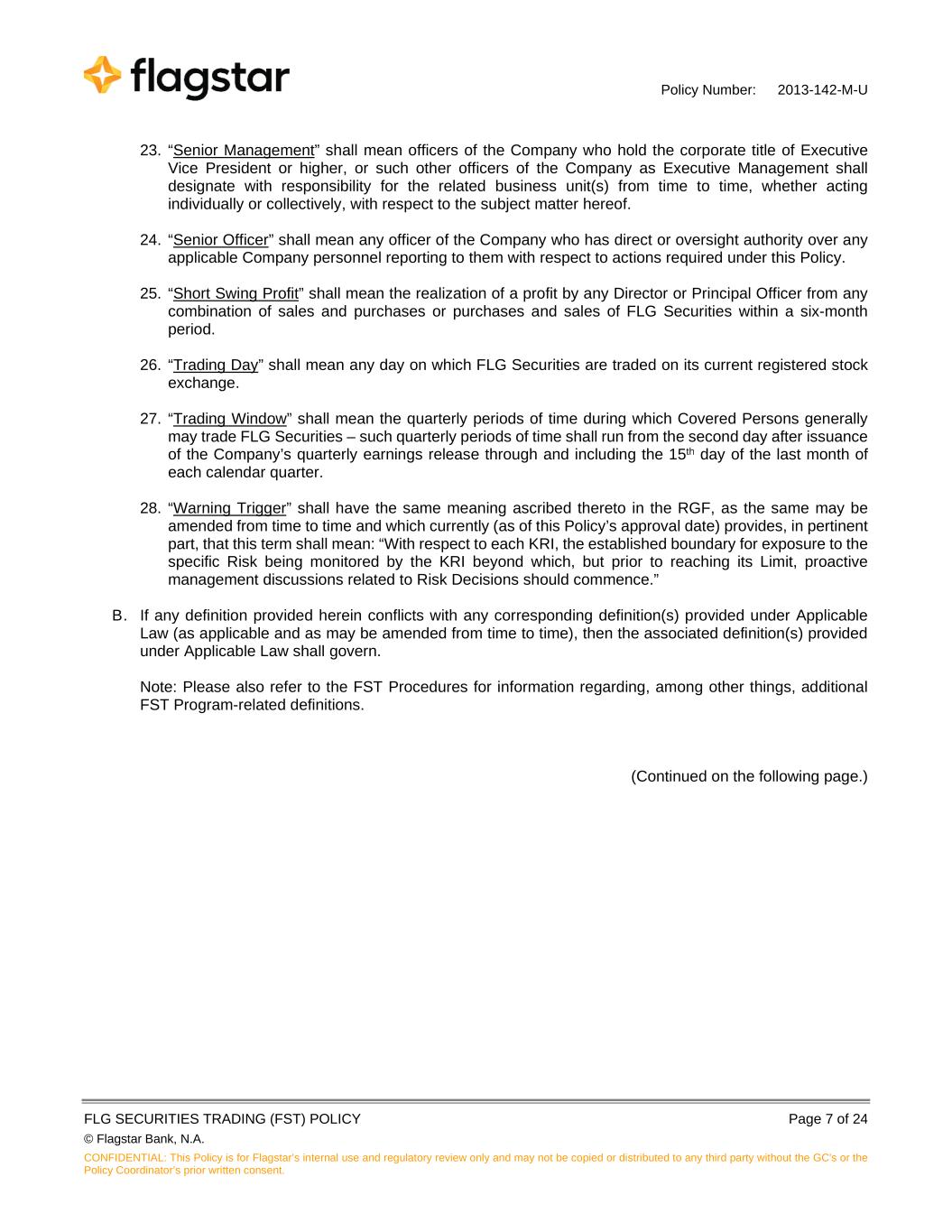 Policy Number: 2013-142-M-U FLG SECURITIES TRADING (FST) POLICY Page 7 of 24 © Flagstar Bank, N.A. CONFIDENTIAL: This Policy is for Flagstar’s internal use and regulatory review only and may not be copied or distributed to any third party without the GC's or the Policy Coordinator’s prior written consent. 23. “Senior Management” shall mean officers of the Company who hold the corporate title of Executive Vice President or higher, or such other officers of the Company as Executive Management shall designate with responsibility for the related business unit(s) from time to time, whether acting individually or collectively, with respect to the subject matter hereof. 24. “Senior Officer” shall mean any officer of the Company who has direct or oversight authority over any applicable Company personnel reporting to them with respect to actions required under this Policy. 25. “Short Swing Profit” shall mean the realization of a profit by any Director or Principal Officer from any combination of sales and purchases or purchases and sales of FLG Securities within a six-month period. 26. “Trading Day” shall mean any day on which FLG Securities are traded on its current registered stock exchange. 27. “Trading Window” shall mean the quarterly periods of time during which Covered Persons generally may trade FLG Securities – such quarterly periods of time shall run from the second day after issuance of the Company’s quarterly earnings release through and including the 15th day of the last month of each calendar quarter. 28. “Warning Trigger” shall have the same meaning ascribed thereto in the RGF, as the same may be amended from time to time and which currently (as of this Policy’s approval date) provides, in pertinent part, that this term shall mean: “With respect to each KRI, the established boundary for exposure to the specific Risk being monitored by the KRI beyond which, but prior to reaching its Limit, proactive management discussions related to Risk Decisions should commence.” B. If any definition provided herein conflicts with any corresponding definition(s) provided under Applicable Law (as applicable and as may be amended from time to time), then the associated definition(s) provided under Applicable Law shall govern. Note: Please also refer to the FST Procedures for information regarding, among other things, additional FST Program-related definitions. (Continued on the following page.)