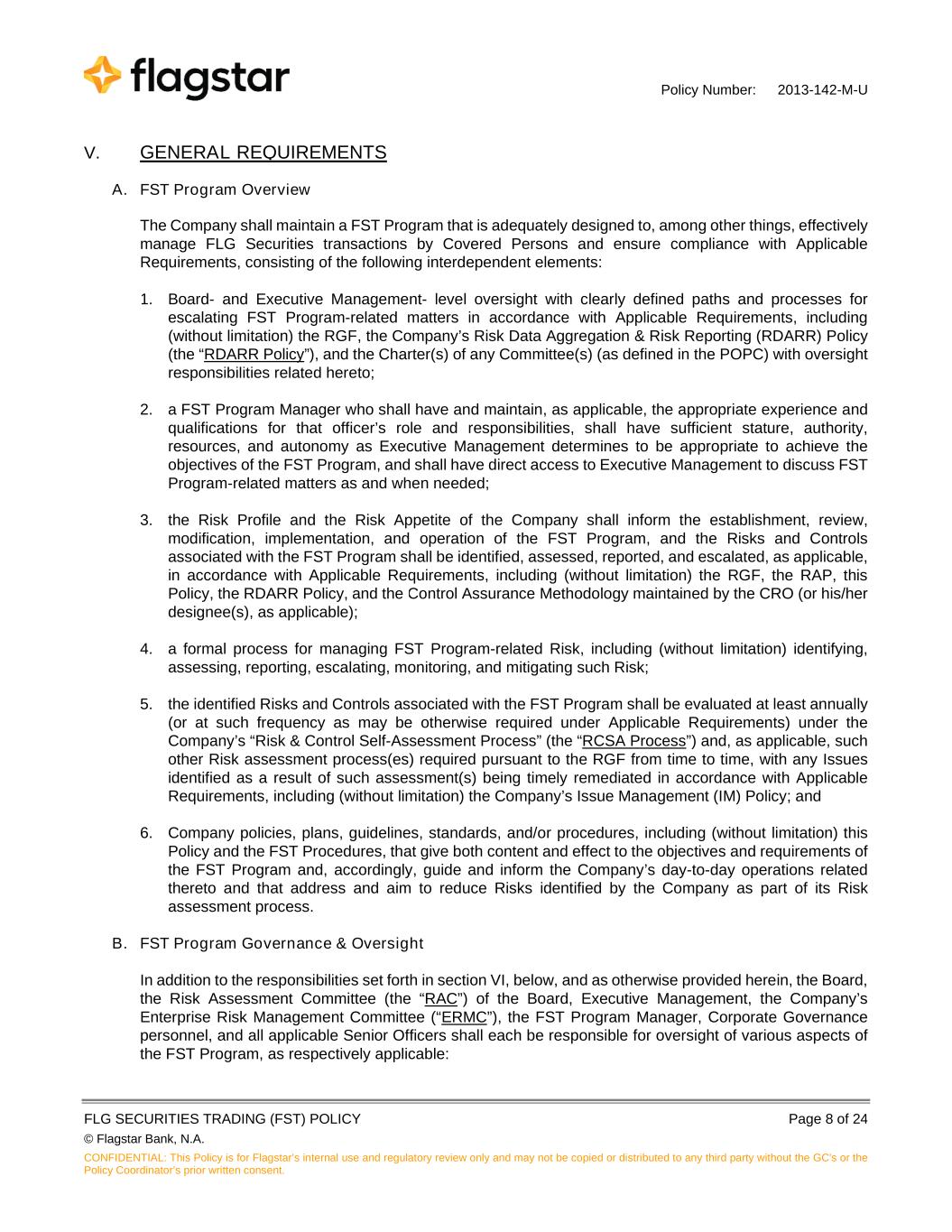Policy Number: 2013-142-M-U FLG SECURITIES TRADING (FST) POLICY Page 8 of 24 © Flagstar Bank, N.A. CONFIDENTIAL: This Policy is for Flagstar’s internal use and regulatory review only and may not be copied or distributed to any third party without the GC's or the Policy Coordinator’s prior written consent. V. GENERAL REQUIREMENTS A. FST Program Overview The Company shall maintain a FST Program that is adequately designed to, among other things, effectively manage FLG Securities transactions by Covered Persons and ensure compliance with Applicable Requirements, consisting of the following interdependent elements: 1. Board- and Executive Management- level oversight with clearly defined paths and processes for escalating FST Program-related matters in accordance with Applicable Requirements, including (without limitation) the RGF, the Company’s Risk Data Aggregation & Risk Reporting (RDARR) Policy (the “RDARR Policy”), and the Charter(s) of any Committee(s) (as defined in the POPC) with oversight responsibilities related hereto; 2. a FST Program Manager who shall have and maintain, as applicable, the appropriate experience and qualifications for that officer’s role and responsibilities, shall have sufficient stature, authority, resources, and autonomy as Executive Management determines to be appropriate to achieve the objectives of the FST Program, and shall have direct access to Executive Management to discuss FST Program-related matters as and when needed; 3. the Risk Profile and the Risk Appetite of the Company shall inform the establishment, review, modification, implementation, and operation of the FST Program, and the Risks and Controls associated with the FST Program shall be identified, assessed, reported, and escalated, as applicable, in accordance with Applicable Requirements, including (without limitation) the RGF, the RAP, this Policy, the RDARR Policy, and the Control Assurance Methodology maintained by the CRO (or his/her designee(s), as applicable); 4. a formal process for managing FST Program-related Risk, including (without limitation) identifying, assessing, reporting, escalating, monitoring, and mitigating such Risk; 5. the identified Risks and Controls associated with the FST Program shall be evaluated at least annually (or at such frequency as may be otherwise required under Applicable Requirements) under the Company’s “Risk & Control Self-Assessment Process” (the “RCSA Process”) and, as applicable, such other Risk assessment process(es) required pursuant to the RGF from time to time, with any Issues identified as a result of such assessment(s) being timely remediated in accordance with Applicable Requirements, including (without limitation) the Company’s Issue Management (IM) Policy; and 6. Company policies, plans, guidelines, standards, and/or procedures, including (without limitation) this Policy and the FST Procedures, that give both content and effect to the objectives and requirements of the FST Program and, accordingly, guide and inform the Company’s day-to-day operations related thereto and that address and aim to reduce Risks identified by the Company as part of its Risk assessment process. B. FST Program Governance & Oversight In addition to the responsibilities set forth in section VI, below, and as otherwise provided herein, the Board, the Risk Assessment Committee (the “RAC”) of the Board, Executive Management, the Company’s Enterprise Risk Management Committee (“ERMC”), the FST Program Manager, Corporate Governance personnel, and all applicable Senior Officers shall each be responsible for oversight of various aspects of the FST Program, as respectively applicable: