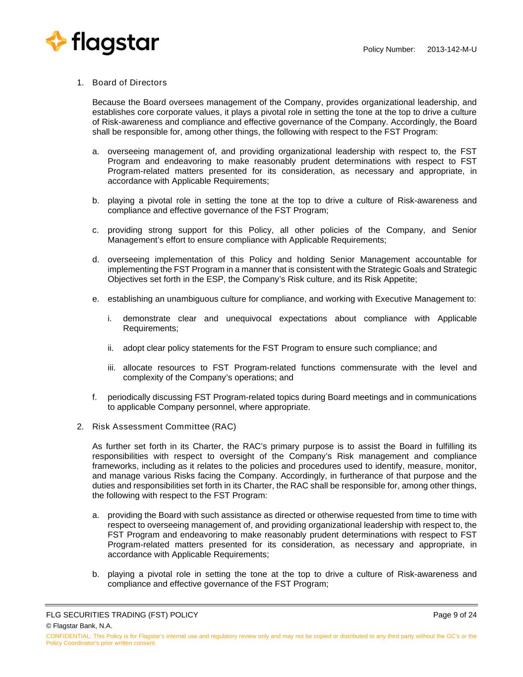 Policy Number: 2013-142-M-U FLG SECURITIES TRADING (FST) POLICY Page 9 of 24 © Flagstar Bank, N.A. CONFIDENTIAL: This Policy is for Flagstar’s internal use and regulatory review only and may not be copied or distributed to any third party without the GC's or the Policy Coordinator’s prior written consent. 1. Board of Directors Because the Board oversees management of the Company, provides organizational leadership, and establishes core corporate values, it plays a pivotal role in setting the tone at the top to drive a culture of Risk-awareness and compliance and effective governance of the Company. Accordingly, the Board shall be responsible for, among other things, the following with respect to the FST Program: a. overseeing management of, and providing organizational leadership with respect to, the FST Program and endeavoring to make reasonably prudent determinations with respect to FST Program-related matters presented for its consideration, as necessary and appropriate, in accordance with Applicable Requirements; b. playing a pivotal role in setting the tone at the top to drive a culture of Risk-awareness and compliance and effective governance of the FST Program; c. providing strong support for this Policy, all other policies of the Company, and Senior Management’s effort to ensure compliance with Applicable Requirements; d. overseeing implementation of this Policy and holding Senior Management accountable for implementing the FST Program in a manner that is consistent with the Strategic Goals and Strategic Objectives set forth in the ESP, the Company’s Risk culture, and its Risk Appetite; e. establishing an unambiguous culture for compliance, and working with Executive Management to: i. demonstrate clear and unequivocal expectations about compliance with Applicable Requirements; ii. adopt clear policy statements for the FST Program to ensure such compliance; and iii. allocate resources to FST Program-related functions commensurate with the level and complexity of the Company’s operations; and f. periodically discussing FST Program-related topics during Board meetings and in communications to applicable Company personnel, where appropriate. 2. Risk Assessment Committee (RAC) As further set forth in its Charter, the RAC’s primary purpose is to assist the Board in fulfilling its responsibilities with respect to oversight of the Company’s Risk management and compliance frameworks, including as it relates to the policies and procedures used to identify, measure, monitor, and manage various Risks facing the Company. Accordingly, in furtherance of that purpose and the duties and responsibilities set forth in its Charter, the RAC shall be responsible for, among other things, the following with respect to the FST Program: a. providing the Board with such assistance as directed or otherwise requested from time to time with respect to overseeing management of, and providing organizational leadership with respect to, the FST Program and endeavoring to make reasonably prudent determinations with respect to FST Program-related matters presented for its consideration, as necessary and appropriate, in accordance with Applicable Requirements; b. playing a pivotal role in setting the tone at the top to drive a culture of Risk-awareness and compliance and effective governance of the FST Program;
