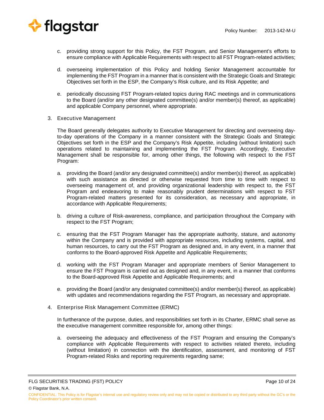 Policy Number: 2013-142-M-U FLG SECURITIES TRADING (FST) POLICY Page 10 of 24 © Flagstar Bank, N.A. CONFIDENTIAL: This Policy is for Flagstar’s internal use and regulatory review only and may not be copied or distributed to any third party without the GC's or the Policy Coordinator’s prior written consent. c. providing strong support for this Policy, the FST Program, and Senior Management’s efforts to ensure compliance with Applicable Requirements with respect to all FST Program-related activities; d. overseeing implementation of this Policy and holding Senior Management accountable for implementing the FST Program in a manner that is consistent with the Strategic Goals and Strategic Objectives set forth in the ESP, the Company’s Risk culture, and its Risk Appetite; and e. periodically discussing FST Program-related topics during RAC meetings and in communications to the Board (and/or any other designated committee(s) and/or member(s) thereof, as applicable) and applicable Company personnel, where appropriate. 3. Executive Management The Board generally delegates authority to Executive Management for directing and overseeing day- to-day operations of the Company in a manner consistent with the Strategic Goals and Strategic Objectives set forth in the ESP and the Company’s Risk Appetite, including (without limitation) such operations related to maintaining and implementing the FST Program. Accordingly, Executive Management shall be responsible for, among other things, the following with respect to the FST Program: a. providing the Board (and/or any designated committee(s) and/or member(s) thereof, as applicable) with such assistance as directed or otherwise requested from time to time with respect to overseeing management of, and providing organizational leadership with respect to, the FST Program and endeavoring to make reasonably prudent determinations with respect to FST Program-related matters presented for its consideration, as necessary and appropriate, in accordance with Applicable Requirements; b. driving a culture of Risk-awareness, compliance, and participation throughout the Company with respect to the FST Program; c. ensuring that the FST Program Manager has the appropriate authority, stature, and autonomy within the Company and is provided with appropriate resources, including systems, capital, and human resources, to carry out the FST Program as designed and, in any event, in a manner that conforms to the Board-approved Risk Appetite and Applicable Requirements; d. working with the FST Program Manager and appropriate members of Senior Management to ensure the FST Program is carried out as designed and, in any event, in a manner that conforms to the Board-approved Risk Appetite and Applicable Requirements; and e. providing the Board (and/or any designated committee(s) and/or member(s) thereof, as applicable) with updates and recommendations regarding the FST Program, as necessary and appropriate. 4. Enterprise Risk Management Committee (ERMC) In furtherance of the purpose, duties, and responsibilities set forth in its Charter, ERMC shall serve as the executive management committee responsible for, among other things: a. overseeing the adequacy and effectiveness of the FST Program and ensuring the Company’s compliance with Applicable Requirements with respect to activities related thereto, including (without limitation) in connection with the identification, assessment, and monitoring of FST Program-related Risks and reporting requirements regarding same;