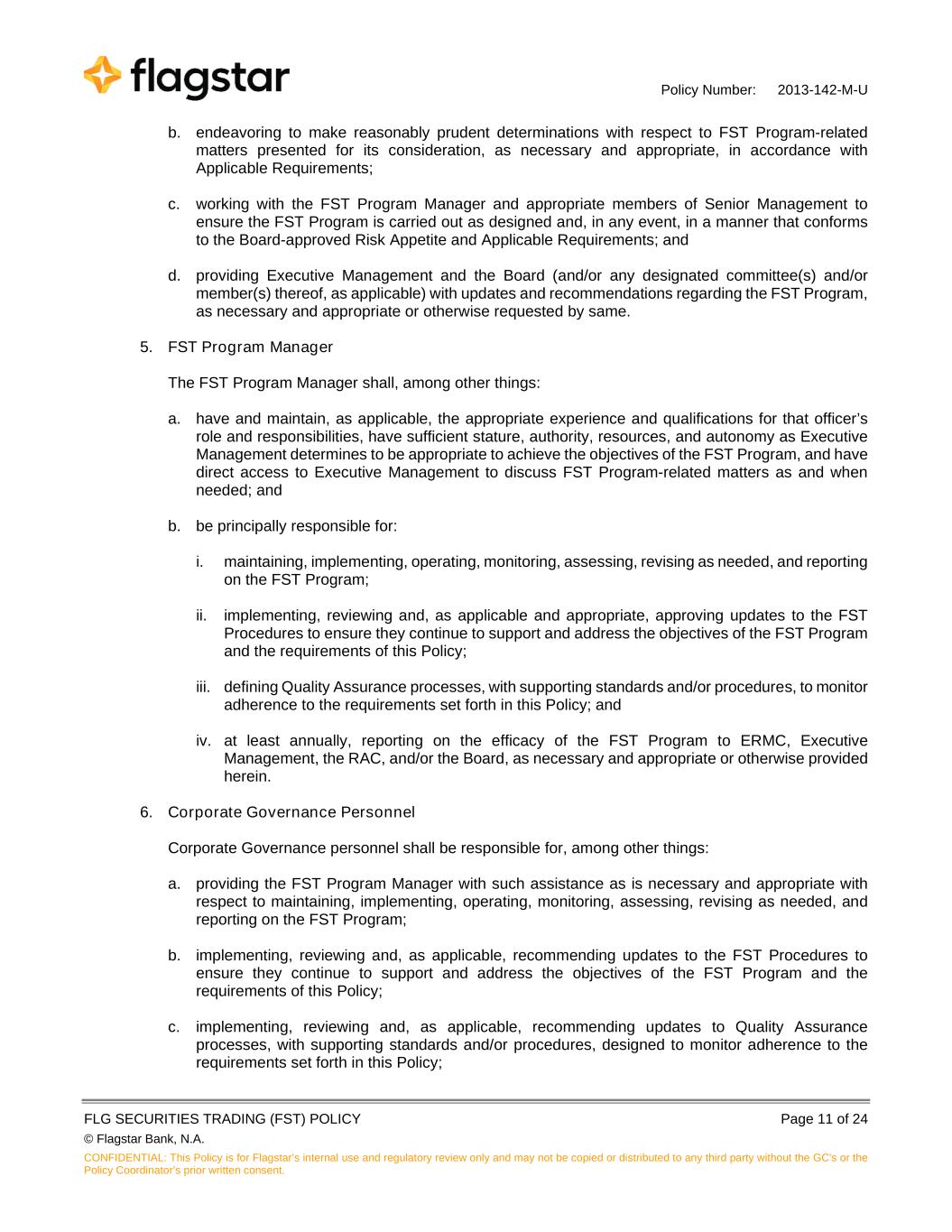 Policy Number: 2013-142-M-U FLG SECURITIES TRADING (FST) POLICY Page 11 of 24 © Flagstar Bank, N.A. CONFIDENTIAL: This Policy is for Flagstar’s internal use and regulatory review only and may not be copied or distributed to any third party without the GC's or the Policy Coordinator’s prior written consent. b. endeavoring to make reasonably prudent determinations with respect to FST Program-related matters presented for its consideration, as necessary and appropriate, in accordance with Applicable Requirements; c. working with the FST Program Manager and appropriate members of Senior Management to ensure the FST Program is carried out as designed and, in any event, in a manner that conforms to the Board-approved Risk Appetite and Applicable Requirements; and d. providing Executive Management and the Board (and/or any designated committee(s) and/or member(s) thereof, as applicable) with updates and recommendations regarding the FST Program, as necessary and appropriate or otherwise requested by same. 5. FST Program Manager The FST Program Manager shall, among other things: a. have and maintain, as applicable, the appropriate experience and qualifications for that officer’s role and responsibilities, have sufficient stature, authority, resources, and autonomy as Executive Management determines to be appropriate to achieve the objectives of the FST Program, and have direct access to Executive Management to discuss FST Program-related matters as and when needed; and b. be principally responsible for: i. maintaining, implementing, operating, monitoring, assessing, revising as needed, and reporting on the FST Program; ii. implementing, reviewing and, as applicable and appropriate, approving updates to the FST Procedures to ensure they continue to support and address the objectives of the FST Program and the requirements of this Policy; iii. defining Quality Assurance processes, with supporting standards and/or procedures, to monitor adherence to the requirements set forth in this Policy; and iv. at least annually, reporting on the efficacy of the FST Program to ERMC, Executive Management, the RAC, and/or the Board, as necessary and appropriate or otherwise provided herein. 6. Corporate Governance Personnel Corporate Governance personnel shall be responsible for, among other things: a. providing the FST Program Manager with such assistance as is necessary and appropriate with respect to maintaining, implementing, operating, monitoring, assessing, revising as needed, and reporting on the FST Program; b. implementing, reviewing and, as applicable, recommending updates to the FST Procedures to ensure they continue to support and address the objectives of the FST Program and the requirements of this Policy; c. implementing, reviewing and, as applicable, recommending updates to Quality Assurance processes, with supporting standards and/or procedures, designed to monitor adherence to the requirements set forth in this Policy;
