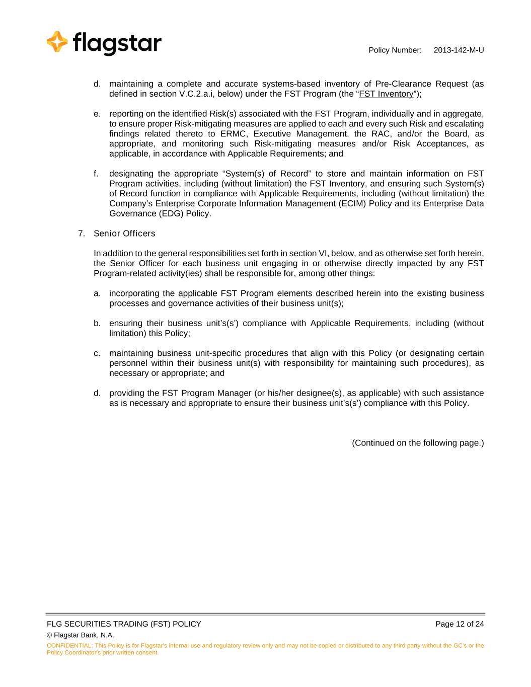 Policy Number: 2013-142-M-U FLG SECURITIES TRADING (FST) POLICY Page 12 of 24 © Flagstar Bank, N.A. CONFIDENTIAL: This Policy is for Flagstar’s internal use and regulatory review only and may not be copied or distributed to any third party without the GC's or the Policy Coordinator’s prior written consent. d. maintaining a complete and accurate systems-based inventory of Pre-Clearance Request (as defined in section V.C.2.a.i, below) under the FST Program (the “FST Inventory”); e. reporting on the identified Risk(s) associated with the FST Program, individually and in aggregate, to ensure proper Risk-mitigating measures are applied to each and every such Risk and escalating findings related thereto to ERMC, Executive Management, the RAC, and/or the Board, as appropriate, and monitoring such Risk-mitigating measures and/or Risk Acceptances, as applicable, in accordance with Applicable Requirements; and f. designating the appropriate “System(s) of Record” to store and maintain information on FST Program activities, including (without limitation) the FST Inventory, and ensuring such System(s) of Record function in compliance with Applicable Requirements, including (without limitation) the Company’s Enterprise Corporate Information Management (ECIM) Policy and its Enterprise Data Governance (EDG) Policy. 7. Senior Officers In addition to the general responsibilities set forth in section VI, below, and as otherwise set forth herein, the Senior Officer for each business unit engaging in or otherwise directly impacted by any FST Program-related activity(ies) shall be responsible for, among other things: a. incorporating the applicable FST Program elements described herein into the existing business processes and governance activities of their business unit(s); b. ensuring their business unit’s(s’) compliance with Applicable Requirements, including (without limitation) this Policy; c. maintaining business unit-specific procedures that align with this Policy (or designating certain personnel within their business unit(s) with responsibility for maintaining such procedures), as necessary or appropriate; and d. providing the FST Program Manager (or his/her designee(s), as applicable) with such assistance as is necessary and appropriate to ensure their business unit’s(s’) compliance with this Policy. (Continued on the following page.)