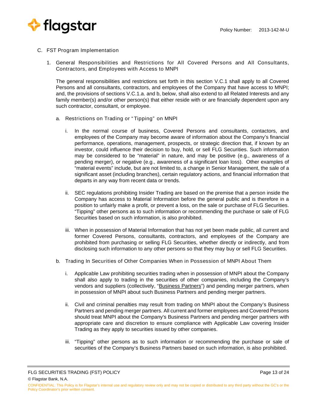 Policy Number: 2013-142-M-U FLG SECURITIES TRADING (FST) POLICY Page 13 of 24 © Flagstar Bank, N.A. CONFIDENTIAL: This Policy is for Flagstar’s internal use and regulatory review only and may not be copied or distributed to any third party without the GC's or the Policy Coordinator’s prior written consent. C. FST Program Implementation 1. General Responsibilities and Restrictions for All Covered Persons and All Consultants, Contractors, and Employees with Access to MNPI The general responsibilities and restrictions set forth in this section V.C.1 shall apply to all Covered Persons and all consultants, contractors, and employees of the Company that have access to MNPI; and, the provisions of sections V.C.1.a. and b, below, shall also extend to all Related Interests and any family member(s) and/or other person(s) that either reside with or are financially dependent upon any such contractor, consultant, or employee. a. Restrictions on Trading or “Tipping” on MNPI i. In the normal course of business, Covered Persons and consultants, contactors, and employees of the Company may become aware of information about the Company’s financial performance, operations, management, prospects, or strategic direction that, if known by an investor, could influence their decision to buy, hold, or sell FLG Securities. Such information may be considered to be “material” in nature, and may be positive (e.g., awareness of a pending merger), or negative (e.g., awareness of a significant loan loss). Other examples of “material events” include, but are not limited to, a change in Senior Management, the sale of a significant asset (including branches), certain regulatory actions, and financial information that departs in any way from recent data or trends. ii. SEC regulations prohibiting Insider Trading are based on the premise that a person inside the Company has access to Material Information before the general public and is therefore in a position to unfairly make a profit, or prevent a loss, on the sale or purchase of FLG Securities. “Tipping” other persons as to such information or recommending the purchase or sale of FLG Securities based on such information, is also prohibited. iii. When in possession of Material Information that has not yet been made public, all current and former Covered Persons, consultants, contractors, and employees of the Company are prohibited from purchasing or selling FLG Securities, whether directly or indirectly, and from disclosing such information to any other persons so that they may buy or sell FLG Securities. b. Trading In Securities of Other Companies When in Possession of MNPI About Them i. Applicable Law prohibiting securities trading when in possession of MNPI about the Company shall also apply to trading in the securities of other companies, including the Company’s vendors and suppliers (collectively, “Business Partners”) and pending merger partners, when in possession of MNPI about such Business Partners and pending merger partners. ii. Civil and criminal penalties may result from trading on MNPI about the Company’s Business Partners and pending merger partners. All current and former employees and Covered Persons should treat MNPI about the Company's Business Partners and pending merger partners with appropriate care and discretion to ensure compliance with Applicable Law covering Insider Trading as they apply to securities issued by other companies. iii. “Tipping” other persons as to such information or recommending the purchase or sale of securities of the Company’s Business Partners based on such information, is also prohibited.