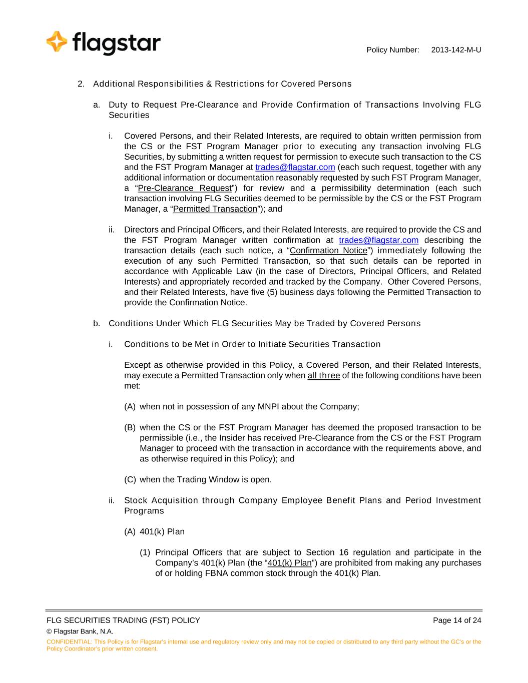 Policy Number: 2013-142-M-U FLG SECURITIES TRADING (FST) POLICY Page 14 of 24 © Flagstar Bank, N.A. CONFIDENTIAL: This Policy is for Flagstar’s internal use and regulatory review only and may not be copied or distributed to any third party without the GC's or the Policy Coordinator’s prior written consent. 2. Additional Responsibilities & Restrictions for Covered Persons a. Duty to Request Pre-Clearance and Provide Confirmation of Transactions Involving FLG Securities i. Covered Persons, and their Related Interests, are required to obtain written permission from the CS or the FST Program Manager prior to executing any transaction involving FLG Securities, by submitting a written request for permission to execute such transaction to the CS and the FST Program Manager at trades@flagstar.com (each such request, together with any additional information or documentation reasonably requested by such FST Program Manager, a “Pre-Clearance Request”) for review and a permissibility determination (each such transaction involving FLG Securities deemed to be permissible by the CS or the FST Program Manager, a “Permitted Transaction”); and ii. Directors and Principal Officers, and their Related Interests, are required to provide the CS and the FST Program Manager written confirmation at trades@flagstar.com describing the transaction details (each such notice, a “Confirmation Notice”) immediately following the execution of any such Permitted Transaction, so that such details can be reported in accordance with Applicable Law (in the case of Directors, Principal Officers, and Related Interests) and appropriately recorded and tracked by the Company. Other Covered Persons, and their Related Interests, have five (5) business days following the Permitted Transaction to provide the Confirmation Notice. b. Conditions Under Which FLG Securities May be Traded by Covered Persons i. Conditions to be Met in Order to Initiate Securities Transaction Except as otherwise provided in this Policy, a Covered Person, and their Related Interests, may execute a Permitted Transaction only when all three of the following conditions have been met: (A) when not in possession of any MNPI about the Company; (B) when the CS or the FST Program Manager has deemed the proposed transaction to be permissible (i.e., the Insider has received Pre-Clearance from the CS or the FST Program Manager to proceed with the transaction in accordance with the requirements above, and as otherwise required in this Policy); and (C) when the Trading Window is open. ii. Stock Acquisition through Company Employee Benefit Plans and Period Investment Programs (A) 401(k) Plan (1) Principal Officers that are subject to Section 16 regulation and participate in the Company’s 401(k) Plan (the “401(k) Plan”) are prohibited from making any purchases of or holding FBNA common stock through the 401(k) Plan.