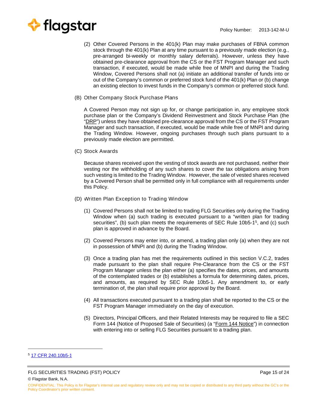 Policy Number: 2013-142-M-U FLG SECURITIES TRADING (FST) POLICY Page 15 of 24 © Flagstar Bank, N.A. CONFIDENTIAL: This Policy is for Flagstar’s internal use and regulatory review only and may not be copied or distributed to any third party without the GC's or the Policy Coordinator’s prior written consent. (2) Other Covered Persons in the 401(k) Plan may make purchases of FBNA common stock through the 401(k) Plan at any time pursuant to a previously made election (e.g., pre-arranged bi-weekly or monthly salary deferrals). However, unless they have obtained pre-clearance approval from the CS or the FST Program Manager and such transaction, if executed, would be made while free of MNPI and during the Trading Window, Covered Persons shall not (a) initiate an additional transfer of funds into or out of the Company’s common or preferred stock fund of the 401(k) Plan or (b) change an existing election to invest funds in the Company’s common or preferred stock fund. (B) Other Company Stock Purchase Plans A Covered Person may not sign up for, or change participation in, any employee stock purchase plan or the Company’s Dividend Reinvestment and Stock Purchase Plan (the “DRP”) unless they have obtained pre-clearance approval from the CS or the FST Program Manager and such transaction, if executed, would be made while free of MNPI and during the Trading Window. However, ongoing purchases through such plans pursuant to a previously made election are permitted. (C) Stock Awards Because shares received upon the vesting of stock awards are not purchased, neither their vesting nor the withholding of any such shares to cover the tax obligations arising from such vesting is limited to the Trading Window. However, the sale of vested shares received by a Covered Person shall be permitted only in full compliance with all requirements under this Policy. (D) Written Plan Exception to Trading Window (1) Covered Persons shall not be limited to trading FLG Securities only during the Trading Window when (a) such trading is executed pursuant to a “written plan for trading securities”, (b) such plan meets the requirements of SEC Rule 10b5-15, and (c) such plan is approved in advance by the Board. (2) Covered Persons may enter into, or amend, a trading plan only (a) when they are not in possession of MNPI and (b) during the Trading Window. (3) Once a trading plan has met the requirements outlined in this section V.C.2, trades made pursuant to the plan shall require Pre-Clearance from the CS or the FST Program Manager unless the plan either (a) specifies the dates, prices, and amounts of the contemplated trades or (b) establishes a formula for determining dates, prices, and amounts, as required by SEC Rule 10b5-1. Any amendment to, or early termination of, the plan shall require prior approval by the Board. (4) All transactions executed pursuant to a trading plan shall be reported to the CS or the FST Program Manager immediately on the day of execution. (5) Directors, Principal Officers, and their Related Interests may be required to file a SEC Form 144 (Notice of Proposed Sale of Securities) (a “Form 144 Notice”) in connection with entering into or selling FLG Securities pursuant to a trading plan. 5 17 CFR 240.10b5-1