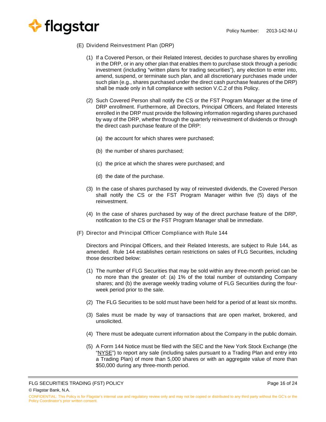 Policy Number: 2013-142-M-U FLG SECURITIES TRADING (FST) POLICY Page 16 of 24 © Flagstar Bank, N.A. CONFIDENTIAL: This Policy is for Flagstar’s internal use and regulatory review only and may not be copied or distributed to any third party without the GC's or the Policy Coordinator’s prior written consent. (E) Dividend Reinvestment Plan (DRP) (1) If a Covered Person, or their Related Interest, decides to purchase shares by enrolling in the DRP, or in any other plan that enables them to purchase stock through a periodic investment (including “written plans for trading securities”), any election to enter into, amend, suspend, or terminate such plan, and all discretionary purchases made under such plan (e.g., shares purchased under the direct cash purchase features of the DRP) shall be made only in full compliance with section V.C.2 of this Policy. (2) Such Covered Person shall notify the CS or the FST Program Manager at the time of DRP enrollment. Furthermore, all Directors, Principal Officers, and Related Interests enrolled in the DRP must provide the following information regarding shares purchased by way of the DRP, whether through the quarterly reinvestment of dividends or through the direct cash purchase feature of the DRP: (a) the account for which shares were purchased; (b) the number of shares purchased; (c) the price at which the shares were purchased; and (d) the date of the purchase. (3) In the case of shares purchased by way of reinvested dividends, the Covered Person shall notify the CS or the FST Program Manager within five (5) days of the reinvestment. (4) In the case of shares purchased by way of the direct purchase feature of the DRP, notification to the CS or the FST Program Manager shall be immediate. (F) Director and Principal Officer Compliance with Rule 144 Directors and Principal Officers, and their Related Interests, are subject to Rule 144, as amended. Rule 144 establishes certain restrictions on sales of FLG Securities, including those described below: (1) The number of FLG Securities that may be sold within any three-month period can be no more than the greater of: (a) 1% of the total number of outstanding Company shares; and (b) the average weekly trading volume of FLG Securities during the four- week period prior to the sale. (2) The FLG Securities to be sold must have been held for a period of at least six months. (3) Sales must be made by way of transactions that are open market, brokered, and unsolicited. (4) There must be adequate current information about the Company in the public domain. (5) A Form 144 Notice must be filed with the SEC and the New York Stock Exchange (the “NYSE”) to report any sale (including sales pursuant to a Trading Plan and entry into a Trading Plan) of more than 5,000 shares or with an aggregate value of more than $50,000 during any three-month period.