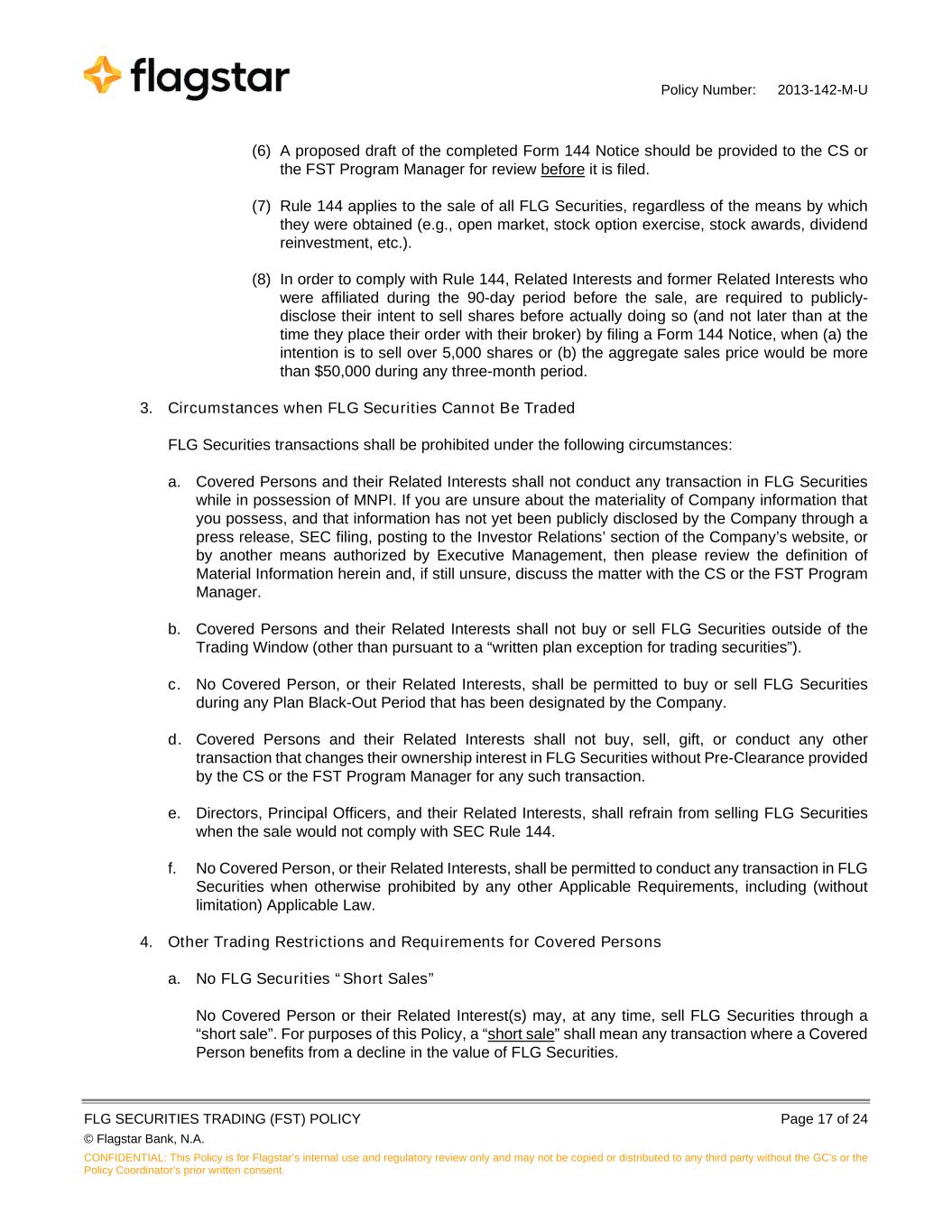 Policy Number: 2013-142-M-U FLG SECURITIES TRADING (FST) POLICY Page 17 of 24 © Flagstar Bank, N.A. CONFIDENTIAL: This Policy is for Flagstar’s internal use and regulatory review only and may not be copied or distributed to any third party without the GC's or the Policy Coordinator’s prior written consent. (6) A proposed draft of the completed Form 144 Notice should be provided to the CS or the FST Program Manager for review before it is filed. (7) Rule 144 applies to the sale of all FLG Securities, regardless of the means by which they were obtained (e.g., open market, stock option exercise, stock awards, dividend reinvestment, etc.). (8) In order to comply with Rule 144, Related Interests and former Related Interests who were affiliated during the 90-day period before the sale, are required to publicly- disclose their intent to sell shares before actually doing so (and not later than at the time they place their order with their broker) by filing a Form 144 Notice, when (a) the intention is to sell over 5,000 shares or (b) the aggregate sales price would be more than $50,000 during any three-month period. 3. Circumstances when FLG Securities Cannot Be Traded FLG Securities transactions shall be prohibited under the following circumstances: a. Covered Persons and their Related Interests shall not conduct any transaction in FLG Securities while in possession of MNPI. If you are unsure about the materiality of Company information that you possess, and that information has not yet been publicly disclosed by the Company through a press release, SEC filing, posting to the Investor Relations’ section of the Company’s website, or by another means authorized by Executive Management, then please review the definition of Material Information herein and, if still unsure, discuss the matter with the CS or the FST Program Manager. b. Covered Persons and their Related Interests shall not buy or sell FLG Securities outside of the Trading Window (other than pursuant to a “written plan exception for trading securities”). c. No Covered Person, or their Related Interests, shall be permitted to buy or sell FLG Securities during any Plan Black-Out Period that has been designated by the Company. d. Covered Persons and their Related Interests shall not buy, sell, gift, or conduct any other transaction that changes their ownership interest in FLG Securities without Pre-Clearance provided by the CS or the FST Program Manager for any such transaction. e. Directors, Principal Officers, and their Related Interests, shall refrain from selling FLG Securities when the sale would not comply with SEC Rule 144. f. No Covered Person, or their Related Interests, shall be permitted to conduct any transaction in FLG Securities when otherwise prohibited by any other Applicable Requirements, including (without limitation) Applicable Law. 4. Other Trading Restrictions and Requirements for Covered Persons a. No FLG Securities “Short Sales” No Covered Person or their Related Interest(s) may, at any time, sell FLG Securities through a “short sale”. For purposes of this Policy, a “short sale” shall mean any transaction where a Covered Person benefits from a decline in the value of FLG Securities.