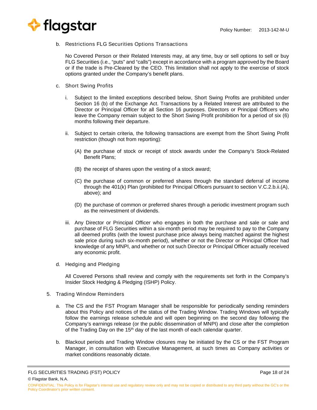 Policy Number: 2013-142-M-U FLG SECURITIES TRADING (FST) POLICY Page 18 of 24 © Flagstar Bank, N.A. CONFIDENTIAL: This Policy is for Flagstar’s internal use and regulatory review only and may not be copied or distributed to any third party without the GC's or the Policy Coordinator’s prior written consent. b. Restrictions FLG Securities Options Transactions No Covered Person or their Related Interests may, at any time, buy or sell options to sell or buy FLG Securities (i.e., “puts” and “calls”) except in accordance with a program approved by the Board or if the trade is Pre-Cleared by the CEO. This limitation shall not apply to the exercise of stock options granted under the Company’s benefit plans. c. Short Swing Profits i. Subject to the limited exceptions described below, Short Swing Profits are prohibited under Section 16 (b) of the Exchange Act. Transactions by a Related Interest are attributed to the Director or Principal Officer for all Section 16 purposes. Directors or Principal Officers who leave the Company remain subject to the Short Swing Profit prohibition for a period of six (6) months following their departure. ii. Subject to certain criteria, the following transactions are exempt from the Short Swing Profit restriction (though not from reporting): (A) the purchase of stock or receipt of stock awards under the Company’s Stock-Related Benefit Plans; (B) the receipt of shares upon the vesting of a stock award; (C) the purchase of common or preferred shares through the standard deferral of income through the 401(k) Plan (prohibited for Principal Officers pursuant to section V.C.2.b.ii.(A), above); and (D) the purchase of common or preferred shares through a periodic investment program such as the reinvestment of dividends. iii. Any Director or Principal Officer who engages in both the purchase and sale or sale and purchase of FLG Securities within a six-month period may be required to pay to the Company all deemed profits (with the lowest purchase price always being matched against the highest sale price during such six-month period), whether or not the Director or Principal Officer had knowledge of any MNPI, and whether or not such Director or Principal Officer actually received any economic profit. d. Hedging and Pledging All Covered Persons shall review and comply with the requirements set forth in the Company’s Insider Stock Hedging & Pledging (ISHP) Policy. 5. Trading Window Reminders a. The CS and the FST Program Manager shall be responsible for periodically sending reminders about this Policy and notices of the status of the Trading Window. Trading Windows will typically follow the earnings release schedule and will open beginning on the second day following the Company’s earnings release (or the public dissemination of MNPI) and close after the completion of the Trading Day on the 15th day of the last month of each calendar quarter. b. Blackout periods and Trading Window closures may be initiated by the CS or the FST Program Manager, in consultation with Executive Management, at such times as Company activities or market conditions reasonably dictate.