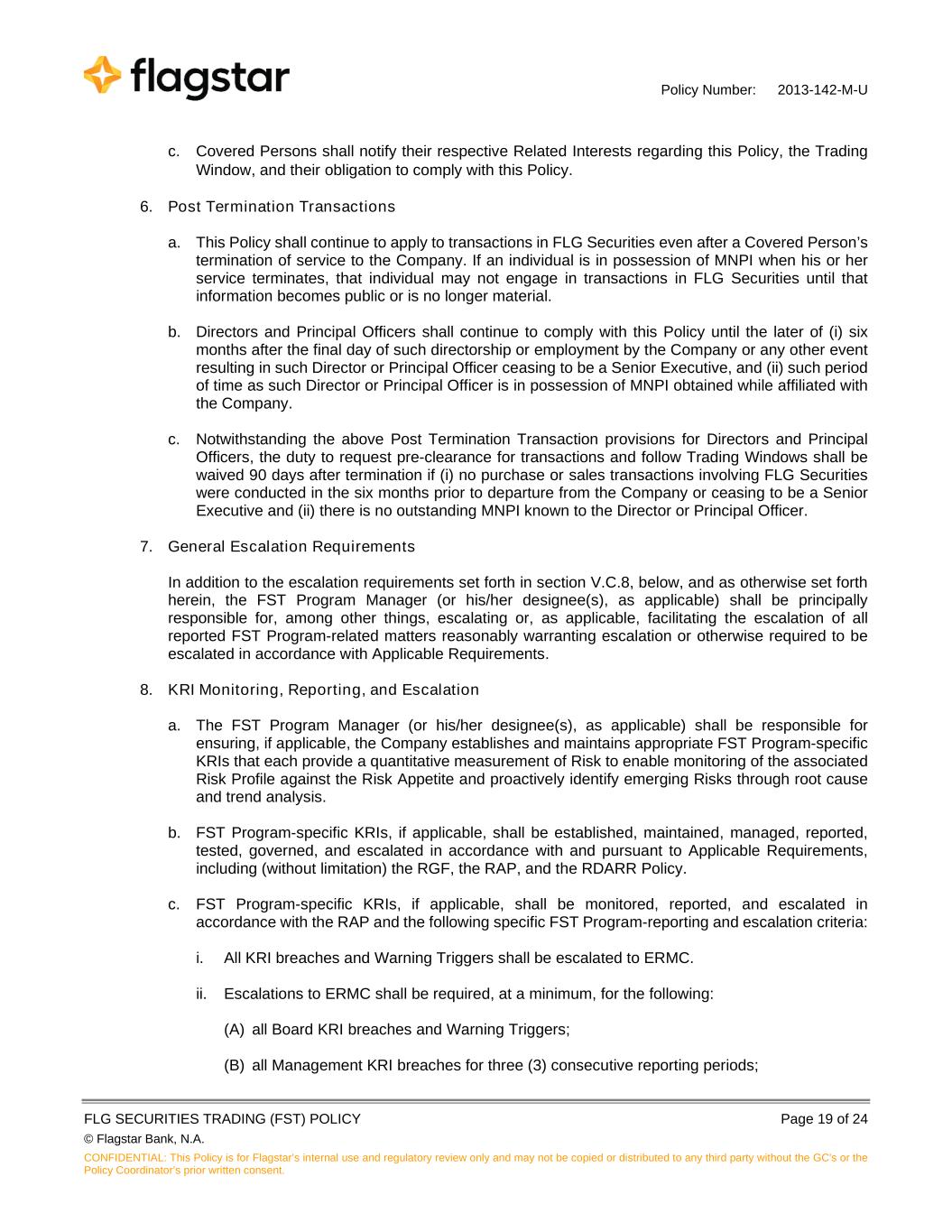 Policy Number: 2013-142-M-U FLG SECURITIES TRADING (FST) POLICY Page 19 of 24 © Flagstar Bank, N.A. CONFIDENTIAL: This Policy is for Flagstar’s internal use and regulatory review only and may not be copied or distributed to any third party without the GC's or the Policy Coordinator’s prior written consent. c. Covered Persons shall notify their respective Related Interests regarding this Policy, the Trading Window, and their obligation to comply with this Policy. 6. Post Termination Transactions a. This Policy shall continue to apply to transactions in FLG Securities even after a Covered Person’s termination of service to the Company. If an individual is in possession of MNPI when his or her service terminates, that individual may not engage in transactions in FLG Securities until that information becomes public or is no longer material. b. Directors and Principal Officers shall continue to comply with this Policy until the later of (i) six months after the final day of such directorship or employment by the Company or any other event resulting in such Director or Principal Officer ceasing to be a Senior Executive, and (ii) such period of time as such Director or Principal Officer is in possession of MNPI obtained while affiliated with the Company. c. Notwithstanding the above Post Termination Transaction provisions for Directors and Principal Officers, the duty to request pre-clearance for transactions and follow Trading Windows shall be waived 90 days after termination if (i) no purchase or sales transactions involving FLG Securities were conducted in the six months prior to departure from the Company or ceasing to be a Senior Executive and (ii) there is no outstanding MNPI known to the Director or Principal Officer. 7. General Escalation Requirements In addition to the escalation requirements set forth in section V.C.8, below, and as otherwise set forth herein, the FST Program Manager (or his/her designee(s), as applicable) shall be principally responsible for, among other things, escalating or, as applicable, facilitating the escalation of all reported FST Program-related matters reasonably warranting escalation or otherwise required to be escalated in accordance with Applicable Requirements. 8. KRI Monitoring, Reporting, and Escalation a. The FST Program Manager (or his/her designee(s), as applicable) shall be responsible for ensuring, if applicable, the Company establishes and maintains appropriate FST Program-specific KRIs that each provide a quantitative measurement of Risk to enable monitoring of the associated Risk Profile against the Risk Appetite and proactively identify emerging Risks through root cause and trend analysis. b. FST Program-specific KRIs, if applicable, shall be established, maintained, managed, reported, tested, governed, and escalated in accordance with and pursuant to Applicable Requirements, including (without limitation) the RGF, the RAP, and the RDARR Policy. c. FST Program-specific KRIs, if applicable, shall be monitored, reported, and escalated in accordance with the RAP and the following specific FST Program-reporting and escalation criteria: i. All KRI breaches and Warning Triggers shall be escalated to ERMC. ii. Escalations to ERMC shall be required, at a minimum, for the following: (A) all Board KRI breaches and Warning Triggers; (B) all Management KRI breaches for three (3) consecutive reporting periods;