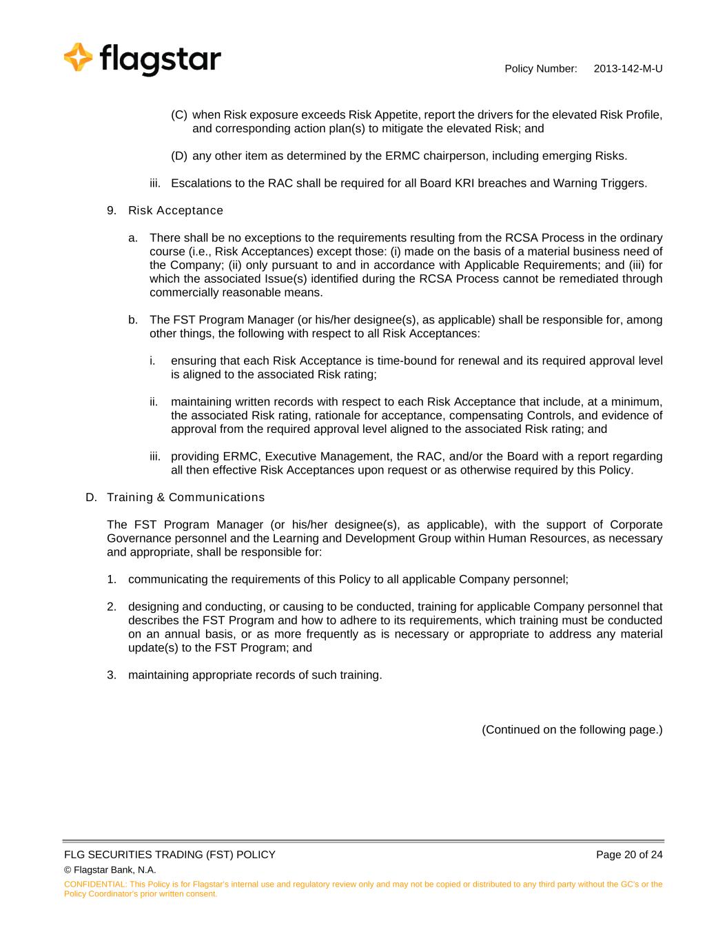 Policy Number: 2013-142-M-U FLG SECURITIES TRADING (FST) POLICY Page 20 of 24 © Flagstar Bank, N.A. CONFIDENTIAL: This Policy is for Flagstar’s internal use and regulatory review only and may not be copied or distributed to any third party without the GC's or the Policy Coordinator’s prior written consent. (C) when Risk exposure exceeds Risk Appetite, report the drivers for the elevated Risk Profile, and corresponding action plan(s) to mitigate the elevated Risk; and (D) any other item as determined by the ERMC chairperson, including emerging Risks. iii. Escalations to the RAC shall be required for all Board KRI breaches and Warning Triggers. 9. Risk Acceptance a. There shall be no exceptions to the requirements resulting from the RCSA Process in the ordinary course (i.e., Risk Acceptances) except those: (i) made on the basis of a material business need of the Company; (ii) only pursuant to and in accordance with Applicable Requirements; and (iii) for which the associated Issue(s) identified during the RCSA Process cannot be remediated through commercially reasonable means. b. The FST Program Manager (or his/her designee(s), as applicable) shall be responsible for, among other things, the following with respect to all Risk Acceptances: i. ensuring that each Risk Acceptance is time-bound for renewal and its required approval level is aligned to the associated Risk rating; ii. maintaining written records with respect to each Risk Acceptance that include, at a minimum, the associated Risk rating, rationale for acceptance, compensating Controls, and evidence of approval from the required approval level aligned to the associated Risk rating; and iii. providing ERMC, Executive Management, the RAC, and/or the Board with a report regarding all then effective Risk Acceptances upon request or as otherwise required by this Policy. D. Training & Communications The FST Program Manager (or his/her designee(s), as applicable), with the support of Corporate Governance personnel and the Learning and Development Group within Human Resources, as necessary and appropriate, shall be responsible for: 1. communicating the requirements of this Policy to all applicable Company personnel; 2. designing and conducting, or causing to be conducted, training for applicable Company personnel that describes the FST Program and how to adhere to its requirements, which training must be conducted on an annual basis, or as more frequently as is necessary or appropriate to address any material update(s) to the FST Program; and 3. maintaining appropriate records of such training. (Continued on the following page.)