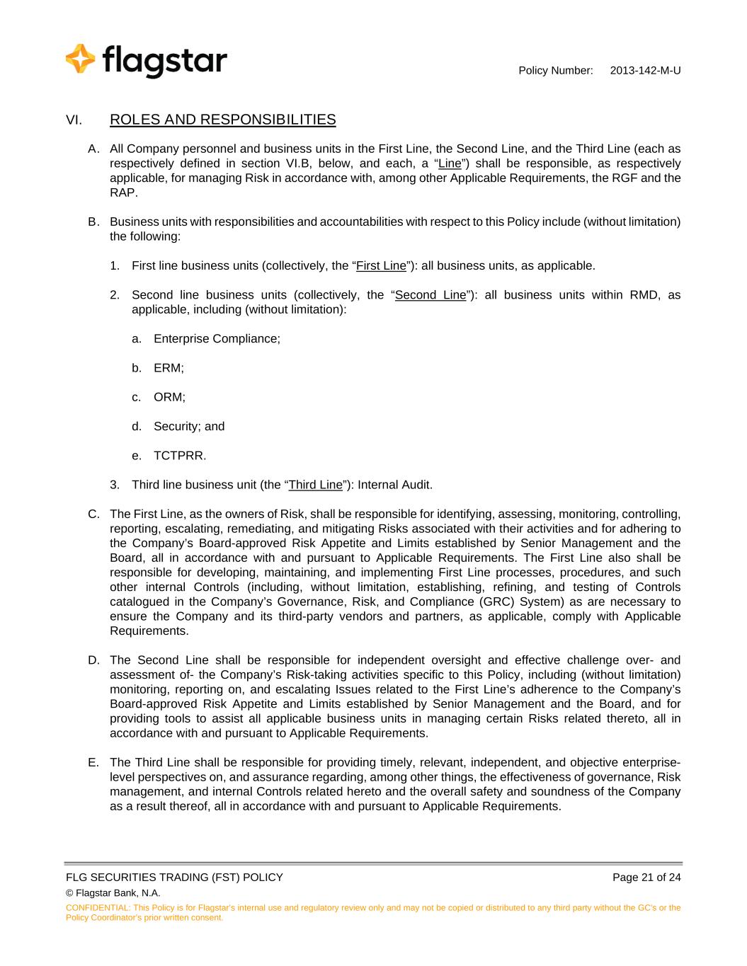 Policy Number: 2013-142-M-U FLG SECURITIES TRADING (FST) POLICY Page 21 of 24 © Flagstar Bank, N.A. CONFIDENTIAL: This Policy is for Flagstar’s internal use and regulatory review only and may not be copied or distributed to any third party without the GC's or the Policy Coordinator’s prior written consent. VI. ROLES AND RESPONSIBILITIES A. All Company personnel and business units in the First Line, the Second Line, and the Third Line (each as respectively defined in section VI.B, below, and each, a “Line”) shall be responsible, as respectively applicable, for managing Risk in accordance with, among other Applicable Requirements, the RGF and the RAP. B. Business units with responsibilities and accountabilities with respect to this Policy include (without limitation) the following: 1. First line business units (collectively, the “First Line”): all business units, as applicable. 2. Second line business units (collectively, the “Second Line”): all business units within RMD, as applicable, including (without limitation): a. Enterprise Compliance; b. ERM; c. ORM; d. Security; and e. TCTPRR. 3. Third line business unit (the “Third Line”): Internal Audit. C. The First Line, as the owners of Risk, shall be responsible for identifying, assessing, monitoring, controlling, reporting, escalating, remediating, and mitigating Risks associated with their activities and for adhering to the Company’s Board-approved Risk Appetite and Limits established by Senior Management and the Board, all in accordance with and pursuant to Applicable Requirements. The First Line also shall be responsible for developing, maintaining, and implementing First Line processes, procedures, and such other internal Controls (including, without limitation, establishing, refining, and testing of Controls catalogued in the Company’s Governance, Risk, and Compliance (GRC) System) as are necessary to ensure the Company and its third-party vendors and partners, as applicable, comply with Applicable Requirements. D. The Second Line shall be responsible for independent oversight and effective challenge over- and assessment of- the Company’s Risk-taking activities specific to this Policy, including (without limitation) monitoring, reporting on, and escalating Issues related to the First Line’s adherence to the Company’s Board-approved Risk Appetite and Limits established by Senior Management and the Board, and for providing tools to assist all applicable business units in managing certain Risks related thereto, all in accordance with and pursuant to Applicable Requirements. E. The Third Line shall be responsible for providing timely, relevant, independent, and objective enterprise- level perspectives on, and assurance regarding, among other things, the effectiveness of governance, Risk management, and internal Controls related hereto and the overall safety and soundness of the Company as a result thereof, all in accordance with and pursuant to Applicable Requirements.