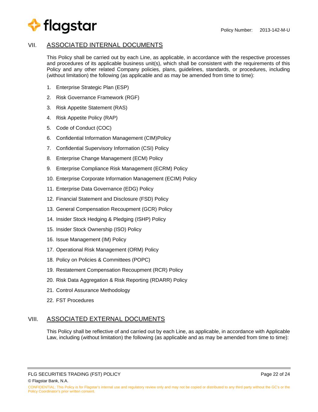 Policy Number: 2013-142-M-U FLG SECURITIES TRADING (FST) POLICY Page 22 of 24 © Flagstar Bank, N.A. CONFIDENTIAL: This Policy is for Flagstar’s internal use and regulatory review only and may not be copied or distributed to any third party without the GC's or the Policy Coordinator’s prior written consent. VII. ASSOCIATED INTERNAL DOCUMENTS This Policy shall be carried out by each Line, as applicable, in accordance with the respective processes and procedures of its applicable business unit(s), which shall be consistent with the requirements of this Policy and any other related Company policies, plans, guidelines, standards, or procedures, including (without limitation) the following (as applicable and as may be amended from time to time): 1. Enterprise Strategic Plan (ESP) 2. Risk Governance Framework (RGF) 3. Risk Appetite Statement (RAS) 4. Risk Appetite Policy (RAP) 5. Code of Conduct (COC) 6. Confidential Information Management (CIM)Policy 7. Confidential Supervisory Information (CSI) Policy 8. Enterprise Change Management (ECM) Policy 9. Enterprise Compliance Risk Management (ECRM) Policy 10. Enterprise Corporate Information Management (ECIM) Policy 11. Enterprise Data Governance (EDG) Policy 12. Financial Statement and Disclosure (FSD) Policy 13. General Compensation Recoupment (GCR) Policy 14. Insider Stock Hedging & Pledging (ISHP) Policy 15. Insider Stock Ownership (ISO) Policy 16. Issue Management (IM) Policy 17. Operational Risk Management (ORM) Policy 18. Policy on Policies & Committees (POPC) 19. Restatement Compensation Recoupment (RCR) Policy 20. Risk Data Aggregation & Risk Reporting (RDARR) Policy 21. Control Assurance Methodology 22. FST Procedures VIII. ASSOCIATED EXTERNAL DOCUMENTS This Policy shall be reflective of and carried out by each Line, as applicable, in accordance with Applicable Law, including (without limitation) the following (as applicable and as may be amended from time to time):