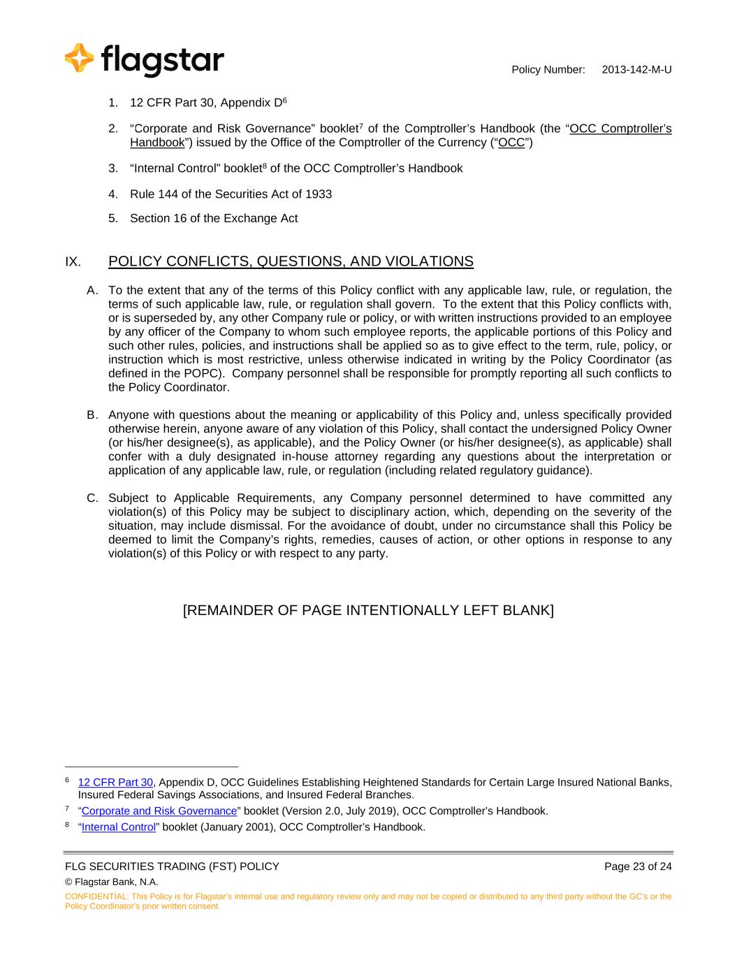 Policy Number: 2013-142-M-U FLG SECURITIES TRADING (FST) POLICY Page 23 of 24 © Flagstar Bank, N.A. CONFIDENTIAL: This Policy is for Flagstar’s internal use and regulatory review only and may not be copied or distributed to any third party without the GC's or the Policy Coordinator’s prior written consent. 1. 12 CFR Part 30, Appendix D6 2. “Corporate and Risk Governance” booklet7 of the Comptroller’s Handbook (the “OCC Comptroller’s Handbook”) issued by the Office of the Comptroller of the Currency (“OCC”) 3. “Internal Control” booklet8 of the OCC Comptroller’s Handbook 4. Rule 144 of the Securities Act of 1933 5. Section 16 of the Exchange Act IX. POLICY CONFLICTS, QUESTIONS, AND VIOLATIONS A. To the extent that any of the terms of this Policy conflict with any applicable law, rule, or regulation, the terms of such applicable law, rule, or regulation shall govern. To the extent that this Policy conflicts with, or is superseded by, any other Company rule or policy, or with written instructions provided to an employee by any officer of the Company to whom such employee reports, the applicable portions of this Policy and such other rules, policies, and instructions shall be applied so as to give effect to the term, rule, policy, or instruction which is most restrictive, unless otherwise indicated in writing by the Policy Coordinator (as defined in the POPC). Company personnel shall be responsible for promptly reporting all such conflicts to the Policy Coordinator. B. Anyone with questions about the meaning or applicability of this Policy and, unless specifically provided otherwise herein, anyone aware of any violation of this Policy, shall contact the undersigned Policy Owner (or his/her designee(s), as applicable), and the Policy Owner (or his/her designee(s), as applicable) shall confer with a duly designated in-house attorney regarding any questions about the interpretation or application of any applicable law, rule, or regulation (including related regulatory guidance). C. Subject to Applicable Requirements, any Company personnel determined to have committed any violation(s) of this Policy may be subject to disciplinary action, which, depending on the severity of the situation, may include dismissal. For the avoidance of doubt, under no circumstance shall this Policy be deemed to limit the Company’s rights, remedies, causes of action, or other options in response to any violation(s) of this Policy or with respect to any party. [REMAINDER OF PAGE INTENTIONALLY LEFT BLANK] 6 12 CFR Part 30, Appendix D, OCC Guidelines Establishing Heightened Standards for Certain Large Insured National Banks, Insured Federal Savings Associations, and Insured Federal Branches. 7 “Corporate and Risk Governance” booklet (Version 2.0, July 2019), OCC Comptroller’s Handbook. 8 “Internal Control” booklet (January 2001), OCC Comptroller’s Handbook.