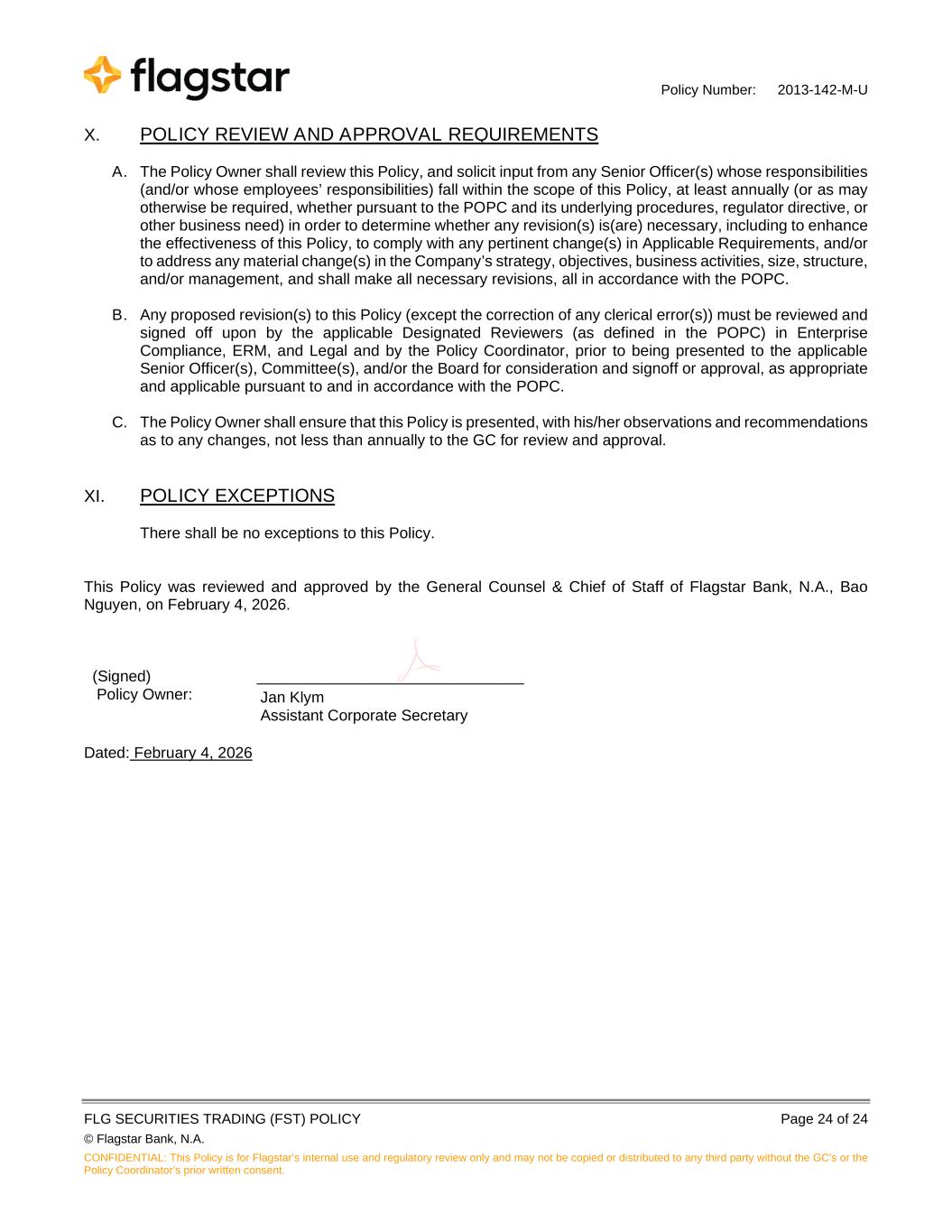 Policy Number: 2013-142-M-U FLG SECURITIES TRADING (FST) POLICY Page 24 of 24 © Flagstar Bank, N.A. CONFIDENTIAL: This Policy is for Flagstar’s internal use and regulatory review only and may not be copied or distributed to any third party without the GC's or the Policy Coordinator’s prior written consent. X. POLICY REVIEW AND APPROVAL REQUIREMENTS A. The Policy Owner shall review this Policy, and solicit input from any Senior Officer(s) whose responsibilities (and/or whose employees’ responsibilities) fall within the scope of this Policy, at least annually (or as may otherwise be required, whether pursuant to the POPC and its underlying procedures, regulator directive, or other business need) in order to determine whether any revision(s) is(are) necessary, including to enhance the effectiveness of this Policy, to comply with any pertinent change(s) in Applicable Requirements, and/or to address any material change(s) in the Company’s strategy, objectives, business activities, size, structure, and/or management, and shall make all necessary revisions, all in accordance with the POPC. B. Any proposed revision(s) to this Policy (except the correction of any clerical error(s)) must be reviewed and signed off upon by the applicable Designated Reviewers (as defined in the POPC) in Enterprise Compliance, ERM, and Legal and by the Policy Coordinator, prior to being presented to the applicable Senior Officer(s), Committee(s), and/or the Board for consideration and signoff or approval, as appropriate and applicable pursuant to and in accordance with the POPC. C. The Policy Owner shall ensure that this Policy is presented, with his/her observations and recommendations as to any changes, not less than annually to the GC for review and approval. XI. POLICY EXCEPTIONS There shall be no exceptions to this Policy. This Policy was reviewed and approved by the General Counsel & Chief of Staff of Flagstar Bank, N.A., Bao Nguyen, on February 4, 2026. (Signed) Policy Owner: Jan Klym Assistant Corporate Secretary Dated: February 4, 2026 _______________________________