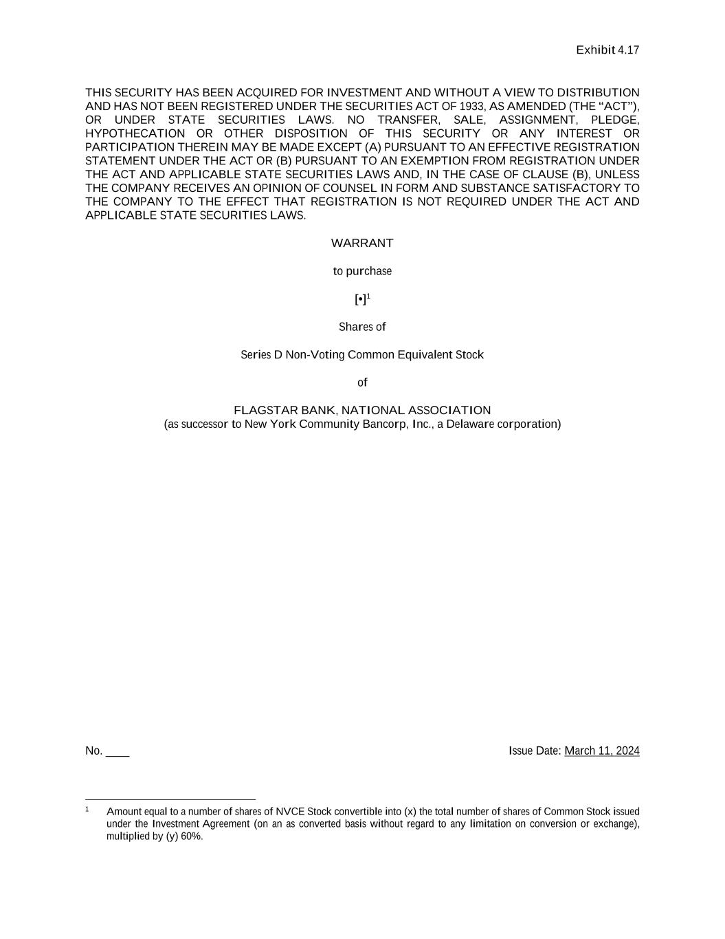 Exhibit 4.17 THIS SECURITY HAS BEEN ACQUIRED FOR INVESTMENT AND WITHOUT A VIEW TO DISTRIBUTION AND HAS NOT BEEN REGISTERED UNDER THE SECURITIES ACT OF 1933, AS AMENDED (THE “ACT”), OR UNDER STATE SECURITIES LAWS. NO TRANSFER, SALE, ASSIGNMENT, PLEDGE, HYPOTHECATION OR OTHER DISPOSITION OF THIS SECURITY OR ANY INTEREST OR PARTICIPATION THEREIN MAY BE MADE EXCEPT (A) PURSUANT TO AN EFFECTIVE REGISTRATION STATEMENT UNDER THE ACT OR (B) PURSUANT TO AN EXEMPTION FROM REGISTRATION UNDER THE ACT AND APPLICABLE STATE SECURITIES LAWS AND, IN THE CASE OF CLAUSE (B), UNLESS THE COMPANY RECEIVES AN OPINION OF COUNSEL IN FORM AND SUBSTANCE SATISFACTORY TO THE COMPANY TO THE EFFECT THAT REGISTRATION IS NOT REQUIRED UNDER THE ACT AND APPLICABLE STATE SECURITIES LAWS. WARRANT to purchase [•]1 Shares of Series D Non-Voting Common Equivalent Stock of FLAGSTAR BANK, NATIONAL ASSOCIATION (as successor to New York Community Bancorp, Inc., a Delaware corporation) No. ____ Issue Date: March 11, 2024 1 Amount equal to a number of shares of NVCE Stock convertible into (x) the total number of shares of Common Stock issued under the Investment Agreement (on an as converted basis without regard to any limitation on conversion or exchange), multiplied by (y) 60%.