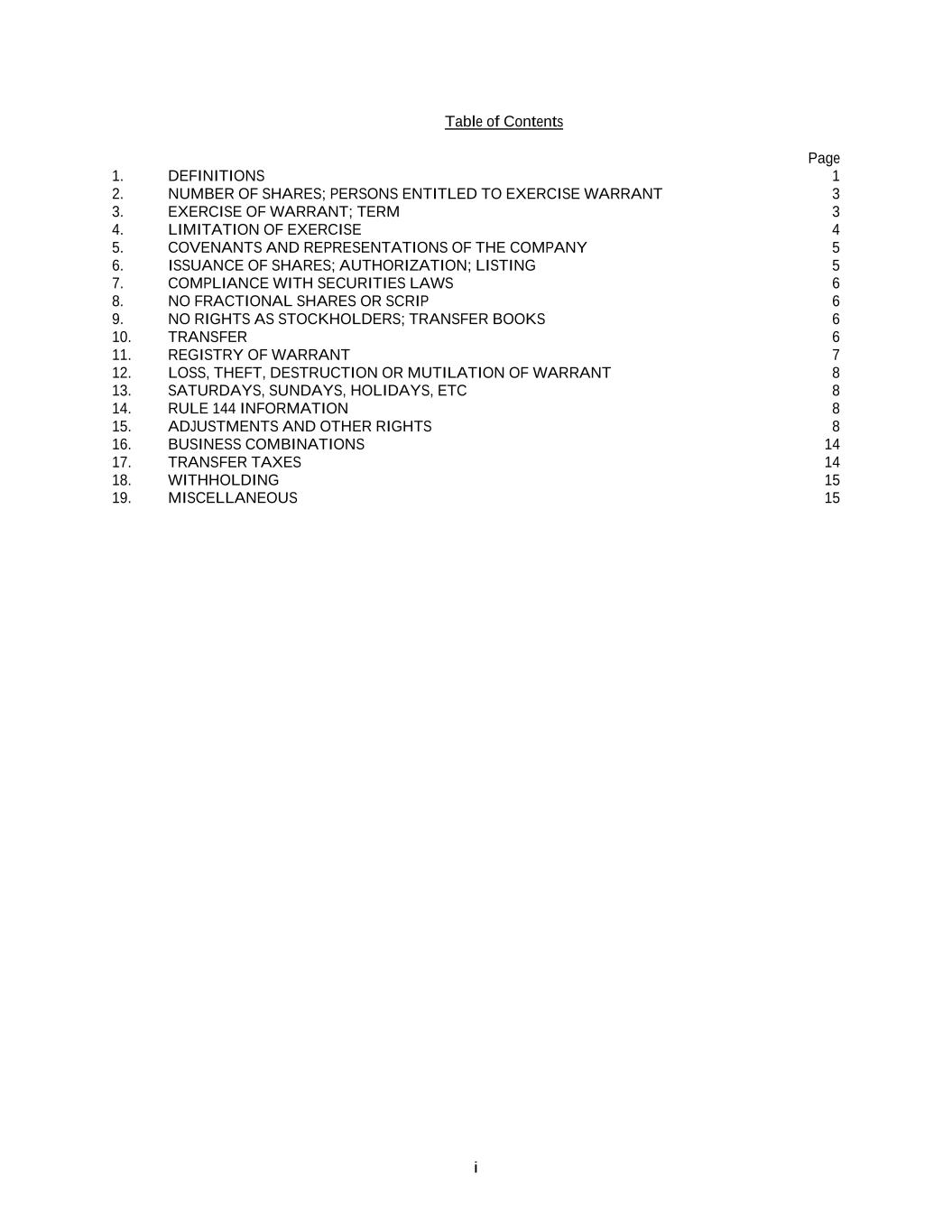 i Table of Contents Page 1. DEFINITIONS 1 2. NUMBER OF SHARES; PERSONS ENTITLED TO EXERCISE WARRANT 3 3. EXERCISE OF WARRANT; TERM 3 4. LIMITATION OF EXERCISE 4 5. COVENANTS AND REPRESENTATIONS OF THE COMPANY 5 6. ISSUANCE OF SHARES; AUTHORIZATION; LISTING 5 7. COMPLIANCE WITH SECURITIES LAWS 6 8. NO FRACTIONAL SHARES OR SCRIP 6 9. NO RIGHTS AS STOCKHOLDERS; TRANSFER BOOKS 6 10. TRANSFER 6 11. REGISTRY OF WARRANT 7 12. LOSS, THEFT, DESTRUCTION OR MUTILATION OF WARRANT 8 13. SATURDAYS, SUNDAYS, HOLIDAYS, ETC 8 14. RULE 144 INFORMATION 8 15. ADJUSTMENTS AND OTHER RIGHTS 8 16. BUSINESS COMBINATIONS 14 17. TRANSFER TAXES 14 18. WITHHOLDING 15 19. MISCELLANEOUS 15