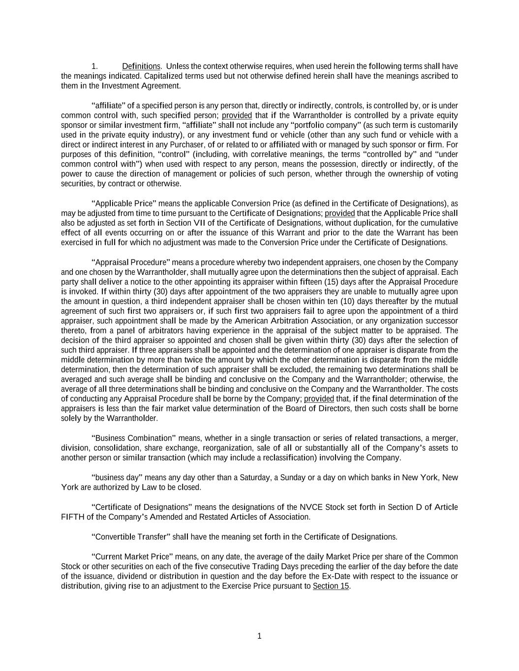 1 1. Definitions. Unless the context otherwise requires, when used herein the following terms shall have the meanings indicated. Capitalized terms used but not otherwise defined herein shall have the meanings ascribed to them in the Investment Agreement. “affiliate” of a specified person is any person that, directly or indirectly, controls, is controlled by, or is under common control with, such specified person; provided that if the Warrantholder is controlled by a private equity sponsor or similar investment firm, “affiliate” shall not include any “portfolio company” (as such term is customarily used in the private equity industry), or any investment fund or vehicle (other than any such fund or vehicle with a direct or indirect interest in any Purchaser, of or related to or affiliated with or managed by such sponsor or firm. For purposes of this definition, “control” (including, with correlative meanings, the terms “controlled by” and “under common control with”) when used with respect to any person, means the possession, directly or indirectly, of the power to cause the direction of management or policies of such person, whether through the ownership of voting securities, by contract or otherwise. “Applicable Price” means the applicable Conversion Price (as defined in the Certificate of Designations), as may be adjusted from time to time pursuant to the Certificate of Designations; provided that the Applicable Price shall also be adjusted as set forth in Section VII of the Certificate of Designations, without duplication, for the cumulative effect of all events occurring on or after the issuance of this Warrant and prior to the date the Warrant has been exercised in full for which no adjustment was made to the Conversion Price under the Certificate of Designations. “Appraisal Procedure” means a procedure whereby two independent appraisers, one chosen by the Company and one chosen by the Warrantholder, shall mutually agree upon the determinations then the subject of appraisal. Each party shall deliver a notice to the other appointing its appraiser within fifteen (15) days after the Appraisal Procedure is invoked. If within thirty (30) days after appointment of the two appraisers they are unable to mutually agree upon the amount in question, a third independent appraiser shall be chosen within ten (10) days thereafter by the mutual agreement of such first two appraisers or, if such first two appraisers fail to agree upon the appointment of a third appraiser, such appointment shall be made by the American Arbitration Association, or any organization successor thereto, from a panel of arbitrators having experience in the appraisal of the subject matter to be appraised. The decision of the third appraiser so appointed and chosen shall be given within thirty (30) days after the selection of such third appraiser. If three appraisers shall be appointed and the determination of one appraiser is disparate from the middle determination by more than twice the amount by which the other determination is disparate from the middle determination, then the determination of such appraiser shall be excluded, the remaining two determinations shall be averaged and such average shall be binding and conclusive on the Company and the Warrantholder; otherwise, the average of all three determinations shall be binding and conclusive on the Company and the Warrantholder. The costs of conducting any Appraisal Procedure shall be borne by the Company; provided that, if the final determination of the appraisers is less than the fair market value determination of the Board of Directors, then such costs shall be borne solely by the Warrantholder. “Business Combination” means, whether in a single transaction or series of related transactions, a merger, division, consolidation, share exchange, reorganization, sale of all or substantially all of the Company’s assets to another person or similar transaction (which may include a reclassification) involving the Company. “business day” means any day other than a Saturday, a Sunday or a day on which banks in New York, New York are authorized by Law to be closed. “Certificate of Designations” means the designations of the NVCE Stock set forth in Section D of Article FIFTH of the Company’s Amended and Restated Articles of Association. “Convertible Transfer” shall have the meaning set forth in the Certificate of Designations. “Current Market Price” means, on any date, the average of the daily Market Price per share of the Common Stock or other securities on each of the five consecutive Trading Days preceding the earlier of the day before the date of the issuance, dividend or distribution in question and the day before the Ex-Date with respect to the issuance or distribution, giving rise to an adjustment to the Exercise Price pursuant to Section 15.