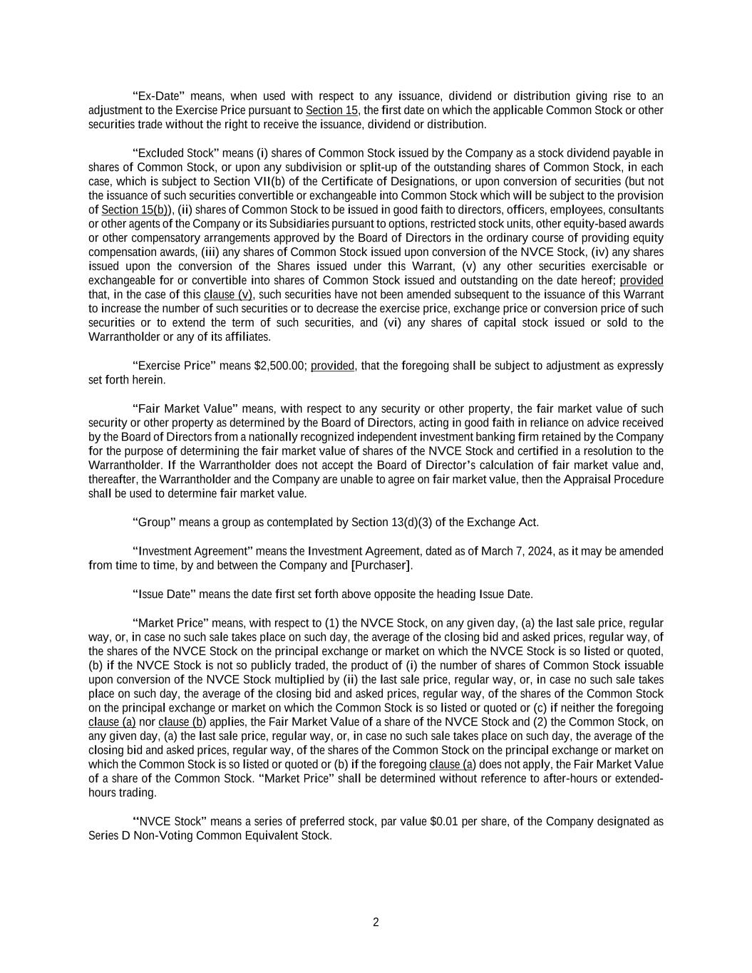2 “Ex-Date” means, when used with respect to any issuance, dividend or distribution giving rise to an adjustment to the Exercise Price pursuant to Section 15, the first date on which the applicable Common Stock or other securities trade without the right to receive the issuance, dividend or distribution. “Excluded Stock” means (i) shares of Common Stock issued by the Company as a stock dividend payable in shares of Common Stock, or upon any subdivision or split-up of the outstanding shares of Common Stock, in each case, which is subject to Section VII(b) of the Certificate of Designations, or upon conversion of securities (but not the issuance of such securities convertible or exchangeable into Common Stock which will be subject to the provision of Section 15(b)), (ii) shares of Common Stock to be issued in good faith to directors, officers, employees, consultants or other agents of the Company or its Subsidiaries pursuant to options, restricted stock units, other equity-based awards or other compensatory arrangements approved by the Board of Directors in the ordinary course of providing equity compensation awards, (iii) any shares of Common Stock issued upon conversion of the NVCE Stock, (iv) any shares issued upon the conversion of the Shares issued under this Warrant, (v) any other securities exercisable or exchangeable for or convertible into shares of Common Stock issued and outstanding on the date hereof; provided that, in the case of this clause (v), such securities have not been amended subsequent to the issuance of this Warrant to increase the number of such securities or to decrease the exercise price, exchange price or conversion price of such securities or to extend the term of such securities, and (vi) any shares of capital stock issued or sold to the Warrantholder or any of its affiliates. “Exercise Price” means $2,500.00; provided, that the foregoing shall be subject to adjustment as expressly set forth herein. “Fair Market Value” means, with respect to any security or other property, the fair market value of such security or other property as determined by the Board of Directors, acting in good faith in reliance on advice received by the Board of Directors from a nationally recognized independent investment banking firm retained by the Company for the purpose of determining the fair market value of shares of the NVCE Stock and certified in a resolution to the Warrantholder. If the Warrantholder does not accept the Board of Director’s calculation of fair market value and, thereafter, the Warrantholder and the Company are unable to agree on fair market value, then the Appraisal Procedure shall be used to determine fair market value. “Group” means a group as contemplated by Section 13(d)(3) of the Exchange Act. “Investment Agreement” means the Investment Agreement, dated as of March 7, 2024, as it may be amended from time to time, by and between the Company and [Purchaser]. “Issue Date” means the date first set forth above opposite the heading Issue Date. “Market Price” means, with respect to (1) the NVCE Stock, on any given day, (a) the last sale price, regular way, or, in case no such sale takes place on such day, the average of the closing bid and asked prices, regular way, of the shares of the NVCE Stock on the principal exchange or market on which the NVCE Stock is so listed or quoted, (b) if the NVCE Stock is not so publicly traded, the product of (i) the number of shares of Common Stock issuable upon conversion of the NVCE Stock multiplied by (ii) the last sale price, regular way, or, in case no such sale takes place on such day, the average of the closing bid and asked prices, regular way, of the shares of the Common Stock on the principal exchange or market on which the Common Stock is so listed or quoted or (c) if neither the foregoing clause (a) nor clause (b) applies, the Fair Market Value of a share of the NVCE Stock and (2) the Common Stock, on any given day, (a) the last sale price, regular way, or, in case no such sale takes place on such day, the average of the closing bid and asked prices, regular way, of the shares of the Common Stock on the principal exchange or market on which the Common Stock is so listed or quoted or (b) if the foregoing clause (a) does not apply, the Fair Market Value of a share of the Common Stock. “Market Price” shall be determined without reference to after-hours or extended- hours trading. “NVCE Stock” means a series of preferred stock, par value $0.01 per share, of the Company designated as Series D Non-Voting Common Equivalent Stock.