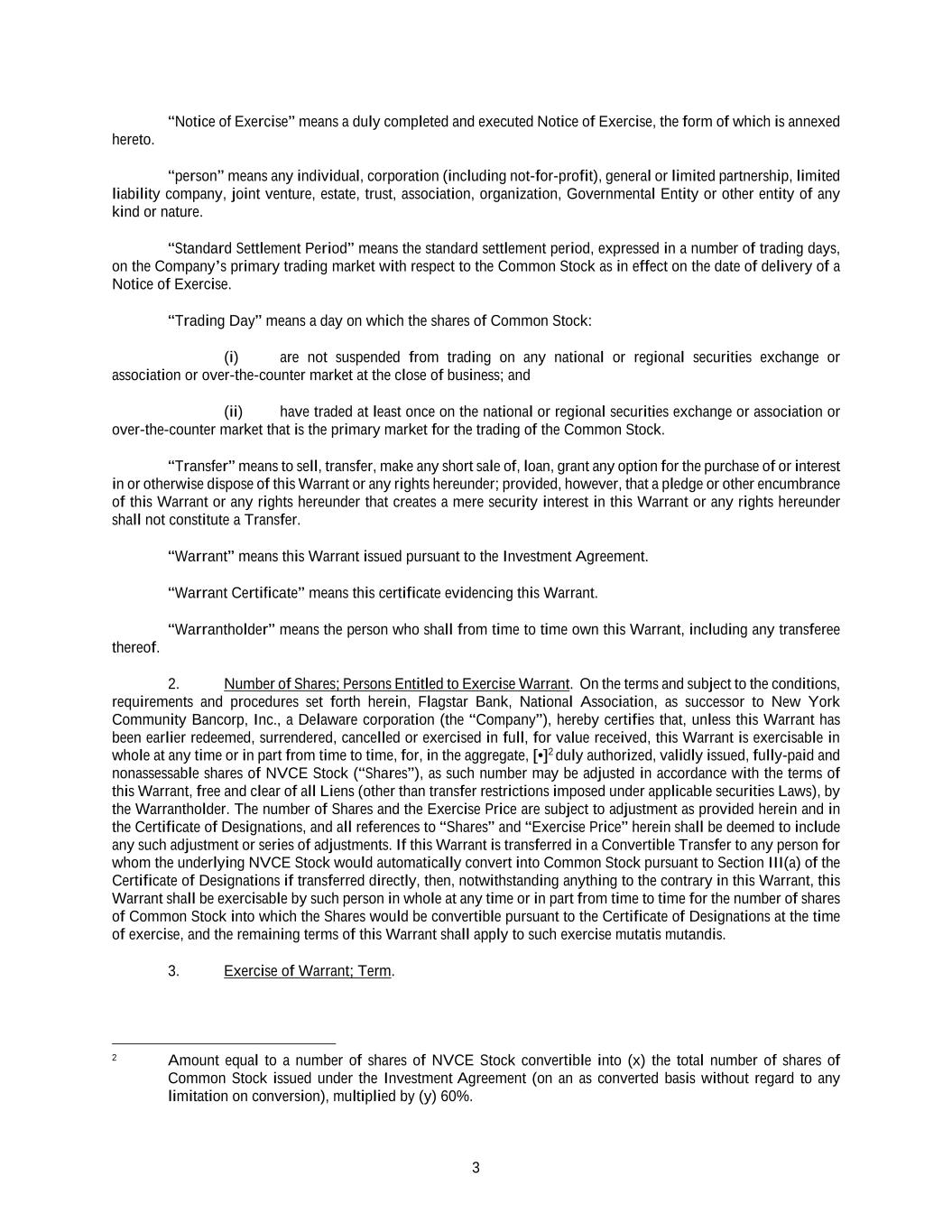 3 “Notice of Exercise” means a duly completed and executed Notice of Exercise, the form of which is annexed hereto. “person” means any individual, corporation (including not-for-profit), general or limited partnership, limited liability company, joint venture, estate, trust, association, organization, Governmental Entity or other entity of any kind or nature. “Standard Settlement Period” means the standard settlement period, expressed in a number of trading days, on the Company’s primary trading market with respect to the Common Stock as in effect on the date of delivery of a Notice of Exercise. “Trading Day” means a day on which the shares of Common Stock: (i) are not suspended from trading on any national or regional securities exchange or association or over-the-counter market at the close of business; and (ii) have traded at least once on the national or regional securities exchange or association or over-the-counter market that is the primary market for the trading of the Common Stock. “Transfer” means to sell, transfer, make any short sale of, loan, grant any option for the purchase of or interest in or otherwise dispose of this Warrant or any rights hereunder; provided, however, that a pledge or other encumbrance of this Warrant or any rights hereunder that creates a mere security interest in this Warrant or any rights hereunder shall not constitute a Transfer. “Warrant” means this Warrant issued pursuant to the Investment Agreement. “Warrant Certificate” means this certificate evidencing this Warrant. “Warrantholder” means the person who shall from time to time own this Warrant, including any transferee thereof. 2. Number of Shares; Persons Entitled to Exercise Warrant. On the terms and subject to the conditions, requirements and procedures set forth herein, Flagstar Bank, National Association, as successor to New York Community Bancorp, Inc., a Delaware corporation (the “Company”), hereby certifies that, unless this Warrant has been earlier redeemed, surrendered, cancelled or exercised in full, for value received, this Warrant is exercisable in whole at any time or in part from time to time, for, in the aggregate, [•]2 duly authorized, validly issued, fully-paid and nonassessable shares of NVCE Stock (“Shares”), as such number may be adjusted in accordance with the terms of this Warrant, free and clear of all Liens (other than transfer restrictions imposed under applicable securities Laws), by the Warrantholder. The number of Shares and the Exercise Price are subject to adjustment as provided herein and in the Certificate of Designations, and all references to “Shares” and “Exercise Price” herein shall be deemed to include any such adjustment or series of adjustments. If this Warrant is transferred in a Convertible Transfer to any person for whom the underlying NVCE Stock would automatically convert into Common Stock pursuant to Section III(a) of the Certificate of Designations if transferred directly, then, notwithstanding anything to the contrary in this Warrant, this Warrant shall be exercisable by such person in whole at any time or in part from time to time for the number of shares of Common Stock into which the Shares would be convertible pursuant to the Certificate of Designations at the time of exercise, and the remaining terms of this Warrant shall apply to such exercise mutatis mutandis. 3. Exercise of Warrant; Term. 2 Amount equal to a number of shares of NVCE Stock convertible into (x) the total number of shares of Common Stock issued under the Investment Agreement (on an as converted basis without regard to any limitation on conversion), multiplied by (y) 60%.