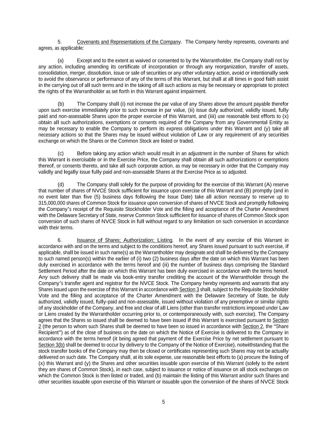 5 5. Covenants and Representations of the Company. The Company hereby represents, covenants and agrees, as applicable: (a) Except and to the extent as waived or consented to by the Warrantholder, the Company shall not by any action, including amending its certificate of incorporation or through any reorganization, transfer of assets, consolidation, merger, dissolution, issue or sale of securities or any other voluntary action, avoid or intentionally seek to avoid the observance or performance of any of the terms of this Warrant, but shall at all times in good faith assist in the carrying out of all such terms and in the taking of all such actions as may be necessary or appropriate to protect the rights of the Warrantholder as set forth in this Warrant against impairment. (b) The Company shall (i) not increase the par value of any Shares above the amount payable therefor upon such exercise immediately prior to such increase in par value, (ii) issue duly authorized, validly issued, fully paid and non-assessable Shares upon the proper exercise of this Warrant, and (iii) use reasonable best efforts to (x) obtain all such authorizations, exemptions or consents required of the Company from any Governmental Entity as may be necessary to enable the Company to perform its express obligations under this Warrant and (y) take all necessary actions so that the Shares may be issued without violation of Law or any requirement of any securities exchange on which the Shares or the Common Stock are listed or traded. (c) Before taking any action which would result in an adjustment in the number of Shares for which this Warrant is exercisable or in the Exercise Price, the Company shall obtain all such authorizations or exemptions thereof, or consents thereto, and take all such corporate action, as may be necessary in order that the Company may validly and legally issue fully paid and non-assessable Shares at the Exercise Price as so adjusted. (d) The Company shall solely for the purpose of providing for the exercise of this Warrant (A) reserve that number of shares of NVCE Stock sufficient for issuance upon exercise of this Warrant and (B) promptly (and in no event later than five (5) business days following the Issue Date) take all action necessary to reserve up to 315,000,000 shares of Common Stock for issuance upon conversion of shares of NVCE Stock and promptly following the Company’s receipt of the Requisite Stockholder Vote and the filing and acceptance of the Charter Amendment with the Delaware Secretary of State, reserve Common Stock sufficient for issuance of shares of Common Stock upon conversion of such shares of NVCE Stock in full without regard to any limitation on such conversion in accordance with their terms. 6. Issuance of Shares; Authorization; Listing. In the event of any exercise of this Warrant in accordance with and on the terms and subject to the conditions hereof, any Shares issued pursuant to such exercise, if applicable, shall be issued in such name(s) as the Warrantholder may designate and shall be delivered by the Company to such named person(s) within the earlier of (i) two (2) business days after the date on which this Warrant has been duly exercised in accordance with the terms hereof and (ii) the number of business days comprising the Standard Settlement Period after the date on which this Warrant has been duly exercised in accordance with the terms hereof. Any such delivery shall be made via book-entry transfer crediting the account of the Warrantholder through the Company’s transfer agent and registrar for the NVCE Stock. The Company hereby represents and warrants that any Shares issued upon the exercise of this Warrant in accordance with Section 3 shall, subject to the Requisite Stockholder Vote and the filing and acceptance of the Charter Amendment with the Delaware Secretary of State, be duly authorized, validly issued, fully-paid and non-assessable, issued without violation of any preemptive or similar rights of any stockholder of the Company, and free and clear of all Liens (other than transfer restrictions imposed under Law or Liens created by the Warrantholder occurring prior to, or contemporaneously with, such exercise). The Company agrees that the Shares so issued shall be deemed to have been issued if this Warrant is exercised pursuant to Section 2 (the person to whom such Shares shall be deemed to have been so issued in accordance with Section 2, the “Share Recipient”) as of the close of business on the date on which the Notice of Exercise is delivered to the Company in accordance with the terms hereof (it being agreed that payment of the Exercise Price by net settlement pursuant to Section 3(b) shall be deemed to occur by delivery to the Company of the Notice of Exercise), notwithstanding that the stock transfer books of the Company may then be closed or certificates representing such Shares may not be actually delivered on such date. The Company shall, at its sole expense, use reasonable best efforts to (a) procure the listing of (x) this Warrant and (y) the Shares and other securities issuable upon exercise of this Warrant (solely to the extent they are shares of Common Stock), in each case, subject to issuance or notice of issuance on all stock exchanges on which the Common Stock is then listed or traded, and (b) maintain the listing of this Warrant and/or such Shares and other securities issuable upon exercise of this Warrant or issuable upon the conversion of the shares of NVCE Stock