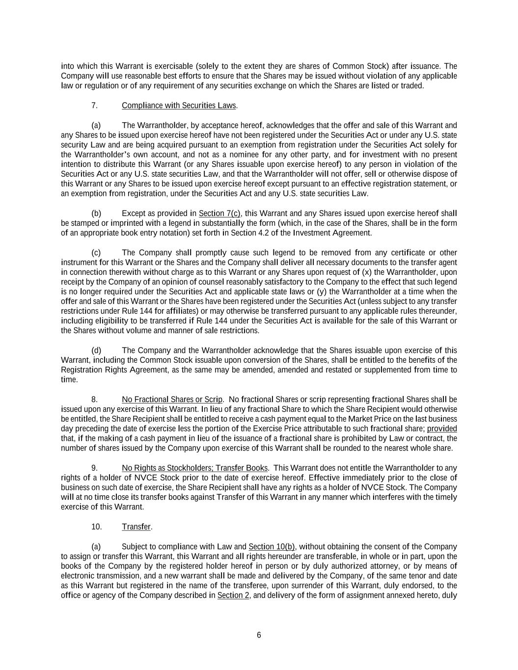 6 into which this Warrant is exercisable (solely to the extent they are shares of Common Stock) after issuance. The Company will use reasonable best efforts to ensure that the Shares may be issued without violation of any applicable law or regulation or of any requirement of any securities exchange on which the Shares are listed or traded. 7. Compliance with Securities Laws. (a) The Warrantholder, by acceptance hereof, acknowledges that the offer and sale of this Warrant and any Shares to be issued upon exercise hereof have not been registered under the Securities Act or under any U.S. state security Law and are being acquired pursuant to an exemption from registration under the Securities Act solely for the Warrantholder’s own account, and not as a nominee for any other party, and for investment with no present intention to distribute this Warrant (or any Shares issuable upon exercise hereof) to any person in violation of the Securities Act or any U.S. state securities Law, and that the Warrantholder will not offer, sell or otherwise dispose of this Warrant or any Shares to be issued upon exercise hereof except pursuant to an effective registration statement, or an exemption from registration, under the Securities Act and any U.S. state securities Law. (b) Except as provided in Section 7(c), this Warrant and any Shares issued upon exercise hereof shall be stamped or imprinted with a legend in substantially the form (which, in the case of the Shares, shall be in the form of an appropriate book entry notation) set forth in Section 4.2 of the Investment Agreement. (c) The Company shall promptly cause such legend to be removed from any certificate or other instrument for this Warrant or the Shares and the Company shall deliver all necessary documents to the transfer agent in connection therewith without charge as to this Warrant or any Shares upon request of (x) the Warrantholder, upon receipt by the Company of an opinion of counsel reasonably satisfactory to the Company to the effect that such legend is no longer required under the Securities Act and applicable state laws or (y) the Warrantholder at a time when the offer and sale of this Warrant or the Shares have been registered under the Securities Act (unless subject to any transfer restrictions under Rule 144 for affiliates) or may otherwise be transferred pursuant to any applicable rules thereunder, including eligibility to be transferred if Rule 144 under the Securities Act is available for the sale of this Warrant or the Shares without volume and manner of sale restrictions. (d) The Company and the Warrantholder acknowledge that the Shares issuable upon exercise of this Warrant, including the Common Stock issuable upon conversion of the Shares, shall be entitled to the benefits of the Registration Rights Agreement, as the same may be amended, amended and restated or supplemented from time to time. 8. No Fractional Shares or Scrip. No fractional Shares or scrip representing fractional Shares shall be issued upon any exercise of this Warrant. In lieu of any fractional Share to which the Share Recipient would otherwise be entitled, the Share Recipient shall be entitled to receive a cash payment equal to the Market Price on the last business day preceding the date of exercise less the portion of the Exercise Price attributable to such fractional share; provided that, if the making of a cash payment in lieu of the issuance of a fractional share is prohibited by Law or contract, the number of shares issued by the Company upon exercise of this Warrant shall be rounded to the nearest whole share. 9. No Rights as Stockholders; Transfer Books. This Warrant does not entitle the Warrantholder to any rights of a holder of NVCE Stock prior to the date of exercise hereof. Effective immediately prior to the close of business on such date of exercise, the Share Recipient shall have any rights as a holder of NVCE Stock. The Company will at no time close its transfer books against Transfer of this Warrant in any manner which interferes with the timely exercise of this Warrant. 10. Transfer. (a) Subject to compliance with Law and Section 10(b), without obtaining the consent of the Company to assign or transfer this Warrant, this Warrant and all rights hereunder are transferable, in whole or in part, upon the books of the Company by the registered holder hereof in person or by duly authorized attorney, or by means of electronic transmission, and a new warrant shall be made and delivered by the Company, of the same tenor and date as this Warrant but registered in the name of the transferee, upon surrender of this Warrant, duly endorsed, to the office or agency of the Company described in Section 2, and delivery of the form of assignment annexed hereto, duly