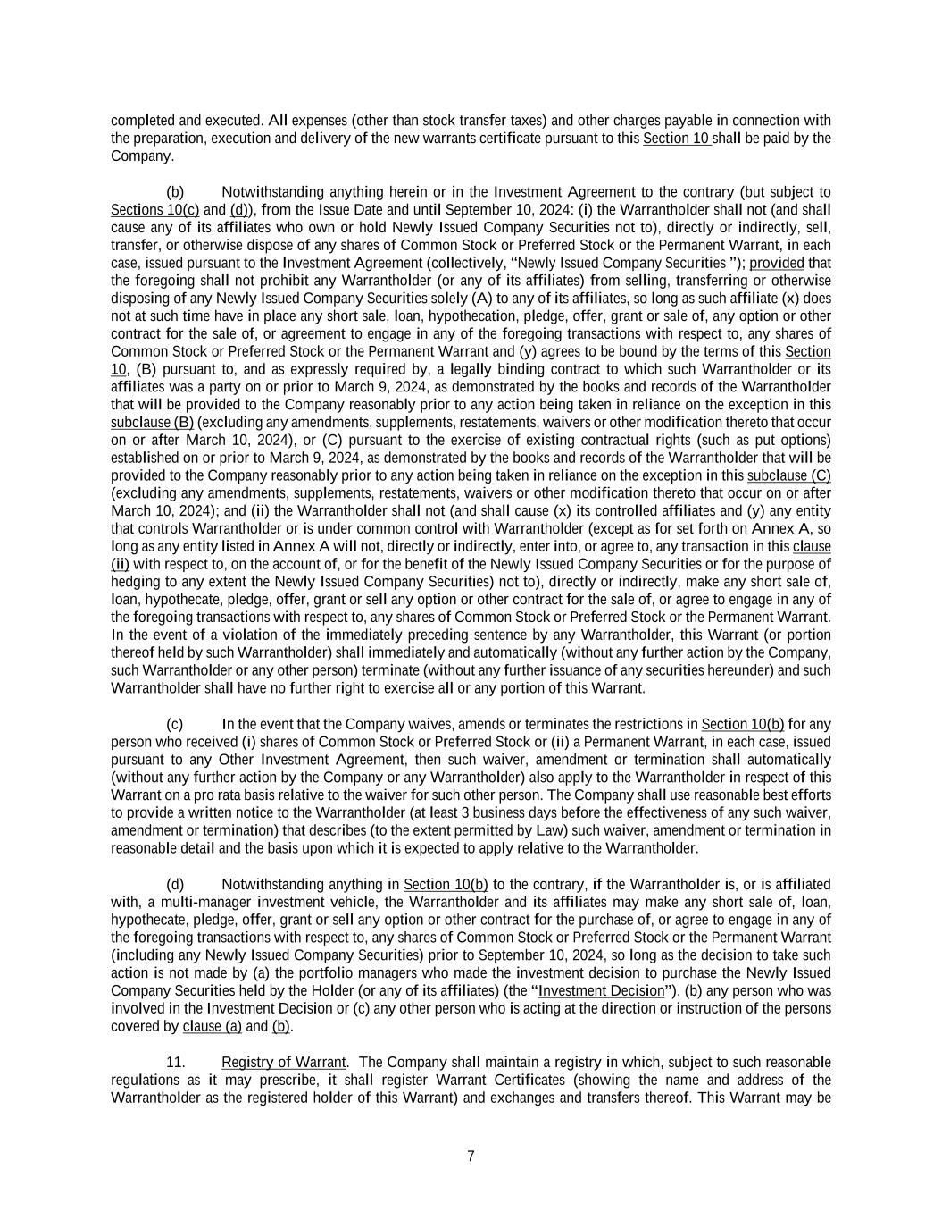 7 completed and executed. All expenses (other than stock transfer taxes) and other charges payable in connection with the preparation, execution and delivery of the new warrants certificate pursuant to this Section 10 shall be paid by the Company. (b) Notwithstanding anything herein or in the Investment Agreement to the contrary (but subject to Sections 10(c) and (d)), from the Issue Date and until September 10, 2024: (i) the Warrantholder shall not (and shall cause any of its affiliates who own or hold Newly Issued Company Securities not to), directly or indirectly, sell, transfer, or otherwise dispose of any shares of Common Stock or Preferred Stock or the Permanent Warrant, in each case, issued pursuant to the Investment Agreement (collectively, “Newly Issued Company Securities ”); provided that the foregoing shall not prohibit any Warrantholder (or any of its affiliates) from selling, transferring or otherwise disposing of any Newly Issued Company Securities solely (A) to any of its affiliates, so long as such affiliate (x) does not at such time have in place any short sale, loan, hypothecation, pledge, offer, grant or sale of, any option or other contract for the sale of, or agreement to engage in any of the foregoing transactions with respect to, any shares of Common Stock or Preferred Stock or the Permanent Warrant and (y) agrees to be bound by the terms of this Section 10, (B) pursuant to, and as expressly required by, a legally binding contract to which such Warrantholder or its affiliates was a party on or prior to March 9, 2024, as demonstrated by the books and records of the Warrantholder that will be provided to the Company reasonably prior to any action being taken in reliance on the exception in this subclause (B) (excluding any amendments, supplements, restatements, waivers or other modification thereto that occur on or after March 10, 2024), or (C) pursuant to the exercise of existing contractual rights (such as put options) established on or prior to March 9, 2024, as demonstrated by the books and records of the Warrantholder that will be provided to the Company reasonably prior to any action being taken in reliance on the exception in this subclause (C) (excluding any amendments, supplements, restatements, waivers or other modification thereto that occur on or after March 10, 2024); and (ii) the Warrantholder shall not (and shall cause (x) its controlled affiliates and (y) any entity that controls Warrantholder or is under common control with Warrantholder (except as for set forth on Annex A, so long as any entity listed in Annex A will not, directly or indirectly, enter into, or agree to, any transaction in this clause (ii) with respect to, on the account of, or for the benefit of the Newly Issued Company Securities or for the purpose of hedging to any extent the Newly Issued Company Securities) not to), directly or indirectly, make any short sale of, loan, hypothecate, pledge, offer, grant or sell any option or other contract for the sale of, or agree to engage in any of the foregoing transactions with respect to, any shares of Common Stock or Preferred Stock or the Permanent Warrant. In the event of a violation of the immediately preceding sentence by any Warrantholder, this Warrant (or portion thereof held by such Warrantholder) shall immediately and automatically (without any further action by the Company, such Warrantholder or any other person) terminate (without any further issuance of any securities hereunder) and such Warrantholder shall have no further right to exercise all or any portion of this Warrant. (c) In the event that the Company waives, amends or terminates the restrictions in Section 10(b) for any person who received (i) shares of Common Stock or Preferred Stock or (ii) a Permanent Warrant, in each case, issued pursuant to any Other Investment Agreement, then such waiver, amendment or termination shall automatically (without any further action by the Company or any Warrantholder) also apply to the Warrantholder in respect of this Warrant on a pro rata basis relative to the waiver for such other person. The Company shall use reasonable best efforts to provide a written notice to the Warrantholder (at least 3 business days before the effectiveness of any such waiver, amendment or termination) that describes (to the extent permitted by Law) such waiver, amendment or termination in reasonable detail and the basis upon which it is expected to apply relative to the Warrantholder. (d) Notwithstanding anything in Section 10(b) to the contrary, if the Warrantholder is, or is affiliated with, a multi-manager investment vehicle, the Warrantholder and its affiliates may make any short sale of, loan, hypothecate, pledge, offer, grant or sell any option or other contract for the purchase of, or agree to engage in any of the foregoing transactions with respect to, any shares of Common Stock or Preferred Stock or the Permanent Warrant (including any Newly Issued Company Securities) prior to September 10, 2024, so long as the decision to take such action is not made by (a) the portfolio managers who made the investment decision to purchase the Newly Issued Company Securities held by the Holder (or any of its affiliates) (the “Investment Decision”), (b) any person who was involved in the Investment Decision or (c) any other person who is acting at the direction or instruction of the persons covered by clause (a) and (b). 11. Registry of Warrant. The Company shall maintain a registry in which, subject to such reasonable regulations as it may prescribe, it shall register Warrant Certificates (showing the name and address of the Warrantholder as the registered holder of this Warrant) and exchanges and transfers thereof. This Warrant may be