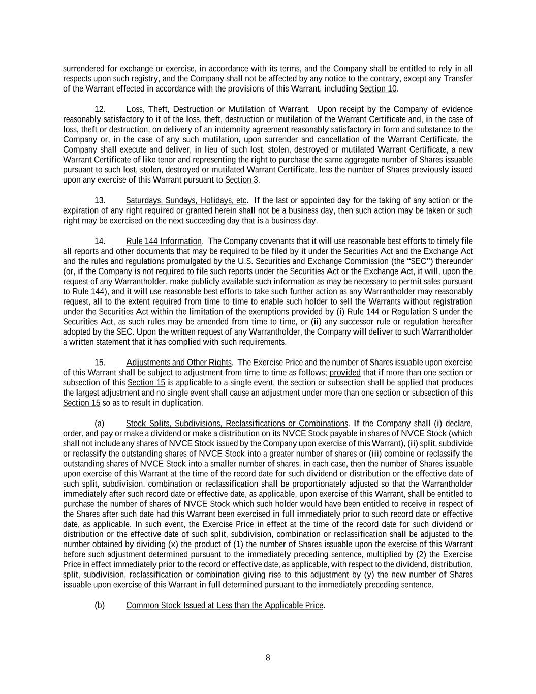 8 surrendered for exchange or exercise, in accordance with its terms, and the Company shall be entitled to rely in all respects upon such registry, and the Company shall not be affected by any notice to the contrary, except any Transfer of the Warrant effected in accordance with the provisions of this Warrant, including Section 10. 12. Loss, Theft, Destruction or Mutilation of Warrant. Upon receipt by the Company of evidence reasonably satisfactory to it of the loss, theft, destruction or mutilation of the Warrant Certificate and, in the case of loss, theft or destruction, on delivery of an indemnity agreement reasonably satisfactory in form and substance to the Company or, in the case of any such mutilation, upon surrender and cancellation of the Warrant Certificate, the Company shall execute and deliver, in lieu of such lost, stolen, destroyed or mutilated Warrant Certificate, a new Warrant Certificate of like tenor and representing the right to purchase the same aggregate number of Shares issuable pursuant to such lost, stolen, destroyed or mutilated Warrant Certificate, less the number of Shares previously issued upon any exercise of this Warrant pursuant to Section 3. 13. Saturdays, Sundays, Holidays, etc. If the last or appointed day for the taking of any action or the expiration of any right required or granted herein shall not be a business day, then such action may be taken or such right may be exercised on the next succeeding day that is a business day. 14. Rule 144 Information. The Company covenants that it will use reasonable best efforts to timely file all reports and other documents that may be required to be filed by it under the Securities Act and the Exchange Act and the rules and regulations promulgated by the U.S. Securities and Exchange Commission (the “SEC”) thereunder (or, if the Company is not required to file such reports under the Securities Act or the Exchange Act, it will, upon the request of any Warrantholder, make publicly available such information as may be necessary to permit sales pursuant to Rule 144), and it will use reasonable best efforts to take such further action as any Warrantholder may reasonably request, all to the extent required from time to time to enable such holder to sell the Warrants without registration under the Securities Act within the limitation of the exemptions provided by (i) Rule 144 or Regulation S under the Securities Act, as such rules may be amended from time to time, or (ii) any successor rule or regulation hereafter adopted by the SEC. Upon the written request of any Warrantholder, the Company will deliver to such Warrantholder a written statement that it has complied with such requirements. 15. Adjustments and Other Rights. The Exercise Price and the number of Shares issuable upon exercise of this Warrant shall be subject to adjustment from time to time as follows; provided that if more than one section or subsection of this Section 15 is applicable to a single event, the section or subsection shall be applied that produces the largest adjustment and no single event shall cause an adjustment under more than one section or subsection of this Section 15 so as to result in duplication. (a) Stock Splits, Subdivisions, Reclassifications or Combinations. If the Company shall (i) declare, order, and pay or make a dividend or make a distribution on its NVCE Stock payable in shares of NVCE Stock (which shall not include any shares of NVCE Stock issued by the Company upon exercise of this Warrant), (ii) split, subdivide or reclassify the outstanding shares of NVCE Stock into a greater number of shares or (iii) combine or reclassify the outstanding shares of NVCE Stock into a smaller number of shares, in each case, then the number of Shares issuable upon exercise of this Warrant at the time of the record date for such dividend or distribution or the effective date of such split, subdivision, combination or reclassification shall be proportionately adjusted so that the Warrantholder immediately after such record date or effective date, as applicable, upon exercise of this Warrant, shall be entitled to purchase the number of shares of NVCE Stock which such holder would have been entitled to receive in respect of the Shares after such date had this Warrant been exercised in full immediately prior to such record date or effective date, as applicable. In such event, the Exercise Price in effect at the time of the record date for such dividend or distribution or the effective date of such split, subdivision, combination or reclassification shall be adjusted to the number obtained by dividing (x) the product of (1) the number of Shares issuable upon the exercise of this Warrant before such adjustment determined pursuant to the immediately preceding sentence, multiplied by (2) the Exercise Price in effect immediately prior to the record or effective date, as applicable, with respect to the dividend, distribution, split, subdivision, reclassification or combination giving rise to this adjustment by (y) the new number of Shares issuable upon exercise of this Warrant in full determined pursuant to the immediately preceding sentence. (b) Common Stock Issued at Less than the Applicable Price.