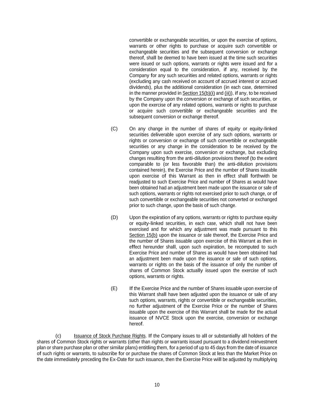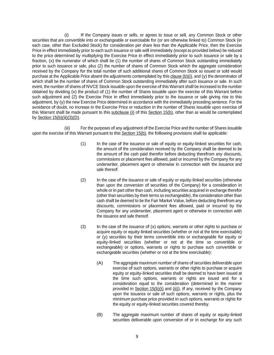 9 (i) If the Company issues or sells, or agrees to issue or sell, any Common Stock or other securities that are convertible into or exchangeable or exercisable for (or are otherwise linked to) Common Stock (in each case, other than Excluded Stock) for consideration per share less than the Applicable Price, then the Exercise Price in effect immediately prior to each such issuance or sale will immediately (except as provided below) be reduced to the price determined by multiplying the Exercise Price in effect immediately prior to such issuance or sale by a fraction, (x) the numerator of which shall be (1) the number of shares of Common Stock outstanding immediately prior to such issuance or sale, plus (2) the number of shares of Common Stock which the aggregate consideration received by the Company for the total number of such additional shares of Common Stock so issued or sold would purchase at the Applicable Price absent the adjustments contemplated by this clause (b)(i), and (y) the denominator of which shall be the number of shares of Common Stock outstanding immediately after such issuance or sale. In such event, the number of shares of NVCE Stock issuable upon the exercise of this Warrant shall be increased to the number obtained by dividing (x) the product of (1) the number of Shares issuable upon the exercise of this Warrant before such adjustment and (2) the Exercise Price in effect immediately prior to the issuance or sale giving rise to this adjustment, by (y) the new Exercise Price determined in accordance with the immediately preceding sentence. For the avoidance of doubt, no increase in the Exercise Price or reduction in the number of Shares issuable upon exercise of this Warrant shall be made pursuant to this subclause (i) of this Section 15(b), other than as would be contemplated by Section 15(b)(ii)(3)(D). (ii) For the purposes of any adjustment of the Exercise Price and the number of Shares issuable upon the exercise of this Warrant pursuant to this Section 15(b), the following provisions shall be applicable: (1) In the case of the issuance or sale of equity or equity-linked securities for cash, the amount of the consideration received by the Company shall be deemed to be the amount of the cash paid therefor before deducting therefrom any discounts, commissions or placement fees allowed, paid or incurred by the Company for any underwriter, placement agent or otherwise in connection with the issuance and sale thereof. (2) In the case of the issuance or sale of equity or equity-linked securities (otherwise than upon the conversion of securities of the Company) for a consideration in whole or in part other than cash, including securities acquired in exchange therefor (other than securities by their terms so exchangeable), the consideration other than cash shall be deemed to be the Fair Market Value, before deducting therefrom any discounts, commissions or placement fees allowed, paid or incurred by the Company for any underwriter, placement agent or otherwise in connection with the issuance and sale thereof. (3) In the case of the issuance of (x) options, warrants or other rights to purchase or acquire equity or equity-linked securities (whether or not at the time exercisable) or (y) securities by their terms convertible into or exchangeable for equity or equity-linked securities (whether or not at the time so convertible or exchangeable) or options, warrants or rights to purchase such convertible or exchangeable securities (whether or not at the time exercisable): (A) The aggregate maximum number of shares of securities deliverable upon exercise of such options, warrants or other rights to purchase or acquire equity or equity-linked securities shall be deemed to have been issued at the time such options, warrants or rights are issued and for a consideration equal to the consideration (determined in the manner provided in Section 15(b)(i) and (ii)), if any, received by the Company upon the issuance or sale of such options, warrants or rights, plus the minimum purchase price provided in such options, warrants or rights for the equity or equity-linked securities covered thereby. (B) The aggregate maximum number of shares of equity or equity-linked securities deliverable upon conversion of or in exchange for any such