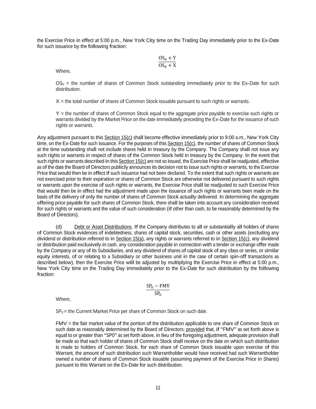 11 the Exercise Price in effect at 5:00 p.m., New York City time on the Trading Day immediately prior to the Ex-Date for such issuance by the following fraction: OS0 + Y OS0 + X Where, OS0 = the number of shares of Common Stock outstanding immediately prior to the Ex-Date for such distribution. X = the total number of shares of Common Stock issuable pursuant to such rights or warrants. Y = the number of shares of Common Stock equal to the aggregate price payable to exercise such rights or warrants divided by the Market Price on the date immediately preceding the Ex-Date for the issuance of such rights or warrants. Any adjustment pursuant to this Section 15(c) shall become effective immediately prior to 9:00 a.m., New York City time, on the Ex-Date for such issuance. For the purposes of this Section 15(c), the number of shares of Common Stock at the time outstanding shall not include shares held in treasury by the Company. The Company shall not issue any such rights or warrants in respect of shares of the Common Stock held in treasury by the Company. In the event that such rights or warrants described in this Section 15(c) are not so issued, the Exercise Price shall be readjusted, effective as of the date the Board of Directors publicly announces its decision not to issue such rights or warrants, to the Exercise Price that would then be in effect if such issuance had not been declared. To the extent that such rights or warrants are not exercised prior to their expiration or shares of Common Stock are otherwise not delivered pursuant to such rights or warrants upon the exercise of such rights or warrants, the Exercise Price shall be readjusted to such Exercise Price that would then be in effect had the adjustment made upon the issuance of such rights or warrants been made on the basis of the delivery of only the number of shares of Common Stock actually delivered. In determining the aggregate offering price payable for such shares of Common Stock, there shall be taken into account any consideration received for such rights or warrants and the value of such consideration (if other than cash, to be reasonably determined by the Board of Directors). (d) Debt or Asset Distributions. If the Company distributes to all or substantially all holders of shares of Common Stock evidences of indebtedness, shares of capital stock, securities, cash or other assets (excluding any dividend or distribution referred to in Section 15(a), any rights or warrants referred to in Section 15(c), any dividend or distribution paid exclusively in cash, any consideration payable in connection with a tender or exchange offer made by the Company or any of its Subsidiaries, and any dividend of shares of capital stock of any class or series, or similar equity interests, of or relating to a Subsidiary or other business unit in the case of certain spin-off transactions as described below), then the Exercise Price will be adjusted by multiplying the Exercise Price in effect at 5:00 p.m., New York City time on the Trading Day immediately prior to the Ex-Date for such distribution by the following fraction: SP0 − FMV SP0 Where, SP0 = the Current Market Price per share of Common Stock on such date. FMV = the fair market value of the portion of the distribution applicable to one share of Common Stock on such date as reasonably determined by the Board of Directors; provided that, if “FMV” as set forth above is equal to or greater than “SP0” as set forth above, in lieu of the foregoing adjustment, adequate provision shall be made so that each holder of shares of Common Stock shall receive on the date on which such distribution is made to holders of Common Stock, for each share of Common Stock issuable upon exercise of this Warrant, the amount of such distribution such Warrantholder would have received had such Warrantholder owned a number of shares of Common Stock issuable (assuming payment of the Exercise Price in Shares) pursuant to this Warrant on the Ex-Date for such distribution.