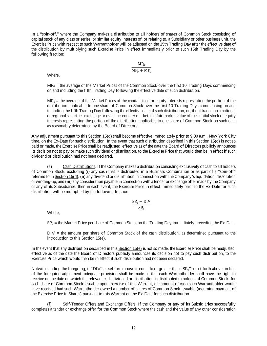 12 In a “spin-off,” where the Company makes a distribution to all holders of shares of Common Stock consisting of capital stock of any class or series, or similar equity interests of, or relating to, a Subsidiary or other business unit, the Exercise Price with respect to such Warrantholder will be adjusted on the 15th Trading Day after the effective date of the distribution by multiplying such Exercise Price in effect immediately prior to such 15th Trading Day by the following fraction: MP0 MP0 + MPs Where, MP0 = the average of the Market Prices of the Common Stock over the first 10 Trading Days commencing on and including the fifth Trading Day following the effective date of such distribution. MPS = the average of the Market Prices of the capital stock or equity interests representing the portion of the distribution applicable to one share of Common Stock over the first 10 Trading Days commencing on and including the fifth Trading Day following the effective date of such distribution, or, if not traded on a national or regional securities exchange or over-the-counter market, the fair market value of the capital stock or equity interests representing the portion of the distribution applicable to one share of Common Stock on such date as reasonably determined by the Board of Directors. Any adjustment pursuant to this Section 15(d) shall become effective immediately prior to 9:00 a.m., New York City time, on the Ex-Date for such distribution. In the event that such distribution described in this Section 15(d) is not so paid or made, the Exercise Price shall be readjusted, effective as of the date the Board of Directors publicly announces its decision not to pay or make such dividend or distribution, to the Exercise Price that would then be in effect if such dividend or distribution had not been declared. (e) Cash Distributions. If the Company makes a distribution consisting exclusively of cash to all holders of Common Stock, excluding (i) any cash that is distributed in a Business Combination or as part of a “spin-off” referred to in Section 15(d), (ii) any dividend or distribution in connection with the Company’s liquidation, dissolution or winding-up, and (iii) any consideration payable in connection with a tender or exchange offer made by the Company or any of its Subsidiaries, then in each event, the Exercise Price in effect immediately prior to the Ex-Date for such distribution will be multiplied by the following fraction: SP0 − DIV SP0 Where, SP0 = the Market Price per share of Common Stock on the Trading Day immediately preceding the Ex-Date. DIV = the amount per share of Common Stock of the cash distribution, as determined pursuant to the introduction to this Section 15(e). In the event that any distribution described in this Section 15(e) is not so made, the Exercise Price shall be readjusted, effective as of the date the Board of Directors publicly announces its decision not to pay such distribution, to the Exercise Price which would then be in effect if such distribution had not been declared. Notwithstanding the foregoing, if “DIV” as set forth above is equal to or greater than “SP0” as set forth above, in lieu of the foregoing adjustment, adequate provision shall be made so that each Warrantholder shall have the right to receive on the date on which the relevant cash dividend or distribution is distributed to holders of Common Stock, for each share of Common Stock issuable upon exercise of this Warrant, the amount of cash such Warrantholder would have received had such Warrantholder owned a number of shares of Common Stock issuable (assuming payment of the Exercise Price in Shares) pursuant to this Warrant on the Ex-Date for such distribution. (f) Self-Tender Offers and Exchange Offers. If the Company or any of its Subsidiaries successfully completes a tender or exchange offer for the Common Stock where the cash and the value of any other consideration