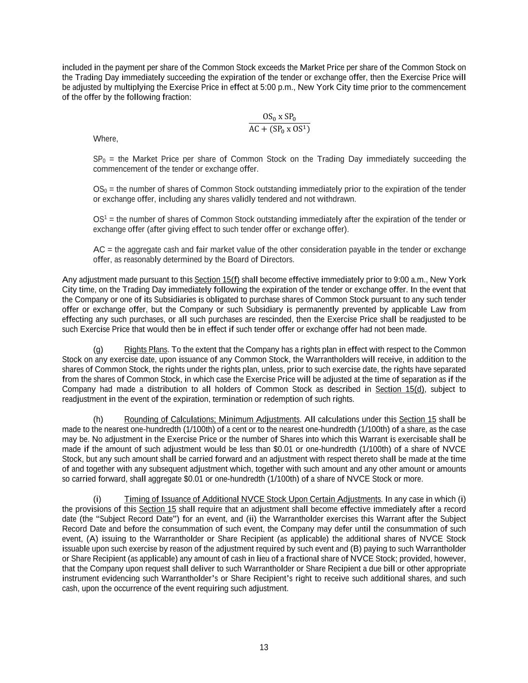 13 included in the payment per share of the Common Stock exceeds the Market Price per share of the Common Stock on the Trading Day immediately succeeding the expiration of the tender or exchange offer, then the Exercise Price will be adjusted by multiplying the Exercise Price in effect at 5:00 p.m., New York City time prior to the commencement of the offer by the following fraction: OS0 x SP0 AC + (SP0 x OS1) Where, SP0 = the Market Price per share of Common Stock on the Trading Day immediately succeeding the commencement of the tender or exchange offer. OS0 = the number of shares of Common Stock outstanding immediately prior to the expiration of the tender or exchange offer, including any shares validly tendered and not withdrawn. OS1 = the number of shares of Common Stock outstanding immediately after the expiration of the tender or exchange offer (after giving effect to such tender offer or exchange offer). AC = the aggregate cash and fair market value of the other consideration payable in the tender or exchange offer, as reasonably determined by the Board of Directors. Any adjustment made pursuant to this Section 15(f) shall become effective immediately prior to 9:00 a.m., New York City time, on the Trading Day immediately following the expiration of the tender or exchange offer. In the event that the Company or one of its Subsidiaries is obligated to purchase shares of Common Stock pursuant to any such tender offer or exchange offer, but the Company or such Subsidiary is permanently prevented by applicable Law from effecting any such purchases, or all such purchases are rescinded, then the Exercise Price shall be readjusted to be such Exercise Price that would then be in effect if such tender offer or exchange offer had not been made. (g) Rights Plans. To the extent that the Company has a rights plan in effect with respect to the Common Stock on any exercise date, upon issuance of any Common Stock, the Warrantholders will receive, in addition to the shares of Common Stock, the rights under the rights plan, unless, prior to such exercise date, the rights have separated from the shares of Common Stock, in which case the Exercise Price will be adjusted at the time of separation as if the Company had made a distribution to all holders of Common Stock as described in Section 15(d), subject to readjustment in the event of the expiration, termination or redemption of such rights. (h) Rounding of Calculations; Minimum Adjustments. All calculations under this Section 15 shall be made to the nearest one-hundredth (1/100th) of a cent or to the nearest one-hundredth (1/100th) of a share, as the case may be. No adjustment in the Exercise Price or the number of Shares into which this Warrant is exercisable shall be made if the amount of such adjustment would be less than $0.01 or one-hundredth (1/100th) of a share of NVCE Stock, but any such amount shall be carried forward and an adjustment with respect thereto shall be made at the time of and together with any subsequent adjustment which, together with such amount and any other amount or amounts so carried forward, shall aggregate $0.01 or one-hundredth (1/100th) of a share of NVCE Stock or more. (i) Timing of Issuance of Additional NVCE Stock Upon Certain Adjustments. In any case in which (i) the provisions of this Section 15 shall require that an adjustment shall become effective immediately after a record date (the “Subject Record Date”) for an event, and (ii) the Warrantholder exercises this Warrant after the Subject Record Date and before the consummation of such event, the Company may defer until the consummation of such event, (A) issuing to the Warrantholder or Share Recipient (as applicable) the additional shares of NVCE Stock issuable upon such exercise by reason of the adjustment required by such event and (B) paying to such Warrantholder or Share Recipient (as applicable) any amount of cash in lieu of a fractional share of NVCE Stock; provided, however, that the Company upon request shall deliver to such Warrantholder or Share Recipient a due bill or other appropriate instrument evidencing such Warrantholder’s or Share Recipient’s right to receive such additional shares, and such cash, upon the occurrence of the event requiring such adjustment.