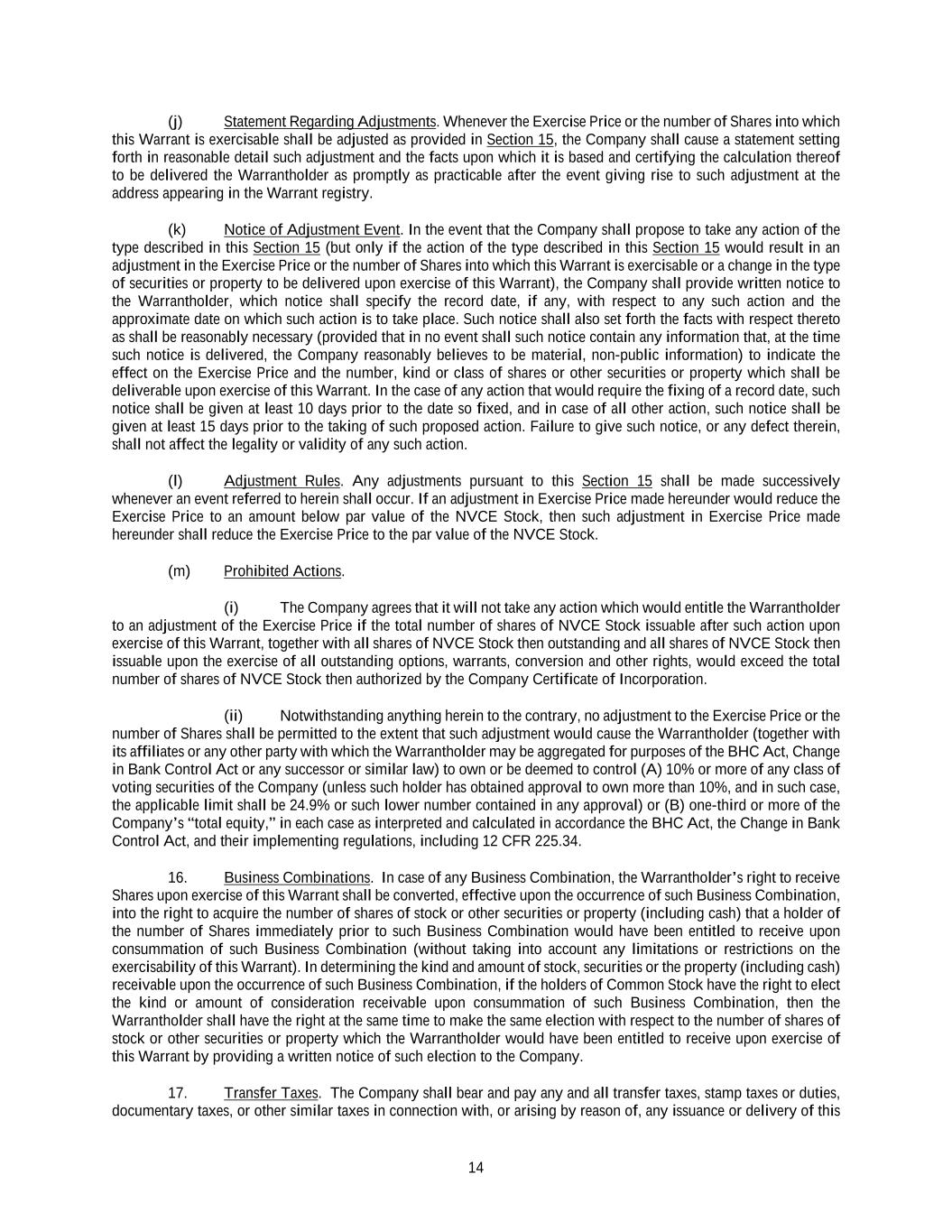 14 (j) Statement Regarding Adjustments. Whenever the Exercise Price or the number of Shares into which this Warrant is exercisable shall be adjusted as provided in Section 15, the Company shall cause a statement setting forth in reasonable detail such adjustment and the facts upon which it is based and certifying the calculation thereof to be delivered the Warrantholder as promptly as practicable after the event giving rise to such adjustment at the address appearing in the Warrant registry. (k) Notice of Adjustment Event. In the event that the Company shall propose to take any action of the type described in this Section 15 (but only if the action of the type described in this Section 15 would result in an adjustment in the Exercise Price or the number of Shares into which this Warrant is exercisable or a change in the type of securities or property to be delivered upon exercise of this Warrant), the Company shall provide written notice to the Warrantholder, which notice shall specify the record date, if any, with respect to any such action and the approximate date on which such action is to take place. Such notice shall also set forth the facts with respect thereto as shall be reasonably necessary (provided that in no event shall such notice contain any information that, at the time such notice is delivered, the Company reasonably believes to be material, non-public information) to indicate the effect on the Exercise Price and the number, kind or class of shares or other securities or property which shall be deliverable upon exercise of this Warrant. In the case of any action that would require the fixing of a record date, such notice shall be given at least 10 days prior to the date so fixed, and in case of all other action, such notice shall be given at least 15 days prior to the taking of such proposed action. Failure to give such notice, or any defect therein, shall not affect the legality or validity of any such action. (l) Adjustment Rules. Any adjustments pursuant to this Section 15 shall be made successively whenever an event referred to herein shall occur. If an adjustment in Exercise Price made hereunder would reduce the Exercise Price to an amount below par value of the NVCE Stock, then such adjustment in Exercise Price made hereunder shall reduce the Exercise Price to the par value of the NVCE Stock. (m) Prohibited Actions. (i) The Company agrees that it will not take any action which would entitle the Warrantholder to an adjustment of the Exercise Price if the total number of shares of NVCE Stock issuable after such action upon exercise of this Warrant, together with all shares of NVCE Stock then outstanding and all shares of NVCE Stock then issuable upon the exercise of all outstanding options, warrants, conversion and other rights, would exceed the total number of shares of NVCE Stock then authorized by the Company Certificate of Incorporation. (ii) Notwithstanding anything herein to the contrary, no adjustment to the Exercise Price or the number of Shares shall be permitted to the extent that such adjustment would cause the Warrantholder (together with its affiliates or any other party with which the Warrantholder may be aggregated for purposes of the BHC Act, Change in Bank Control Act or any successor or similar law) to own or be deemed to control (A) 10% or more of any class of voting securities of the Company (unless such holder has obtained approval to own more than 10%, and in such case, the applicable limit shall be 24.9% or such lower number contained in any approval) or (B) one-third or more of the Company’s “total equity,” in each case as interpreted and calculated in accordance the BHC Act, the Change in Bank Control Act, and their implementing regulations, including 12 CFR 225.34. 16. Business Combinations. In case of any Business Combination, the Warrantholder’s right to receive Shares upon exercise of this Warrant shall be converted, effective upon the occurrence of such Business Combination, into the right to acquire the number of shares of stock or other securities or property (including cash) that a holder of the number of Shares immediately prior to such Business Combination would have been entitled to receive upon consummation of such Business Combination (without taking into account any limitations or restrictions on the exercisability of this Warrant). In determining the kind and amount of stock, securities or the property (including cash) receivable upon the occurrence of such Business Combination, if the holders of Common Stock have the right to elect the kind or amount of consideration receivable upon consummation of such Business Combination, then the Warrantholder shall have the right at the same time to make the same election with respect to the number of shares of stock or other securities or property which the Warrantholder would have been entitled to receive upon exercise of this Warrant by providing a written notice of such election to the Company. 17. Transfer Taxes. The Company shall bear and pay any and all transfer taxes, stamp taxes or duties, documentary taxes, or other similar taxes in connection with, or arising by reason of, any issuance or delivery of this