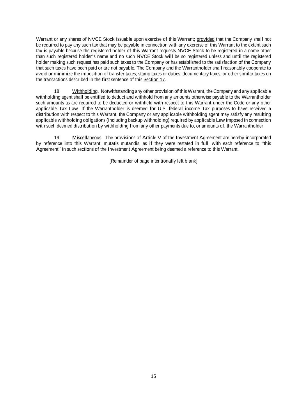15 Warrant or any shares of NVCE Stock issuable upon exercise of this Warrant; provided that the Company shall not be required to pay any such tax that may be payable in connection with any exercise of this Warrant to the extent such tax is payable because the registered holder of this Warrant requests NVCE Stock to be registered in a name other than such registered holder’s name and no such NVCE Stock will be so registered unless and until the registered holder making such request has paid such taxes to the Company or has established to the satisfaction of the Company that such taxes have been paid or are not payable. The Company and the Warrantholder shall reasonably cooperate to avoid or minimize the imposition of transfer taxes, stamp taxes or duties, documentary taxes, or other similar taxes on the transactions described in the first sentence of this Section 17. 18. Withholding. Notwithstanding any other provision of this Warrant, the Company and any applicable withholding agent shall be entitled to deduct and withhold from any amounts otherwise payable to the Warrantholder such amounts as are required to be deducted or withheld with respect to this Warrant under the Code or any other applicable Tax Law. If the Warrantholder is deemed for U.S. federal income Tax purposes to have received a distribution with respect to this Warrant, the Company or any applicable withholding agent may satisfy any resulting applicable withholding obligations (including backup withholding) required by applicable Law imposed in connection with such deemed distribution by withholding from any other payments due to, or amounts of, the Warrantholder. 19. Miscellaneous. The provisions of Article V of the Investment Agreement are hereby incorporated by reference into this Warrant, mutatis mutandis, as if they were restated in full, with each reference to “this Agreement” in such sections of the Investment Agreement being deemed a reference to this Warrant. [Remainder of page intentionally left blank]