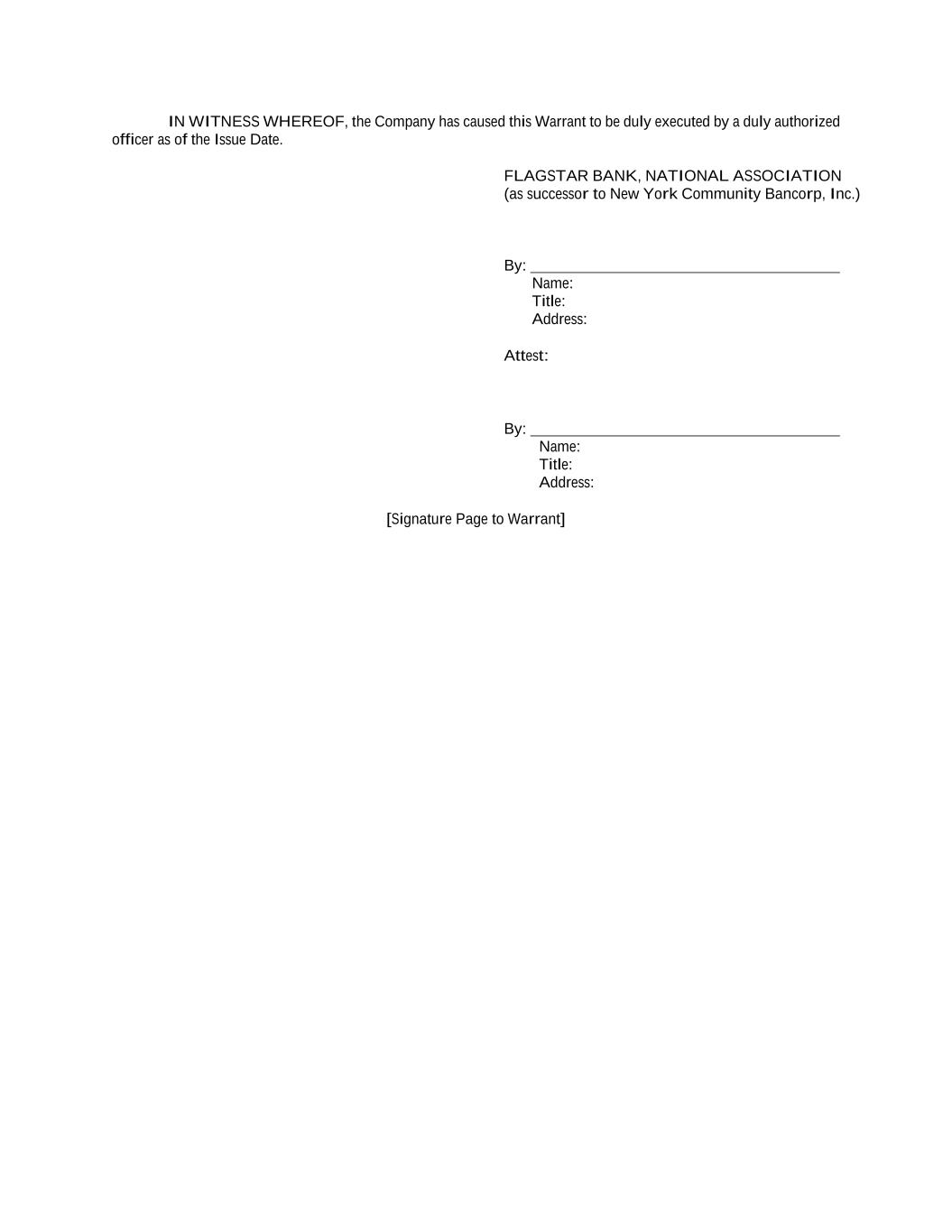 IN WITNESS WHEREOF, the Company has caused this Warrant to be duly executed by a duly authorized officer as of the Issue Date. FLAGSTAR BANK, NATIONAL ASSOCIATION (as successor to New York Community Bancorp, Inc.) By: Name: Title: Address: Attest: By: Name: Title: Address: [Signature Page to Warrant]