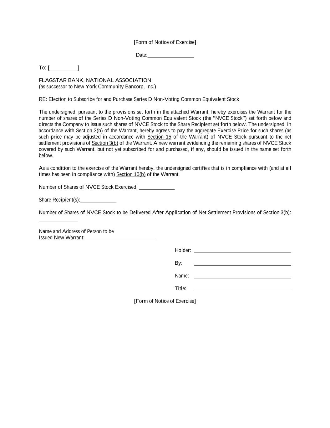 [Form of Notice of Exercise] Date: To: [ ] FLAGSTAR BANK, NATIONAL ASSOCIATION (as successor to New York Community Bancorp, Inc.) RE: Election to Subscribe for and Purchase Series D Non-Voting Common Equivalent Stock The undersigned, pursuant to the provisions set forth in the attached Warrant, hereby exercises the Warrant for the number of shares of the Series D Non-Voting Common Equivalent Stock (the “NVCE Stock”) set forth below and directs the Company to issue such shares of NVCE Stock to the Share Recipient set forth below. The undersigned, in accordance with Section 3(b) of the Warrant, hereby agrees to pay the aggregate Exercise Price for such shares (as such price may be adjusted in accordance with Section 15 of the Warrant) of NVCE Stock pursuant to the net settlement provisions of Section 3(b) of the Warrant. A new warrant evidencing the remaining shares of NVCE Stock covered by such Warrant, but not yet subscribed for and purchased, if any, should be issued in the name set forth below. As a condition to the exercise of the Warrant hereby, the undersigned certifies that is in compliance with (and at all times has been in compliance with) Section 10(b) of the Warrant. Number of Shares of NVCE Stock Exercised: Share Recipient(s): Number of Shares of NVCE Stock to be Delivered After Application of Net Settlement Provisions of Section 3(b): Name and Address of Person to be Issued New Warrant: Holder: By: Name: Title: [Form of Notice of Exercise]
