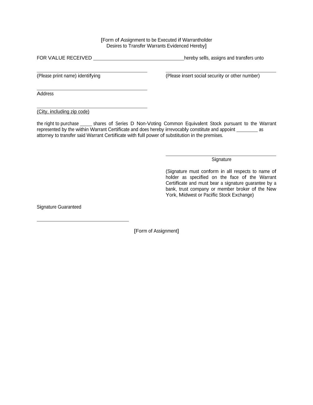 [Form of Assignment to be Executed if Warrantholder Desires to Transfer Warrants Evidenced Hereby] FOR VALUE RECEIVED hereby sells, assigns and transfers unto (Please print name) identifying (Please insert social security or other number) Address (City, including zip code) the right to purchase shares of Series D Non-Voting Common Equivalent Stock pursuant to the Warrant represented by the within Warrant Certificate and does hereby irrevocably constitute and appoint as attorney to transfer said Warrant Certificate with full power of substitution in the premises. Signature (Signature must conform in all respects to name of holder as specified on the face of the Warrant Certificate and must bear a signature guarantee by a bank, trust company or member broker of the New York, Midwest or Pacific Stock Exchange) Signature Guaranteed [Form of Assignment]