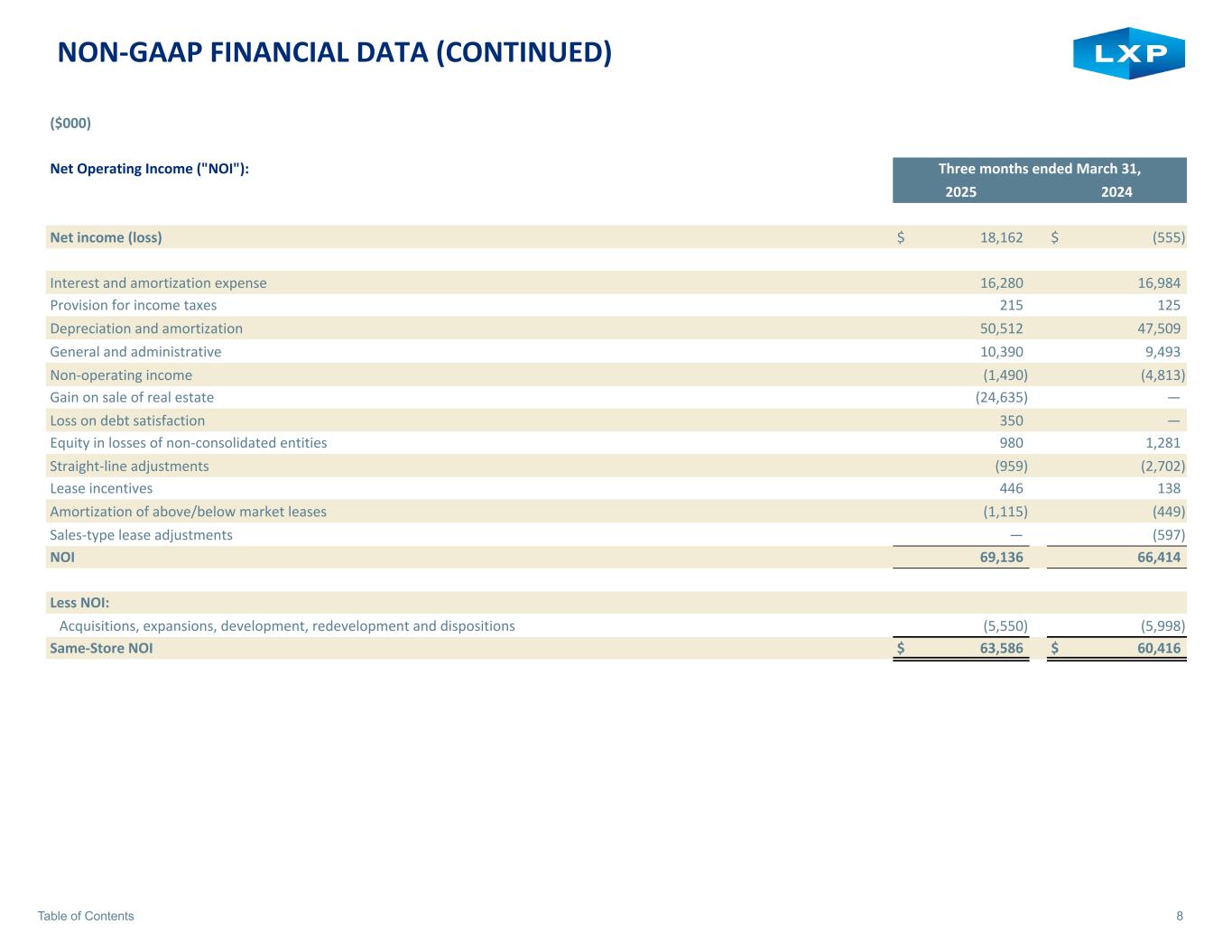 8Table of Contents NON-GAAP FINANCIAL DATA (CONTINUED) ($000) Net Operating Income ("NOI"): Three months ended March 31, 2025 2024 Net income (loss) $ 18,162 $ (555) Interest and amortization expense 16,280 16,984 Provision for income taxes 215 125 Depreciation and amortization 50,512 47,509 General and administrative 10,390 9,493 Non-operating income (1,490) (4,813) Gain on sale of real estate (24,635) — Loss on debt satisfaction 350 — Equity in losses of non-consolidated entities 980 1,281 Straight-line adjustments (959) (2,702) Lease incentives 446 138 Amortization of above/below market leases (1,115) (449) Sales-type lease adjustments — (597) NOI 69,136 66,414 Less NOI: Acquisitions, expansions, development, redevelopment and dispositions (5,550) (5,998) Same-Store NOI $ 63,586 $ 60,416