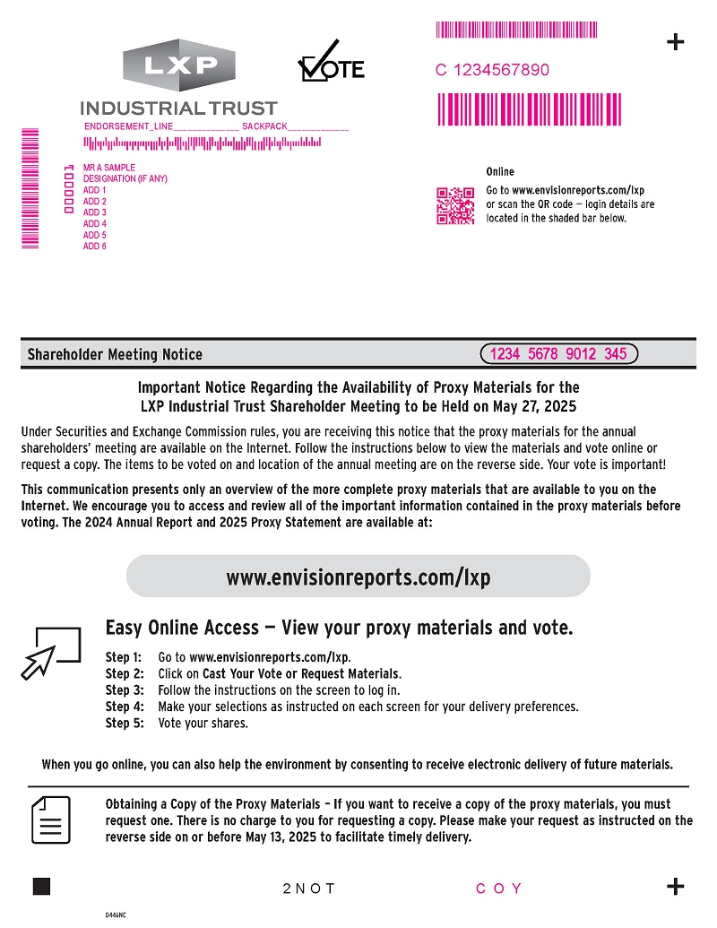 ENDORSEMENT_LINE______________ SACKPACK_____________ 000001 MR A SAMPLE DESIGNATION (IF ANY) ADD 1 ADD 2 ADD 3 ADD 4 ADD 5 ADD 6 C 1234567890 The Sample Company Online Go to www.envisionreports.com/lxp or scan the QR code — login details are located in the shaded bar below. Shareholder Meeting Notice 1234 5678 9012 345 Important Notice Regarding the Availability of Proxy Materials for the LXP Industrial Trust Shareholder Meeting to be Held on May 27, 2025 Under Securities and Exchange Commission rules, you are receiving this notice that the proxy materials for the annual shareholders’ meeting are available on the Internet. Follow the instructions below to view the materials and vote online or request a copy. The items to be voted on and location of the annual meeting are on the reverse side. Your vote is important! This communication presents only an overview of the more complete proxy materials that are available to you on the Internet. We encourage you to access and review all of the important information contained in the proxy materials before voting. The 2024 Annual Report and 2025 Proxy Statement are available at: www.envisionreports.com/lxp Easy Online Access — View your proxy materials and vote. Step 1: Go to www.envisionreports.com/lxp. Step 2: Click on Cast Your Vote or Request Materials. Step 3: Follow the instructions on the screen to log in. Step 4: Make your selections as instructed on each screen for your delivery preferences. Step 5: Vote your shares. When you go online, you can also help the environment by consenting to receive electronic delivery of future materials. Obtaining a Copy of the Proxy Materials – If you want to receive a copy of the proxy materials, you must request one. There is no charge to you for requesting a copy. Please make your request as instructed on the reverse side on or before May 13, 2025 to facilitate timely delivery. 2NOT COY 0446NC