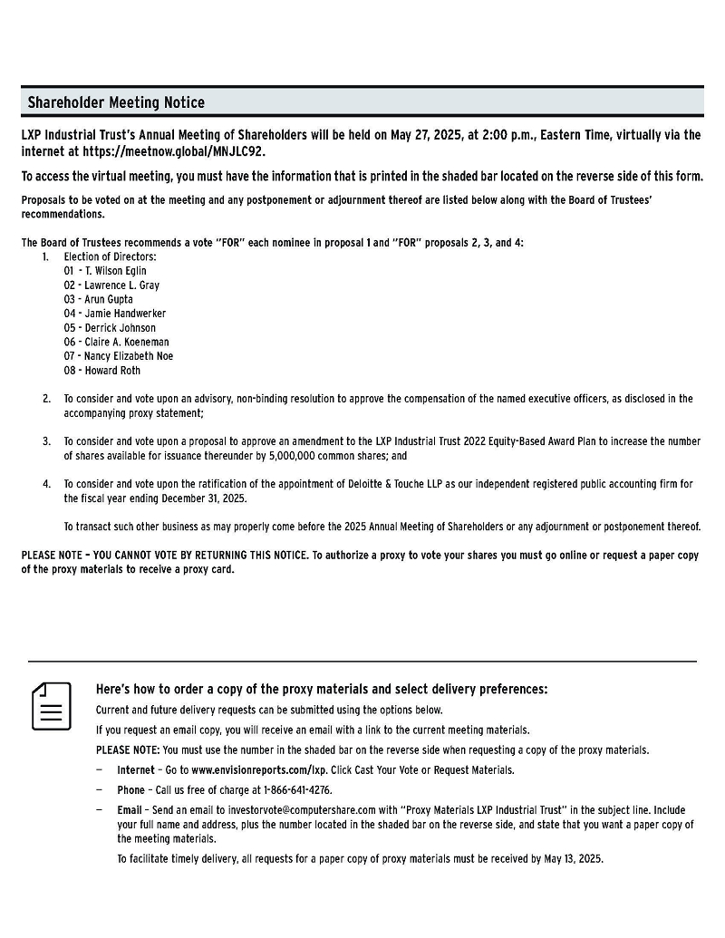 Shareholder Meeting Notice LXP Industrial Trust’s Annual Meeting of Shareholders will be held on May 27, 2025, at 2:00 p.m., Eastern Time, virtually via the internet at https://meetnow.global/MNJLC92. To access the virtual meeting, you must have the information that is printed in the shaded bar located on the reverse side of this form. Proposals to be voted on at the meeting and any postponement or adjournment thereof are listed below along with the Board of Trustees’ recommendations. The Board of Trustees recommends a vote “FOR” each nominee in proposal 1 and “FOR” proposals 2, 3, and 4: 1. Election of Directors: 01 - T. Wilson Eglin 02 - Lawrence L. Gray 03 - Arun Gupta 04 - Jamie Handwerker 05 - Derrick Johnson 06 - Claire A. Koeneman 07 - Nancy Elizabeth Noe 08 - Howard Roth 2. To consider and vote upon an advisory, non-binding resolution to approve the compensation of the named executive officers, as disclosed in the accompanying proxy statement; 3. To consider and vote upon a proposal to approve an amendment to the LXP Industrial Trust 2022 Equity-Based Award Plan to increase the number of shares available for issuance thereunder by 5,000,000 common shares; and 4. To consider and vote upon the ratification of the appointment of Deloitte & Touche LLP as our independent registered public accounting firm for the fiscal year ending December 31, 2025. To transact such other business as may properly come before the 2025 Annual Meeting of Shareholders or any adjournment or postponement thereof. PLEASE NOTE – YOU CANNOT VOTE BY RETURNING THIS NOTICE. To authorize a proxy to vote your shares you must go online or request a paper copy of the proxy materials to receive a proxy card. Here’s how to order a copy of the proxy materials and select delivery preferences: Current and future delivery requests can be submitted using the options below. If you request an email copy, you will receive an email with a link to the current meeting materials. PLEASE NOTE: You must use the number in the shaded bar on the reverse side when requesting a copy of the proxy materials. — Internet – Go to www.envisionreports.com/lxp. Click Cast Your Vote or Request Materials. — Phone – Call us free of charge at 1-866-641-4276. — Email – Send an email to investorvote@computershare.com with “Proxy Materials LXP Industrial Trust” in the subject line. Include your full name and address, plus the number located in the shaded bar on the reverse side, and state that you want a paper copy of the meeting materials. To facilitate timely delivery, all requests for a paper copy of proxy materials must be received by May 13, 2025.