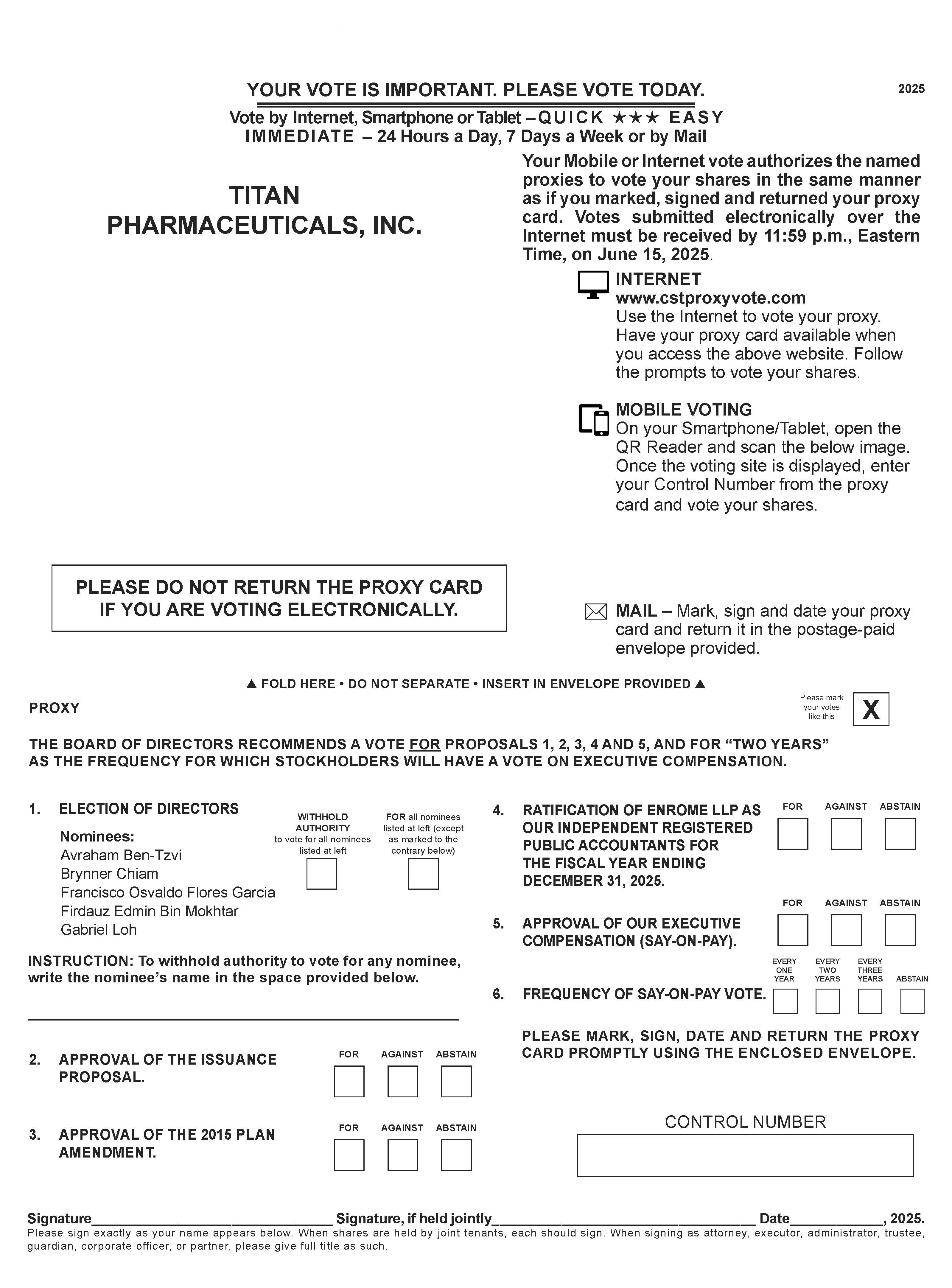 Copies of the Notice of Annual Stockholder Meeting, Proxy Statement and the 2024 10-K, as well as other materials filed by the Company with the SEC, are available without charge to stockholders on the Company’s corporate website at www.titanpharm.com or upon written request to the Company at Titan Pharmaceuticals, Inc., 10 East 53rd Street, Suite 3001, New York, New York 10022. You can elect to receive future annual reports, proxy statements and other proxy materials electronically by marking the appropriate box on your proxy card or vote instruction form or by following the instructions provided if you submit a proxy by fax or via the internet.