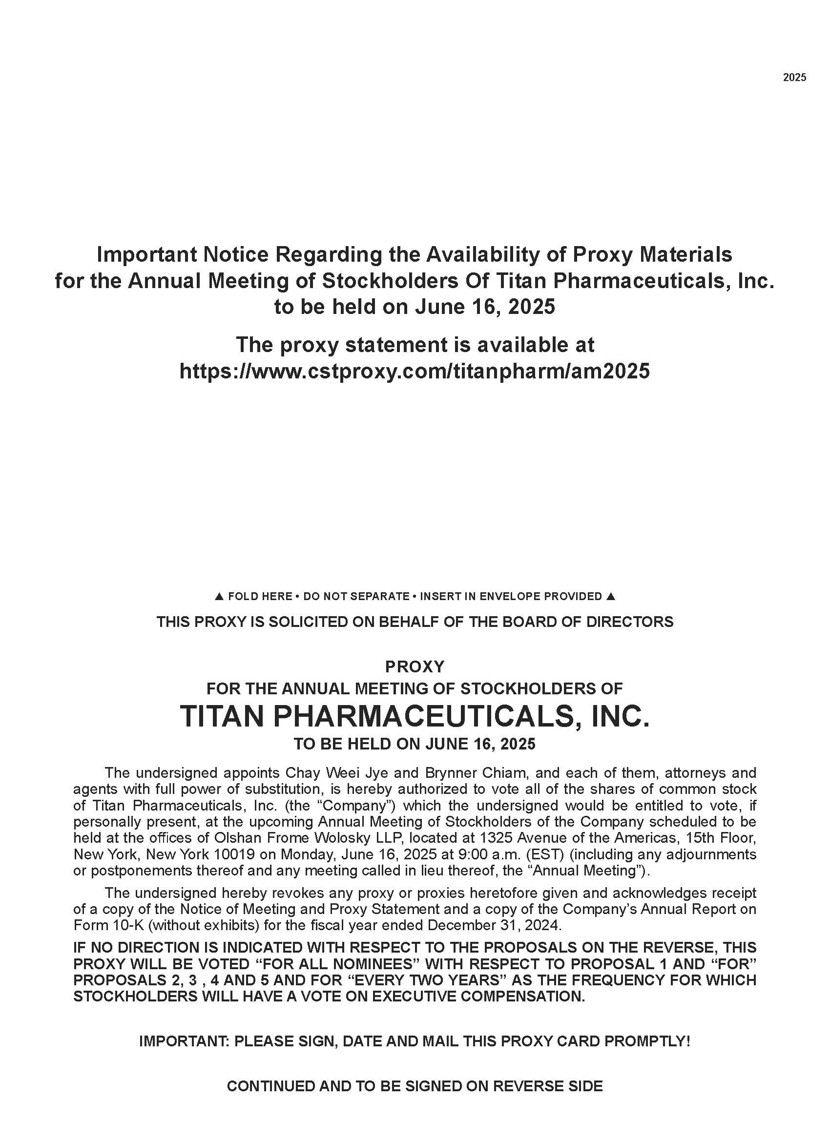As permitted by the “Notice and Access” rules of the Securities and Exchange Commission (the “SEC”), this Notice of Annual Stockholder Meeting, our Proxy Statement, a form of the proxy card and our Annual Reports on Form 10-K for the years ended December 31, 2024 and December 31, 2023 (the “Annual Reports”) are available online at https://ir.titanpharm.com/.